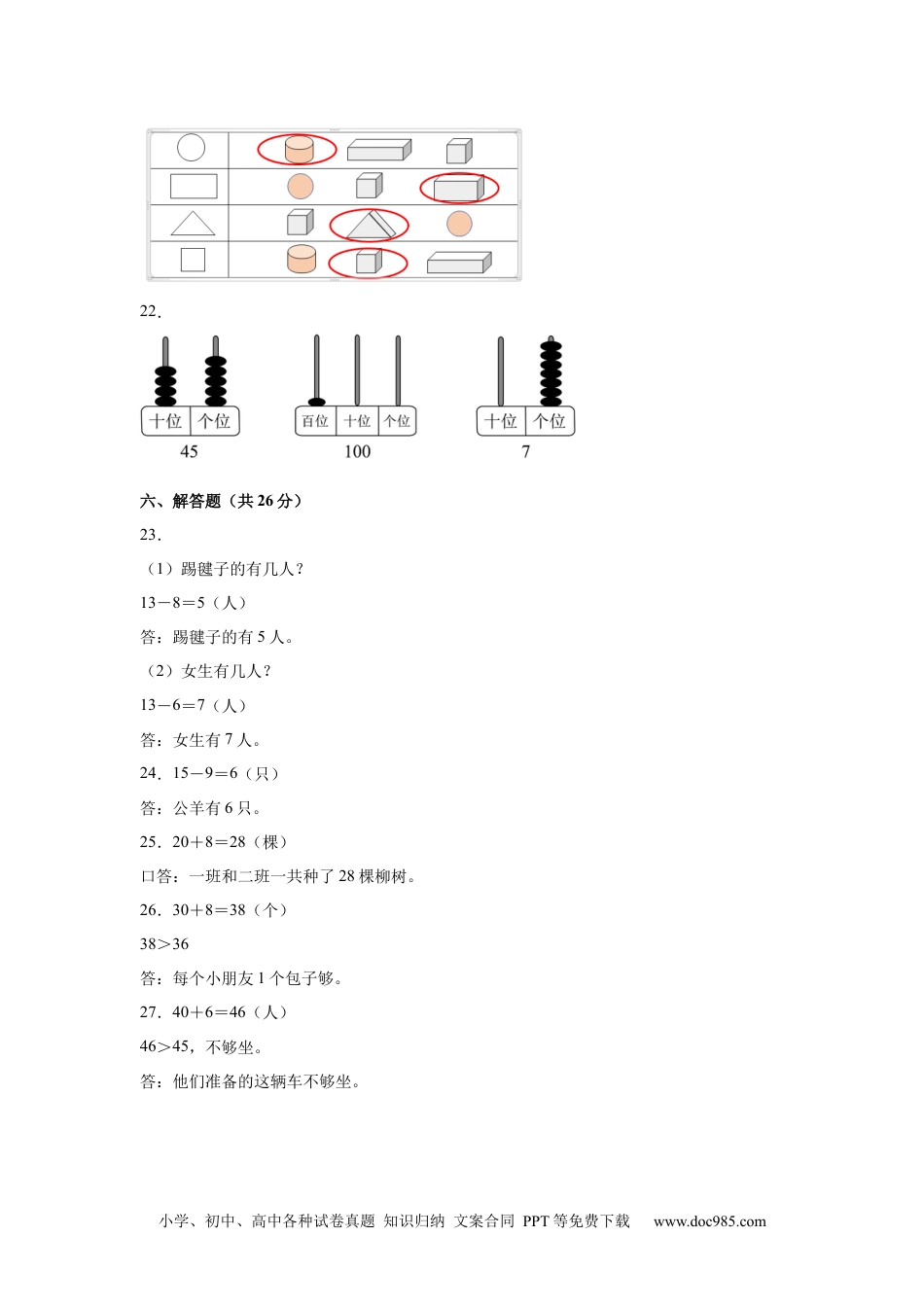 小学、初中、高中各种试卷真题知识归纳文案合同PPT等免费下载www.doc985.com参考答案一、填空题(共23分)1.24432.42100四十二一百3.5958604.60+5=655.476.67657.88.(1)171921(2)181410二、判断题(共8分)9.×10.√11.×12.√三、选择题(共8分)13.B14.B15.B16.B四、计算题(共25分)17.7;19;35;90;74;68;44;73;9;15。18.14-5=9(本)19.12-7=520.20+6=26五、作图题(共10分)21.小学、初中、高中各种试卷真题知识归纳文案合同PPT等免费下载www.doc985.com22.六、解答题(共26分)23.(1)踢毽子的有几人?13-8=5(人)答:踢毽子的有5人。(2)女生有几人?13-6=7(人)答:女生有7人。24.15-9=6(只)答:公羊有6只。25.20+8=28(棵)口答:一班和二班一共种了28棵柳树。26.30+8=38(个)38>36答:每个小朋友1个包子够。27.40+6=46(人)46>45,不够坐。答:他们准备的这辆车不够坐。