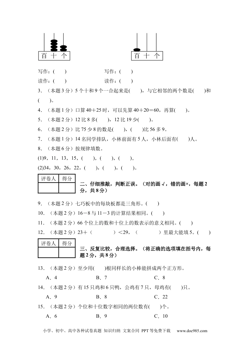 小学、初中、高中各种试卷真题知识归纳文案合同PPT等免费下载www.doc985.com保密★启用前2024-2025学年一年级数学下册期中素养测评卷【学易金卷·基础卷01】考试难度:;考试时间:60分钟;试卷总分:100分题号一二三四五六总分得分注意事项:1.答题前,填写好自己的姓名、班级、考号等信息,请写在答题卡规定的位置。2.判断题、选择题必须使用2B铅笔填涂答案,非判断、选择题必须使用黑色墨迹签字笔或钢笔答题,请将答案正确填写在答题卡规定的位置上。3.所有题目必须在答题卡上作答,在试卷上作答无效。4.考试结束后将试卷和答题卡一并交回。5.测试范围:第1~4单元。【第一部分】基础知识与基本能力评卷人得分一、用心思考,正确填写。(每空1分,共23分)1.(本题4分)数一数。有()个正方形,有()个长方形,有()个三角形,有()个圆。2.(本题4分)看计数器填写。小学、初中、高中各种试卷真题知识归纳文案合同PPT等免费下载www.doc985.com写作:()写作:()读作:()读作:()3.(本题3分)5个十和9个一合起来是(),与它相邻的两个数是()和()。4.(本题1分)口算40+25时,可以先算40+20=60,再算()。5.(本题2分)12比8多(),12比19少()。6.(本题2分)比75少8的数是(),()比56多9。7.(本题1分)14名同学排队,小林前面有5人,小林后面有()人。8.(本题6分)按规律填数。(1)9,11,13,15,(),(),()。(2)34,30,26,22,(),(),()。评卷人得分二、仔细推敲,判断正误。(对的画√,错的画×,每题2分,共8分)9.(本题2分)七巧板中的每块板都是三角形。()10.(本题2分)16-8与11-3的计算结果相同。()11.(本题2分)66个位上的数和十位上的数表示的意义相同。()12.(本题2分)23+()<29,()里最大能填5。()评卷人得分三、反复比较,合理选择。(将正确的选项填在括号内,每题2分,共8分)13.(本题2分)至少用()根同样长的小棒能拼成两个正方形。A.4B.7C.814.(本题2分)有15只鸡和6只鸭,公鸡有7只,母鸡有()只。A.9B.8C.2215.(本题2分)个位和十位数字相同的两位数有()个。A.6B.9C.10小学、初中、高中各种试卷真题知识归纳文案合同PPT等免费下载www.doc985.com16.(本题2分)小马在计算56+40时,把40看成了4,接下来(),能使结果计算正确。A.再加10B.再加36C.再减36【第二部分】基础运算与基本技能评卷人得分四、一丝不苟,细心计算。(共25分)17.(本题10分)直接写得数。15-8=26-7=5+30=30+60=24+50=59+9=64-20=78-5=16-9+2=45-(38-8)=18.(本题5分)看图列式。(本)19.(本题5分)看图列式计算。(个)20.(本题5分)看图列式计算。小学、初中、高中各种试卷真题知识归纳文案合同PPT等免费下载www.doc985.com(个)评卷人得分五、手脑并用,实践操作。(共10分)21.(本题5分)用哪个物体可以画出左边的图形?请把它圈起来。22.(本题5分)看数画算珠。【第三部分】生活实际与综合应用评卷人得分六、走进生活,解决问题。(共26分)23.(本题5分)(教材变式)一共有13个小朋友。小学、初中、高中各种试卷真题知识归纳文案合同PPT等免费下载www.doc985.com(1)跳绳的有8人,踢毽子的有几人?(人)(2)男生有6人,女生有几人?(人)24.(本题5分)小军家养了15只羊和10头牛。母羊有9只,公羊有几只?(只)25.(本题5分)一班种了20棵柳树,二班种了8棵柳树和16棵杨树,一班和二班一共种了多少棵柳树?(棵)口答:一班和二班一共种了棵柳树。26.(本题5分)每个小朋友1个包子。够吗?()答:每个小朋友1个包子()。27.(本题6分)某小学三年级有40名学生和6名老师去参观科技馆。他们准小学、初中、高中各种试卷真题知识归纳文案合同PPT等免费下载www.doc985.com备的这辆车够坐吗?=(人)45够坐不够坐(画“√”)
