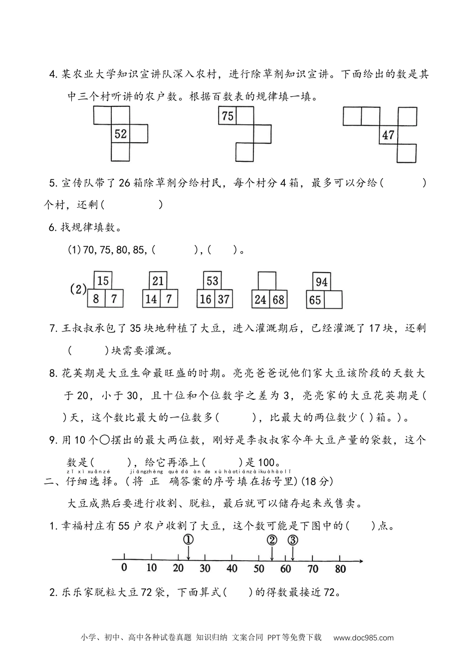 小学、初中、高中各种试卷真题知识归纳文案合同PPT等免费下载www.doc985.com期末综合过关验收卷大豆是我国重要的粮食作物之一,被称为“豆中之王”,它常被用来做豆制品,榨取豆油等。一、快乐填空。(每空1分,共32分)大豆的一生从选种开始,要经历萌发、出芽、开花、结荚和成熟等过程。1.李伯伯挑选的3种大豆种子的粒数可以分别用下图表示,请你写一写。2.一个研究所在一块正方形的试验田上分区种植了7种不同的大豆,如右图所示。选择其中的图形拼成一个三角形,可以选择图形();拼成一个平行四边形,可以选择图形()。(填序号,每空写出一种拼法即可)3.张爷爷购买下面两种化肥分别需要多少钱?写一写。()元()角()元()角,太小学、初中、高中各种试卷真题知识归纳文案合同PPT等免费下载www.doc985.com4.某农业大学知识宣讲队深入农村,进行除草剂知识宣讲。下面给出的数是其中三个村听讲的农户数。根据百数表的规律填一填。5.宣传队带了26箱除草剂分给村民,每个村分4箱,最多可以分给()个村,还剩()6.找规律填数。(1)70,75,80,85,(),()。7.王叔叔承包了35块地种植了大豆,进入灌溉期后,已经灌溉了17块,还剩()块需要灌溉。8.花荚期是大豆生命最旺盛的时期。亮亮爸爸说他们家大豆该阶段的天数大于20,小于30,且十位和个位数字之差为3,亮亮家的大豆花英期是()天,这个数比最大的一位数多(),比最大的两位数少()箱。)。9.用10个○摆出的最大两位数,刚好是李叔叔家今年大豆产量的袋数,这个数是(),给它再添上()是100。二、zǐ仔xì细xuǎn选zé择。(jiāng将zhèng正què确dá答àn案de的xù序hào号tián填zài在kuò括hào号lǐ里)(18分)大豆成熟后要进行收割、脱粒,最后就可以储存起来或售卖。1.幸福村庄有55户农户收割了大豆,这个数可能是下图中的()点。2.乐乐家脱粒大豆72袋,下面算式()的得数最接近72。小学、初中、高中各种试卷真题知识归纳文案合同PPT等免费下载www.doc985.com①69+5②93-15③54+373.齐齐的爸爸晾晒的大豆地面形状近似一个长方形,如下图所示,()号框中的图形可以拼成这个长方形。4.亮亮家将晾晒的大豆装袋,一共装了31袋,梅梅家收获的袋数比亮亮家少得多,丽丽家收获的袋数比亮亮家多一些。梅梅家可能收获了()袋,丽丽家可能收获了()袋。①8②29③365.现在收大豆基本都是使用收割机,李奶奶家需要给车主38元,王爷爷家需要给车主53元,王爷爷家比李奶奶家多给()元。①25②15③91三、qiǎo巧miào妙jì计suàn算。(20分)1.直接写出得数。(11分)13-9=23+5=40-7=6+56=45+32=37-13=14-8=32+24=7+4-2=20+18-34=50-4+42=2.列竖式计算。(9分)9+53=47+33=74-26=四、jiě解jué决wèn问tí题。(30分)小学、初中、高中各种试卷真题知识归纳文案合同PPT等免费下载www.doc985.com大豆经历磨、煮可以加工成豆浆、豆腐等食物。1.某早餐店做了15碗豆腐脑,卖掉了7碗豆腐脑,还剩下多少碗豆腐脑?(5分)2.大豆是做豆腐的原料,下面是某豆腐坊三个小组今日做豆腐的情况:(1)1号小组做的豆腐是多少块?(5分)(2)3号小组做的豆腐是多少块?(5分)3.下面是李记饭店用豆腐制作的几道菜肴。(1)红红点了一份,付了一张,找回7元,则一份多少钱?(5分)(2)一份(比一份便宜25元,一份多少钱?(5分)小学、初中、高中各种试卷真题知识归纳文案合同PPT等免费下载www.doc985.com(3)亮亮一家点了两道菜正好花了50元,他们点了哪两道菜?(5分)xuǎn选zuò做tí题。(10分)三个好朋友同一站上车,妙妙比甜甜少乘坐几站?期末综合过关验收卷一、1.4437692.①②③⑤(答案不唯一)3.2656135.626.(1)9095(2)92297.188.2516749.919小学、初中、高中各种试卷真题知识归纳文案合同PPT等免费下载www.doc985.com二、1.②2.①3.②4.①③5.②三、1.4283362772465694882.628048四、1.15-7=8(碗)2.(1)62+9=71(块)(2)71-24=47(块)3.(1)20-7=13(元)(2)12+25=37(元)(3)13+37=50(元)他们点了一份娃娃菜炖豆腐和一份鲫鱼炖豆腐。选做题20-9=11(站)