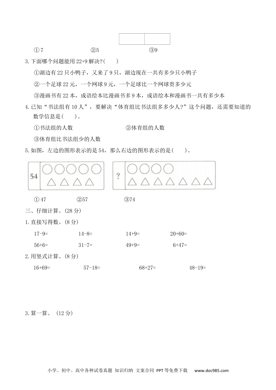 小学、初中、高中各种试卷真题知识归纳文案合同PPT等免费下载www.doc985.com期末素养过关B卷时间:60分钟满分:100+10分一、认真填空。(每空1分,共25分)1.先在□里填上合适的数,再填一填。()号旗比79大一些,②号旗最接近的整十数是()。2.拼成一个□,需要()个同样的;至少要()个同样的就可以拼成一个大正方形。3.1元=()角50角=()元35角=()元()角6元9角=()角4.()比36少20,36比()少20。5.王老师在体育用品商店买了3筒羽毛球,每筒12个,一共买了()个羽毛球。6.在里填上“◯>”“<”或“=”。23+38516◯角3分◯63分54-2622+16◯75-502517-867-3035+752|6◯◯◯7.5+=11,=8,=(),¿()。8.算式26-★=20+★中的★表示的是同一个数,这个数是()。二、仔细选择。(将正确答案的序号填在括号里)(10分)2.爷爷今年72岁了,爷爷的年龄可以用()个“”在图中摆出来。◯十位个位1、小学、初中、高中各种试卷真题知识归纳文案合同PPT等免费下载www.doc985.com①7②5③93.下面哪个问题能用22+9解决?()①湖边有22只小鸭子,又来了9只,湖边现在一共有多少只小鸭子②一个足球22元,一个网球9元,一个足球比一个网球贵多少元③漫画书有22本,成语绘本比漫画书多9本,成语绘本和漫画书一共有多少本4.已知“书法组有10人”,要解决“体育组比书法组多多少人?”这个问题,还需要知道的数学信息是()。①书法组的人数②体育组的人数③体育组比书法组少的人数5.如图,左边的图形表示的是54,那么右边的图形表示的是()。①47②57③74三、仔细计算。(28分)1.直接写得数。(8分)17-9=14-8=14+9=20+60=56+6=31-7=49+9=6+47=2.用竖式计算。(8分)16+69=57-18=68+27=48-19=3.算一算。(12分)小学、初中、高中各种试卷真题知识归纳文案合同PPT等免费下载www.doc985.com四、按要求做题。(11分)1.根据百数表填数。(7分)2.数字“9”傲慢地对数字“1”说:“我比你大。”数字“1”很不服气。你有办法让数字“1”比数字“9”大吗?写一写。(4分)五、解决问题。(26分)1.你知道《古对今》比《静夜思》多多少个字吗?(不含标点)(5分)2.现在有多少个同学在植树?(5分)小学、初中、高中各种试卷真题知识归纳文案合同PPT等免费下载www.doc985.com3.端午节有赛龙舟、吃粽子等习俗。奶奶包了蛋黄粽和豆沙粽,其中有20个蛋黄粽,豆沙粽比蛋黄粽少14个。(1)奶奶包了多少个豆沙粽?(4分)(2)奶奶一共包了多少个粽子?(4分)4.套圈游戏。(1)笑笑可能套中哪两个玩具?(4分)拓展提升小阳原来有多少张邮票?(10分)小学、初中、高中各种试卷真题知识归纳文案合同PPT等免费下载www.doc985.com参考答案:
