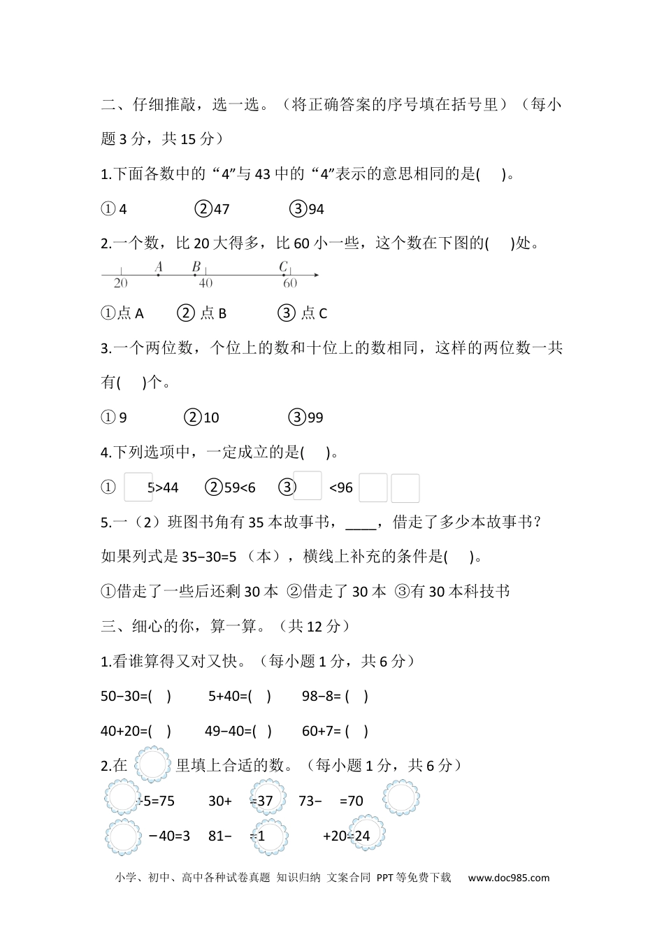 小学、初中、高中各种试卷真题知识归纳文案合同PPT等免费下载www.doc985.com第三单元综合素养测评B卷一、认真审题,填一填。(每空1分,共24分)1.共享单车作为一种低碳、时尚、绿色的出行方式,已经成为市民出行的“新宠”。某共享单车点停放了48辆共享单车。48是由()个十和()个一组成的,48后面的第5个数是()。2.6个一和9个十组成的数是(),再添上()个一是100。3.甲骨文是迄今为止中国发现的年代最早的成熟文字系统。在甲骨文中“”表示1,“”表示10。下面的图各表示多少?()()()4.一个两位数,个位上的数是最大的一位数,十位上的数与个位上的数相差4,这个数是()。5.根据百数表填数。6.(1)圆中一共有()个数,最小的数是(),最大的数是()。(2)正方形中最大的数是(),涂色部分比它小得多的数是()。(3)大三角形中,十位上数字和个位上数字相同的数是(),和它最接近的整十数是()。小学、初中、高中各种试卷真题知识归纳文案合同PPT等免费下载www.doc985.com二、仔细推敲,选一选。(将正确答案的序号填在括号里)(每小题3分,共15分)1.下面各数中的“4”与43中的“4”表示的意思相同的是()。①4②47③942.一个数,比20大得多,比60小一些,这个数在下图的()处。①点A②点B③点C3.一个两位数,个位上的数和十位上的数相同,这样的两位数一共有()个。①9②10③994.下列选项中,一定成立的是()。①5>44②59<6③<965.一(2)班图书角有35本故事书,____,借走了多少本故事书?如果列式是35−30=5(本),横线上补充的条件是()。①借走了一些后还剩30本②借走了30本③有30本科技书三、细心的你,算一算。(共12分)1.看谁算得又对又快。(每小题1分,共6分)50−30=()5+40=()98−8=()40+20=()49−40=()60+7=()2.在里填上合适的数。(每小题1分,共6分)+5=7530+=3773−=70−40=381−=1+20=24小学、初中、高中各种试卷真题知识归纳文案合同PPT等免费下载www.doc985.com四、照样子,用你喜欢的方式表示左侧的数。(8分)五、看图列式计算。(第1题8分,第2题4分,共12分)1.2.(元)六、聪明的你,答一答。(共29分)1.28个苹果,6个装一袋,可以装满多少袋?先圈一圈,再填一填。(5分)可以装满袋。小学、初中、高中各种试卷真题知识归纳文案合同PPT等免费下载www.doc985.com2.森林里举办音乐节,25位表演者准备前往音乐节现场,若乘坐下面这两辆车,座位够吗?请说明理由。(5分)>够不够(画“√”)3.天天妈妈要在直播间给天天买一条78元的牛仔裤,用直播间抢到的优惠券抵扣后,妈妈还要付多少钱?(5分)4.典典和梦梦玩投沙包游戏。(1)梦梦投了多少分?(4分)(2)典典和梦梦一共投了多少分?(4分)小学、初中、高中各种试卷真题知识归纳文案合同PPT等免费下载www.doc985.com5.选择正确的信息填空,并列式计算。(填序号)(6分)蓝蓝买了48颗蓝莓。____,蓝蓝送出多少颗蓝莓?挑战题:天才的你,试一试。(10分)明明有一些铅笔,数量在2025∼支之间。小学、初中、高中各种试卷真题知识归纳文案合同PPT等免费下载www.doc985.com参考答案一、1.48532.9643.5445634.595.43544958606952636.(1)610100(2)1005(3)3330二、1.②2.③3.①4.②5.①三、1.2.四、五1.2.小学、初中、高中各种试卷真题知识归纳文案合同PPT等免费下载www.doc985.com六、1.42.20+6=26(位)26>25够√3.78>6878−8=70(元)4.(1)60+4=64(分)(2)30+64=94(分)5.②48-8=40(颗)挑战题:5+5+5+5+2=22(支)