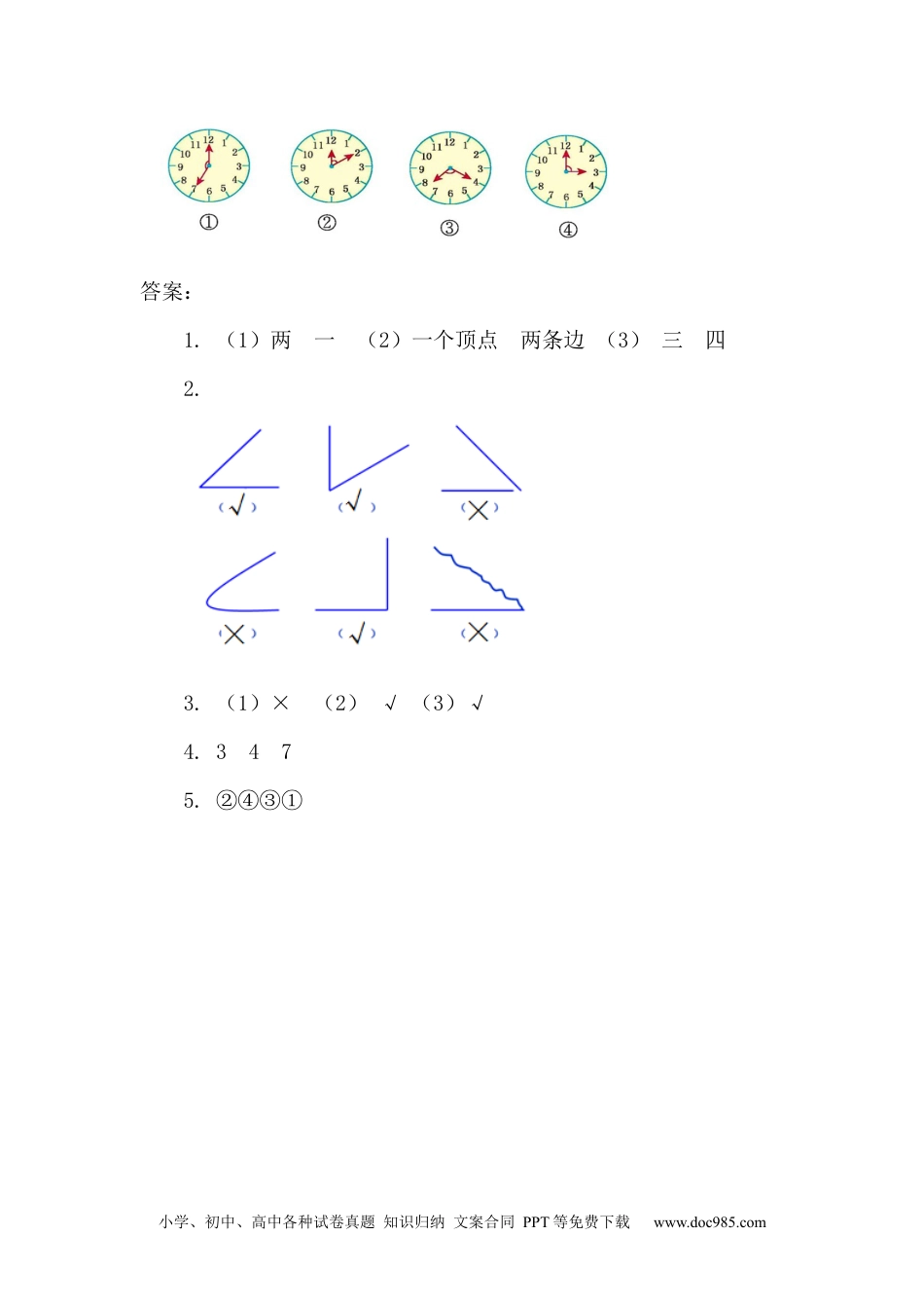 小学、初中、高中各种试卷真题知识归纳文案合同PPT等免费下载www.doc985.com3.1角的初步认识1.填空。(1)一个角有()条边,()个顶点。(2)画角时先画(),再画()。(3)三角形有()个角,正方形有()个角。2.下图中,是角的在括号里打√,不是的打×。3.判断。⑴边越长,角就越大。()⑵角的大小与边的长短无关。()⑶一个角只有两条边,一个顶点。()4.数一数,下图中各有几个角。()()()5.把下面这四个角按从小到大的顺序排一排。(填序号)小学、初中、高中各种试卷真题知识归纳文案合同PPT等免费下载www.doc985.com答案:1.(1)两一(2)一个顶点两条边(3)三四2.3.(1)×(2)√(3)√4.3475.②④③①