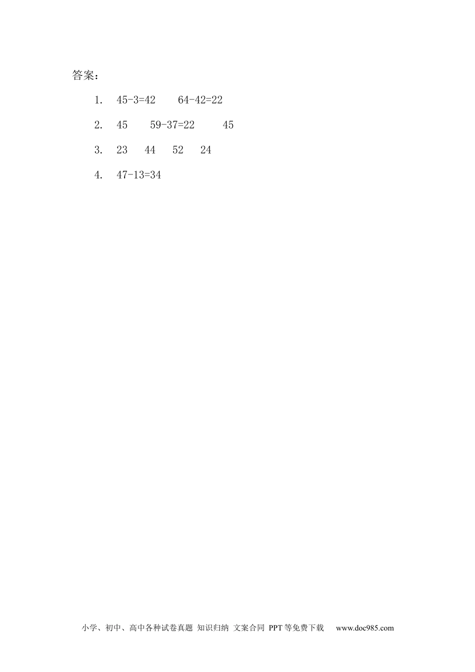 小学、初中、高中各种试卷真题知识归纳文案合同PPT等免费下载www.doc985.com2.3不退位减1.看图列算式。2.改错。3.列竖式计算。35-12=86-42=98-46=65-41=4.一艘玩具轮船比一辆玩具坦克贵多少元钱?小学、初中、高中各种试卷真题知识归纳文案合同PPT等免费下载www.doc985.com答案:1.45-3=4264-42=222.4559-37=22453.234452244.47-13=34