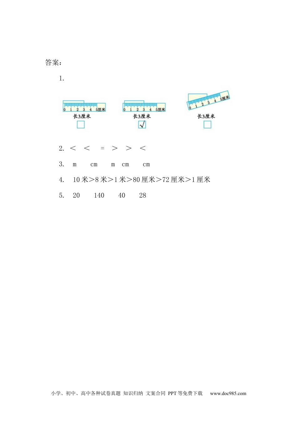 小学、初中、高中各种试卷真题知识归纳文案合同PPT等免费下载www.doc985.com1.1认识厘米和米1.在正确的测量方法下面打√。2.在○里填上“>”“<”或“=”。4厘米○4米10厘米○9米100厘米○1米2米○20厘米1米○90厘米99米○100米3.在()里填上cm或m。一棵树高7()围巾长80()跳绳长1()60()杯子高15()4.从大到小排一排。8米72厘米1米80厘米1厘米10米5.算一算。1米-80厘米=()厘米1米+40厘米=()厘米48米-8米=()米35厘米-7厘米=()厘米小学、初中、高中各种试卷真题知识归纳文案合同PPT等免费下载www.doc985.com答案:1.2.<<=>><3.mcmmcmcm4.10米>8米>1米>80厘米>72厘米>1厘米5.201404028