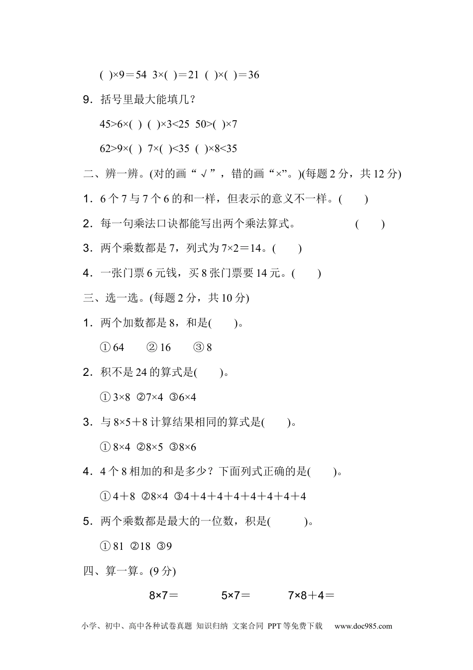 小学、初中、高中各种试卷真题知识归纳文案合同PPT等免费下载www.doc985.com第六单元过关检测卷一、填一填。(每空1分,共42分)1.7+7+7+7写成乘法算式是(),表示有()个()相加。2.把口诀补充完整。四八()二九()七七()六()五十四()八二十四五()四十3.根据口诀“七八五十六”写出两道乘法算式()、()。4.5.3个9相加的和是();6乘8的积是()。6.买2个皮球要()元,买7根跳绳要()元。7.在里填“>”“<”或“=”。9×6502×8203×9305×87×68+98×94×96×68.在括号里填合适的数。()×9=278×()=64()×()=188×()=484×()=32()×()=24小学、初中、高中各种试卷真题知识归纳文案合同PPT等免费下载www.doc985.com()×9=543×()=21()×()=369.括号里最大能填几?45>6×()()×3<2550>()×762>9×()7×()<35()×8<35二、辨一辨。(对的画“√”,错的画“×”。)(每题2分,共12分)1.6个7与7个6的和一样,但表示的意义不一样。()2.每一句乘法口诀都能写出两个乘法算式。()3.两个乘数都是7,列式为7×2=14。()4.一张门票6元钱,买8张门票要14元。()三、选一选。(每题2分,共10分)1.两个加数都是8,和是()。①64②16③82.积不是24的算式是()。①3×87×46×4②③3.与8×5+8计算结果相同的算式是()。①8×48×58×6②③4.4个8相加的和是多少?下面列式正确的是()。①4+88×44②③+4+4+4+4+4+4+45.两个乘数都是最大的一位数,积是()。①81189②③四、算一算。(9分)8×7=5×7=7×8+4=小学、初中、高中各种试卷真题知识归纳文案合同PPT等免费下载www.doc985.com9×8=3×9=9×7-5=3×7=5×6=8×8+16=五、看图列式。(每题4分,共12分)1.2.3.六、解决问题。(1题4分,2题6分,3题9分,共19分)1.合理饮水。小学、初中、高中各种试卷真题知识归纳文案合同PPT等免费下载www.doc985.com2.学校买来一些菊花和牡丹花。菊花有多少盆?牡丹花有多少盆?3.校园餐厅部分特色菜零利润出售。(1)买1份木须肉和1份地三鲜,需要多少钱?(2)买6份鱼香肉丝一共要花多少钱?(3)你还能提出其他用乘法解决的问题并解答吗?小学、初中、高中各种试卷真题知识归纳文案合同PPT等免费下载www.doc985.com答案一、1.4×7=28或7×4=28472.三十二十八四十九九三八3.7×8=568×7=564.36775.27486.16357.><<<<=8.382968386766(第3、6、9个式子答案不唯一)9.787644二、1.√2.×3.×4.×三、1.②2.②3.③4.②5.①四、563560722758213080五、1.6×8=48(颗)2.5×7+2=37(枝)3.9×3=27(米)六、1.6×7=42(杯)2.菊花:3×9=27(盆)牡丹花:27+8=35(盆)3.(1)8+6=14(元)(2)6×9=54(元)(3)买7份宫保鸡丁一共要花多少钱?7×7=49(元)(答案不唯一)