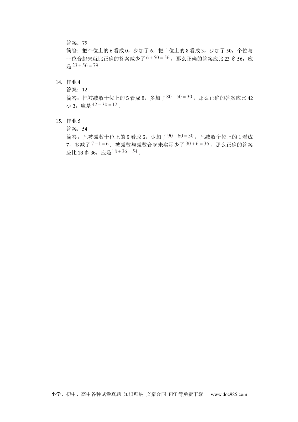 小学、初中、高中各种试卷真题知识归纳文案合同PPT等免费下载www.doc985.com第十九中求解讲错1.例题1答案:(1)72;(2)106详解:(1)把个位上的0看成6,多加了6,那么正确的答案应比78少6,应是.(2)把十位上的8看成3,少加了50,那么正确的答案应比56多50,应是.2.例题2答案:72详解:把个位上的6看成9,多加了3,把十位上的3看成5,多加了20,个位与十位合起来就比正确的答案多加了,那么正确的答案应比95少23,应是.3.例题3答案:171详解:把个位上的2看成5,多加了3,把十位上的9看成6,少加了30,个位与十位合起来就比正确的答案减少了,那么正确的答案应比144多27,应是.4.例题4答案:(1)33;(2)42详解:(1)把被减数十位上的6看成9,多加了,那么正确的答案应比63少30,应是.(2)把减数个位上的3看成5,多减了,那么正确的答案应比40多2,应是.5.例题5答案:69详解:把被减数十位上的6看成9,多加了,把减数个位上的3看成5,多减了.被减数与减数合起来实际多了,那么正确的答案应比97少28,应是.6.例题6答案:5详解:根据被除数=除数×商+余数,得出错误的被除数是.把53个位与十位上的数字互换,得出正确的被除数是35,,那么正确的商应该是5.小学、初中、高中各种试卷真题知识归纳文案合同PPT等免费下载www.doc985.com7.练习1答案:(1)59;(2)62简答:(1)把个位上的7看成1,少加了6,那么正确的答案应比53多6,应是.(2)把十位上的6看成9,多加了30,那么正确的答案应比92少30,应是.8.练习2答案:183简答:把个位上的9看成0,少加了9,把十位上的8看成3,少加了50,个位与十位合起来就比正确的答案减少了,那么正确的答案应比124多59,应是.9.练习3答案:65简答:把个位上的5看成3,少加了2,把十位上的1看成7,多加了60,个位与十位合起来就比正确的答案多加了,那么正确的答案应比123少58,应是.10.练习4答案:(1)20;(2)22简答:(1)把被减数个位上的8看成3,少加了,那么正确的答案应比15多5,应是.(2)把减数十位上的7看成1,少减了,那么正确的答案应比82少60,应是.11.作业1答案:94简答:把十位上的6看成9,多加了30,那么正确的答案应比124少30,应是.12.作业2答案:35简答:把个位上的2看成5,多加了3,把十位上的1看成7,多加了60,个位与十位合起来就比正确的答案多加了,那么正确的答案应比98少63,应是.13.作业3小学、初中、高中各种试卷真题知识归纳文案合同PPT等免费下载www.doc985.com答案:79简答:把个位上的6看成0,少加了6,把十位上的8看成3,少加了50,个位与十位合起来就比正确的答案减少了,那么正确的答案应比23多56,应是.14.作业4答案:12简答:把被减数十位上的5看成8,多加了,那么正确的答案应比42少3,应是.15.作业5答案:54简答:把被减数十位上的9看成6,少加了,把减数个位上的1看成7,多减了.被减数与减数合起来实际少了,那么正确的答案应比18多36,应是.