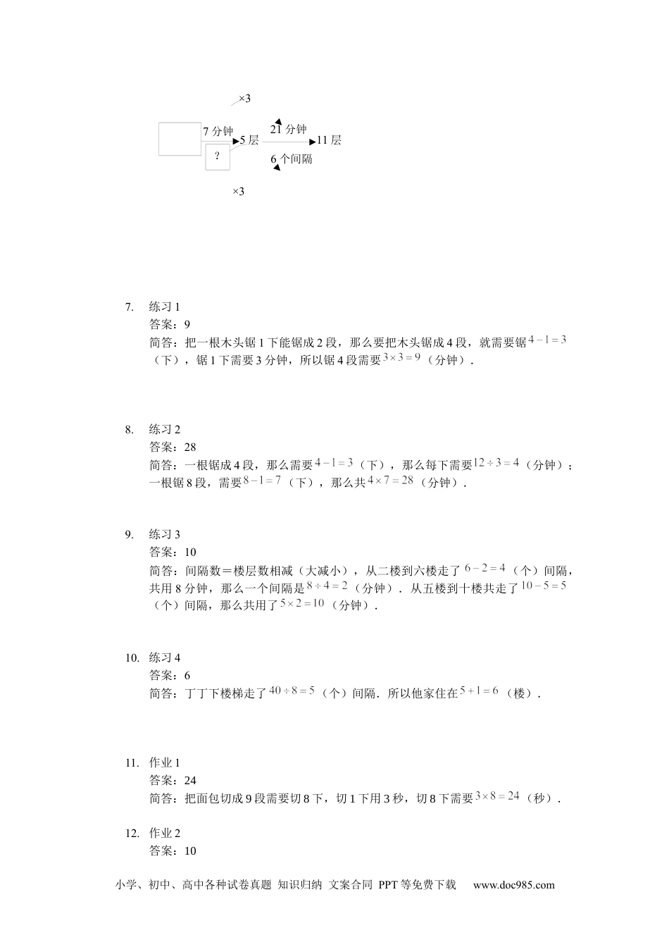 小学、初中、高中各种试卷真题知识归纳文案合同PPT等免费下载www.doc985.com第十八隔趣讲间题1.例题1答案:28详解:把一根木头锯1下能锯成2段,那么要把木头锯成8段,就需要锯8-1=7(下),锯1下需要4分钟,所以锯8段需要(分钟).2.例题2答案:20详解:每根锯成5段,那么需要(下),两根是(下),那么每下需要(秒);一根锯3段,需要(下),那么两根是(下),共(秒).3.例题3答案:9详解:间隔数=楼层数相减(大减小),从一楼到三楼走了(个)间隔,共用6分钟,那么一个间隔是(分钟).从六楼到九楼共走了(个)间隔,那么共用了(分钟).4.例题4答案:6详解:从一楼到二楼是爬了1个间隔,用了10秒.亮亮从一楼走到家用了50秒则亮亮共爬了(个)间隔.所以他家住在(楼).5.例题5答案:8详解:间隔数=楼层数相减(大减小),从一楼到四楼是3个间隔,一共走了12分钟,那么一个间隔是(分钟),16分钟可以爬(个)间隔.从4楼往上爬4个间隔就应该到了(楼),所以甜甜家住在8楼.6.例题6答案:3详解:5层到11层有(个)间隔,用时21分钟;因为从家到5层用7分钟,,所以从家到5层应有(个)间隔,所以虎虎家在(楼).画图如下:5层11层21分钟7分钟×36个间隔?×3小学、初中、高中各种试卷真题知识归纳文案合同PPT等免费下载www.doc985.com7.练习1答案:9简答:把一根木头锯1下能锯成2段,那么要把木头锯成4段,就需要锯(下),锯1下需要3分钟,所以锯4段需要(分钟).8.练习2答案:28简答:一根锯成4段,那么需要(下),那么每下需要(分钟);一根锯8段,需要(下),那么共(分钟).9.练习3答案:10简答:间隔数=楼层数相减(大减小),从二楼到六楼走了(个)间隔,共用8分钟,那么一个间隔是(分钟).从五楼到十楼共走了(个)间隔,那么共用了(分钟).10.练习4答案:6简答:丁丁下楼梯走了(个)间隔.所以他家住在(楼).11.作业1答案:24简答:把面包切成9段需要切8下,切1下用3秒,切8下需要(秒).12.作业2答案:10小学、初中、高中各种试卷真题知识归纳文案合同PPT等免费下载www.doc985.com简答:把木头锯成5段需要锯4下,1下是分钟,把木头锯3段需要2下,需要分钟.13.作业3答案:18简答:从一楼走到二楼用3分钟,也就是一个间隔3分钟,从一楼到七楼走了(个)间隔,那么共需要(分钟).14.作业4答案:9简答:童童从家到一楼共走了(个)间隔,那么童童家应该是住在(楼).15.作业5答案:8简答:从一楼到三楼,一共走了(个)间隔,一个间隔就是(分钟).又爬了15分钟,那么应该是爬了(个)间隔,那么从三楼往上爬了5个间隔,应该到了(楼).