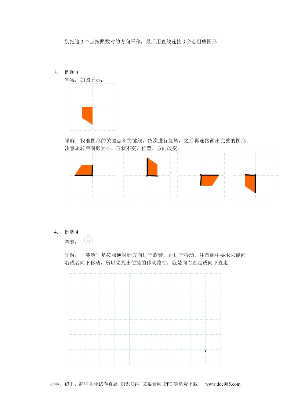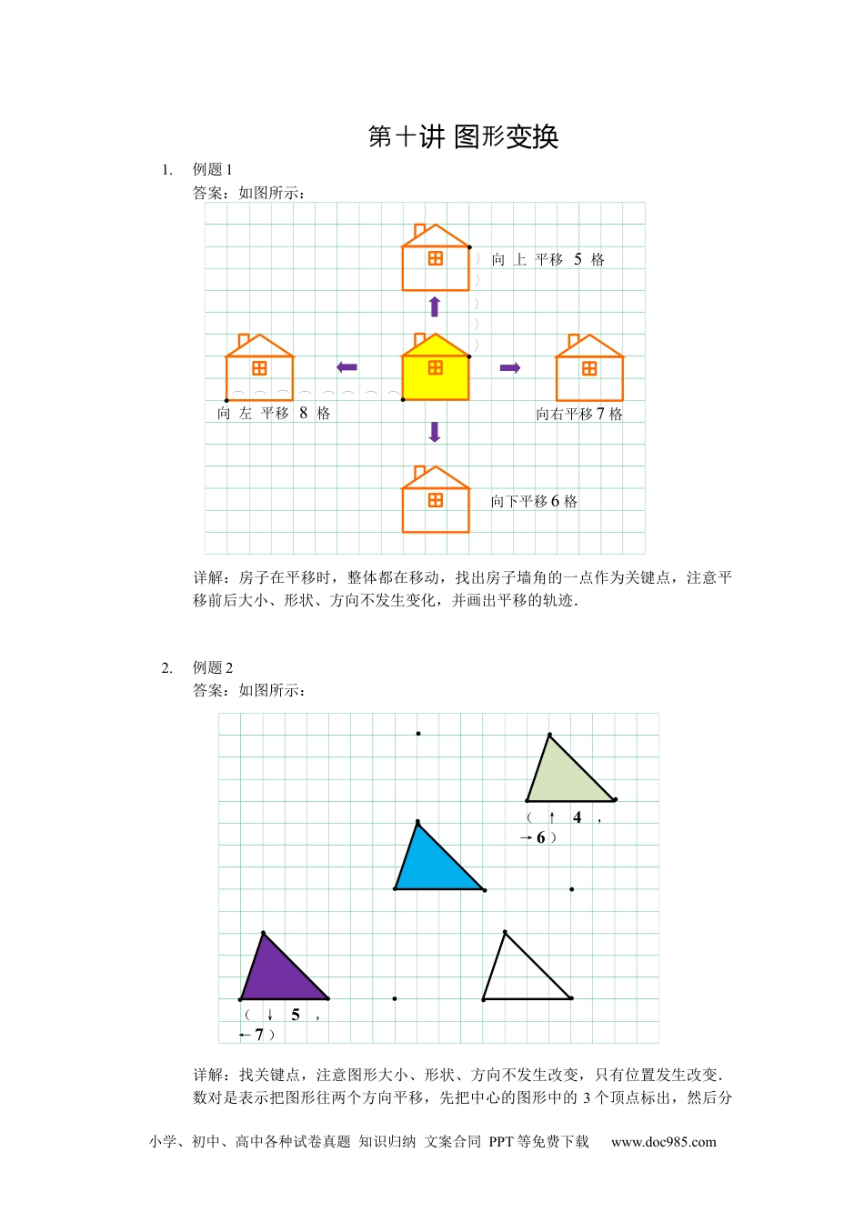 向右平移7格向下平移6格向上平移5格向左平移8格(↑4,→6)(↓5,←7)小学、初中、高中各种试卷真题知识归纳文案合同PPT等免费下载www.doc985.com第十形讲图变换1.例题1答案:如图所示:详解:房子在平移时,整体都在移动,找出房子墙角的一点作为关键点,注意平移前后大小、形状、方向不发生变化,并画出平移的轨迹.2.例题2答案:如图所示:详解:找关键点,注意图形大小、形状、方向不发生改变,只有位置发生改变.数对是表示把图形往两个方向平移,先把中心的图形中的3个顶点标出,然后分?小学、初中、高中各种试卷真题知识归纳文案合同PPT等免费下载www.doc985.com别把这3个点按照数对的方向平移,最后用直线连接3个点组成图形.3.例题3答案:如图所示:详解:找准图形的关键点和关键线,依次进行旋转,之后再连接画出完整的图形.注意旋转后图形大小、形状不变,位置、方向改变.4.例题4答案:详解:“笑脸”是按照逆时针方向进行旋转,再进行移动,注意题中要求只能向右或者向下移动,所以先找出便捷的移动路径,就是向右直走或向下直走.A(√)()()()()(√)(√)()(②)(②)(①)(②)小学、初中、高中各种试卷真题知识归纳文案合同PPT等免费下载www.doc985.com5.例题5答案:如图所示:详解:先观察A位置的鱼的特点,再按照平移和旋转的要求找.只有3条鱼符合要求,其中有1条可以经过平移到A位置,其余2条都是旋转加平移到A位置.6.例题6答案:如图所示:详解:根据平移和旋转的特点判断.平移:大小、形状、方向不变,位置变.旋转:大小、形状不变,方向、位置变.旋转方向可分为顺时针和逆时针方向旋转.7.练习1答案:如图所示:向右平移7格向左平移5格向下平移6格平移后小学、初中、高中各种试卷真题知识归纳文案合同PPT等免费下载www.doc985.com简答:图形在平移时,整体都在移动,找出图形的一点作为关键点,注意平移前后大小、形状、方向不发生变化,并画出平移的轨迹.8.练习2答案:A简答:找关键点,注意图形大小、形状、方向不发生改变,只有位置发生改变.数对是表示把图形往两个方向平移,先把图形中的1个顶点标出,然后把这1个点按照数对的方向平移,画出平移的轨迹,可知图形是向下平移4格,向右平移11格.所以选择A.9.练习3答案:B?小学、初中、高中各种试卷真题知识归纳文案合同PPT等免费下载www.doc985.com简答:图中长条颜色不同,最下面是绿色,再橘黄色,最上面是蓝色.所以旋转之后图形颜色先后顺序不能改变.10.练习4答案:简答:“”是按照顺时针方向进行旋转,再进行移动,注意题中要求只能向右或者向下移动,所以先找出便捷的移动路径,就是向右直走或向下直走.11.作业1答案:向上平移6格;向右平移12格简答:从关键点入手,根据关键点的移动推测图形的移动.12.作业2答案:C简答:在观察图形平移的距离时,要找平移前后的图形相同位置之间的距离.本题可以看箭头最下面的顶点与向上平移后箭头最下面顶点间的距离,可以看出是4格,判断向右平移时方法一致.13.作业3答案:C简答:本题的关键点在于审题,题目要求是绕田字格中心旋转,需要注意平行四边形中直线的对应.平行四边形绕田字格中心位置旋转时,顶点一直在田字格的中心上,所以综合考虑下来只有答案C满足要求.14.作业4答案:简答:“”是按照逆时针方向进行旋转,再进行移动,注意题中要求只能向右或者向下移动,所以先找出便捷的移动路径,就是向右直走或向下直走.?A小学、初中、高中各种试卷真题知识归纳文案合同PPT等免费下载www.doc985.com15.作业5答案:如图所示:简答:平移只改变图形位置,不改变图形方向、大小;旋转只改变图形方向、位置,而不改变图形大小.观察可知只有1只小鸟可以平移到A小鸟的位置,有2只可以旋转加平移到A小鸟的位置.