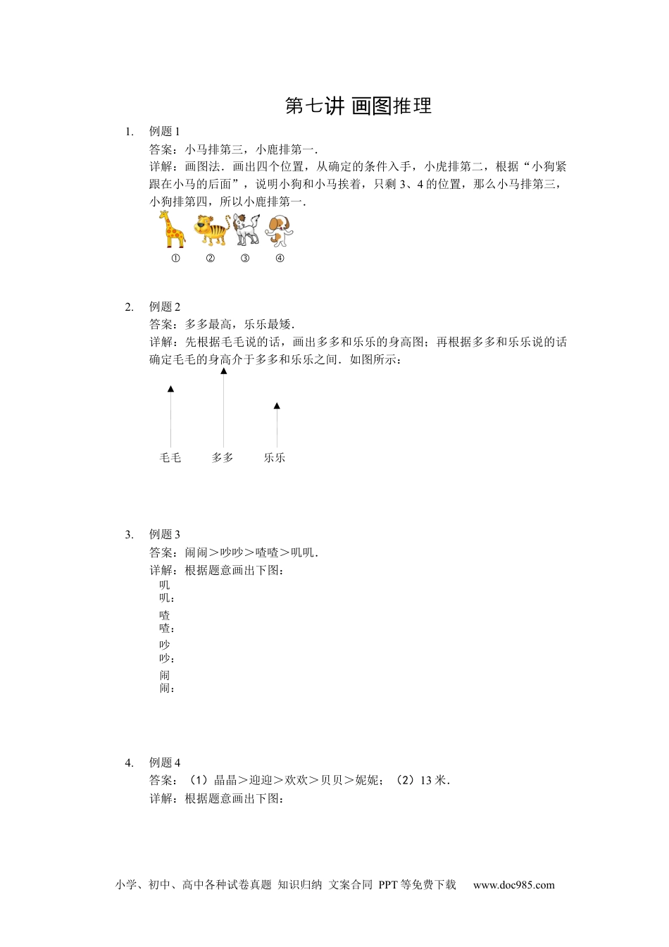 ①②③④毛毛乐乐多多叽叽:喳喳:吵吵:闹闹:小学、初中、高中各种试卷真题知识归纳文案合同PPT等免费下载www.doc985.com第七推理讲画图1.例题1答案:小马排第三,小鹿排第一.详解:画图法.画出四个位置,从确定的条件入手,小虎排第二,根据“小狗紧跟在小马的后面”,说明小狗和小马挨着,只剩3、4的位置,那么小马排第三,小狗排第四,所以小鹿排第一.2.例题2答案:多多最高,乐乐最矮.详解:先根据毛毛说的话,画出多多和乐乐的身高图;再根据多多和乐乐说的话确定毛毛的身高介于多多和乐乐之间.如图所示:3.例题3答案:闹闹>吵吵>喳喳>叽叽.详解:根据题意画出下图:4.例题4答案:(1)晶晶>迎迎>欢欢>贝贝>妮妮;(2)13米.详解:根据题意画出下图:贝贝晶晶欢欢迎迎妮妮3米10米8米5米13米612345狐狸狼612345狐狸狼第一步第二步老虎612345狐狸狼第三步老虎狮子豹子鳄鱼小学、初中、高中各种试卷真题知识归纳文案合同PPT等免费下载www.doc985.com5.例题5答案:老虎:6号;狮子:3号;鳄鱼:2号;豹子:4号;狼:1号;狐狸:5号.详解:根据“狐狸在5号笼子,狼在1号笼子”,得出第一步;根据“狼与老虎、鳄鱼相邻”,得出老虎在2号或6号笼子,再根据“老虎与狮子相隔两个笼子”,得出老虎在6号笼子,如图所示第二步;同时,得出狮子在3号笼子,鳄鱼在2号笼子;所以,豹子在4号笼子,如图所示第三步.6.例题6答案:丁<乙<丙.详解:根据乙说的话,得出甲和乙的分数一样(甲=乙);根据丙说的话,得出甲的分数比丙的低(甲<丙);再根据丁说的话,得出甲的分数比丁的高(丁<甲).所以,乙、丙、丁三人的分数从最低至最高由左向右排列为:丁<乙<丙.猴宝宝猴爸爸猴妈妈东东:南南:西西:北北:小学、初中、高中各种试卷真题知识归纳文案合同PPT等免费下载www.doc985.com7.练习1答案:冬冬简答:画出四个位置,从高到矮排序.从确定的条件入手,夏夏在第三.根据“春春只比冬冬矮”,说明春春和冬冬挨着,只剩1、2的位置,那么冬冬第一,春春第二.所以秋秋第四.8.练习2答案:猴宝宝的桃子最大,猴爸爸的桃子最小.简答:画图时用箭头长度代表桃子的大小,箭头越长代表桃子越大.如图所示:9.练习3答案:第一:北北,第二:东东,第三:南南,第四:西西简答:画线段图,用箭头长度代表跳远的距离,箭头越长代表跳得距离越远.如图所示:10.练习4答案:(1)小文>小影>小炜>小倩;(2)7米.简答:根据题意画出下图:小炜小影小文小倩3米8米4米7米田林丁月9米15米5米小学、初中、高中各种试卷真题知识归纳文案合同PPT等免费下载www.doc985.com11.作业1答案:四简答:先确定了草莓的位置,由于西瓜“紧跟”在橘子的后面,那么在四个位置中必须得有两个连续的位置是西瓜和橘子的,也就是第一个第二的位置,那么西瓜在第一,橘子在第二,剩下的第四个位置就是樱桃的了.12.作业2答案:小黑;小白简答:小灰的话:小白<小黑;小白的话:小黑>小灰;通过两只老鼠的话知道小黑偷的最多,小黑:小灰>小白,那么最后就是:小黑>小灰>小白,所以小黑偷的最多,小白偷的最少.13.作业3答案:蓝云朵>绿云朵>红云朵>黄云朵简答:蓝云朵最高,排在第一位.绿云朵的话:绿云朵>红云朵;黄云朵的话:黄云朵<红云朵,那么两个云朵的话可知:绿云朵>红云朵>黄云朵.又知蓝云朵跳的最高,则:蓝云朵>绿云朵>红云朵>黄云朵.14.作业4答案:(1)田田>林林>丁丁>月月;(2)6米简答:通过画线段图做本题,先画出丁丁和林林的即可.15.作业5答案:4;2;7;3;5;6;1.简答:先从确定的入手,确定布谷鸟是1号,乌鸦在5号.那么根据(3)可知麻雀可能在6或4,那么黄鹂就在4或6.当麻雀在6,黄鹂在4时,再通过(1)可发现鸽子是没有笼子的,那么这种情况排除.当麻雀在4,黄鹂在6的时候,通过(1)可得鸽子在2号,最后剩下两个笼子,3号和7号.又通过(2)可知,鹦鹉在7号,喜鹊在3号,最后得出麻雀在4号笼子;鸽子在2号笼子;鹦鹉在7号笼子;喜鹊在3号笼子;乌鸦在5号笼子;黄鹂在6号笼子;布谷鸟在1号笼子.