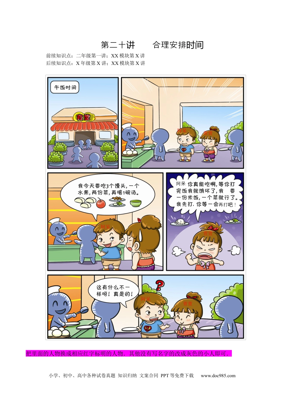 萱萱阿呆阿呆萱萱阿呆萱萱阿呆,再打!吧小学、初中、高中各种试卷真题知识归纳文案合同PPT等免费下载www.doc985.com第二十合理安排讲时间前续知识点:二年级第一讲;XX模块第X讲后续知识点:X年级第X讲;XX模块第X讲把里面的人物换成相应红字标明的人物.其他没有写名字的改成灰色的小人即可.星期天,小明家里来了客人,妈妈叫小明给客人烧水沏茶.小明开始做事:洗开水壶用1分钟,烧开水用8分钟,洗茶壶用1分钟,洗茶杯用3分钟,拿茶叶用2分钟,沏茶用1分钟.那么,小明最少用几分钟才能让客人喝上茶?例题1练习1甜甜早晨起床后开始做事:叠被用3分钟,刷牙洗脸用4分钟,烤面包用11分钟,吃面包用8分钟,整理书包用2分钟.请你安排一下,甜甜能最少用几分钟做完全部事情?小学、初中、高中各种试卷真题知识归纳文案合同PPT等免费下载www.doc985.com---------------------------------------------------------------------------------在日常生活和工作中,我们经常会遇到最优化的问题.完成一件事情怎样合理安排才能做到用时最少、效果最好,这类问题在数学中称为统筹问题.解决问题时,必须树立统筹思想,能同时做的事,尽量同时做.---------------------------------------------------------------------------------【提示】小明共需要做几件事?哪些事情可以同时做?---------------------------------------------------------------------------------统筹问题中,有一些事情人必须参与整个过程,如例题1中的洗脸刷牙;有些事情人不必参与整个过程,如烤面包,那是机器来做的,烤面包的同时人可以做其他的事情;有些事情必须在其他事情做完之后再做,如吃面包必须在烤面包之后,所以烤面包同时能做的事情必然不能是吃面包.我们一般从以下三点来考虑统筹问题.---------------------------------------------------------------------------------给一块小木板的两面涂漆,一面刷漆要1分钟,但必须等到5分钟漆干后才能给另一面刷漆.那么刷完6块这样的小木板最少需要几分钟?例题2练习2草莓娃娃给一些贺卡的两面涂上颜色,1面涂色要2分钟,但必须等到7分钟颜料干后才能给另一面涂色.那么涂完5张这样的贺卡最少需要几分钟?小学、初中、高中各种试卷真题知识归纳文案合同PPT等免费下载www.doc985.com【提示】把一块木板的一面刷上漆之后,必须等5分钟之后再给另一面刷漆,怎么好好利用这5分钟呢,只能干等着吗?姐姐和妹妹一起画5张漫画,画的漫画及所需时间是:画小猪用5分钟,画小狗用10分钟,画小兔用8分钟,画小猫用7分钟,画老虎用15分钟.怎样安排,姐妹俩才能尽快画完所有漫画?最少用几分钟?例题3练习3小狗和小象在堆积木,要堆成的模型及所需的时间是:堆成小汽车用8分钟,堆成小房子用6分钟,堆成大桥用10分钟,堆成城堡用14分钟,堆成桌子用2分钟.怎样安排,才能尽快堆完所有的模型?最少用几分钟?小学、初中、高中各种试卷真题知识归纳文案合同PPT等免费下载www.doc985.com【提示】尽量让两人所用时间相同!---------------------------------------------------------------------------------用最优化思想去解决统筹问题,如果有多个人同时来完成某项工作,最好的办法当然是平均分工作量,这样可以最快速完成任务.-----------------------------------------------------------------------------------------------------------------------------------------------------------------多个人排队依次做某事的统筹问题,我们要考虑所有人的时间成本.假设让那个花时间最长的人第一个来做某事,那就意味着队伍里的每个人都要等这么长的时间,时间成本很大.例如三个人分别花1小时,1分钟,2分钟时间排队依次做某事.考虑所有人的时间成本,我们必然会让1小时的人排在最后,让1分钟的人排在第一.--------------------------------------------------------------------------------小欢、小乐、小欣和小悦4个小朋友各拿一只水桶到水龙头前接水,水龙头注满4个人的水桶所需时间分别是5分钟、4分钟、3分钟、6分钟.现在只有一个水龙头可用.(1)怎样...