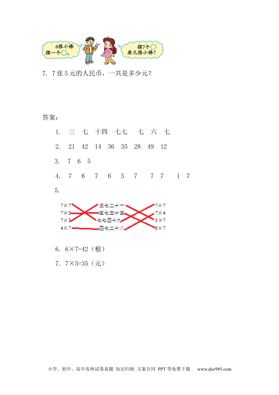 小学、初中、高中各种试卷真题知识归纳文案合同PPT等免费下载www.doc985.com6.17的乘法口诀1.把口诀补充完整。()七二十一五()三十五二七()()四十九四()二十八()七四十二一()得七2.口算。3×7=7×6=2×7=6×6=5×7=7×4=7×7=4×3=3.简单推理。++=21+=12++=15=()=()=()4.填空。3×()=217×()=422×()=14()×6=36()×7=35()×4=28()×()=49()×()=75.请把口诀和算式连起来。7×7三七二十一7×77×5五七三十五7×47×3七七四十九3×74×7四七二十八5×76.小学、初中、高中各种试卷真题知识归纳文案合同PPT等免费下载www.doc985.com7.7张5元的人民币,一共是多少元?答案:1.三七十四七七七六七2.21421436352849123.7654.76765777175.6.6×7=42(根)7.7×5=35(元)