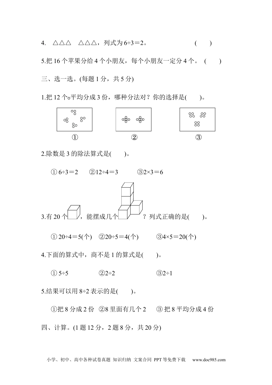 小学、初中、高中各种试卷真题知识归纳文案合同PPT等免费下载www.doc985.com第二单元达标测试卷一、填一填。(每空1分,共12分)1.在算式12÷3=()中,()是被除数,3是(),商是()。想口诀()可以求出商。2.用五六三十这句口诀可以写的除法算式是()和()。3.一共有8块饼干,平均分成了4份,每份是()块。4.20里面有()个5,()里面有3个4。5.右图能拼成()个,算式是()。二、判断。(每题1分,共5分)1.左图中的分法是平均分。()2.计算3×6=18和18÷6=3所用的口诀是一样的。()3.被除数和除数都是6,商是36。()小学、初中、高中各种试卷真题知识归纳文案合同PPT等免费下载www.doc985.com4.△△△△△△,列式为6÷3=2。()5.把16个苹果分给4个小朋友,每个小朋友一定分4个。()三、选一选。(每题1分,共5分)1.把12个平均分成3份,哪种分法对?你的选择是()。2.除数是3的除法算式是()。①6÷3=2②12÷4=3③2×3=63.有20个,能摆成几个?列式正确的是()。①20÷4=5(个)②20÷5=4(个)③4×5=20(个)4.下面的算式中,商不是1的算式是()。①5÷5②2÷2③2÷15.结果可以用8÷2表示的是()。①把8分成2份②8里面有几个2③把8平均分成4份四、计算。(1题12分,2题8分,共20分)小学、初中、高中各种试卷真题知识归纳文案合同PPT等免费下载www.doc985.com1.直接写出结果。6×2=36÷6=18-9=10÷5=16÷4=30+5=9÷3=18÷6=20-5=6÷6=5÷5=15÷3=2.小树叶落在哪儿好呢?147=732=522=166=015=5366=304=12318=99五、遮住的数是几?(8分)16÷=4÷4=220÷=5×3=12÷5=5÷1=16×=24×6=36六、一根丝带长24厘米,对折再对折,然后沿着折痕剪开,每段长多少厘米?(6分)七、看图列式。(1、2题每题3分,3题4分,共10分)1.2.小学、初中、高中各种试卷真题知识归纳文案合同PPT等免费下载www.doc985.com=(米)=(份)3.=(个)=(个)=(个)=(份)八、解决问题。(1题6分,2题12分,其余每题8分,共34分)1.李阿姨将6个面包装一盒,18个面包可以装几盒?2.小猫吃鱼。(1)每盘装6条,2盘一共多少条鱼?(2)如果把这些鱼平均分给3只小猫,每只小猫分得几条鱼?(3)如果每只小猫分4条鱼,这些鱼可以分给几只小猫?3.(变式题)春节之际,家家挂灯笼。小学、初中、高中各种试卷真题知识归纳文案合同PPT等免费下载www.doc985.com(1)10个灯笼,每个大门挂2个,一共可以挂几个大门?(2)10个灯笼,用去2个,还剩几个?4.4个家庭共24人租车出去旅行。(1)若都坐面包车,需要租几辆?(2)若都坐小汽车,需要租几辆?小学、初中、高中各种试卷真题知识归纳文案合同PPT等免费下载www.doc985.com答案一、1.412除数4三四十二2.30÷6=530÷5=63.24.4125.315÷5=3二、1.×2.√3.×4.×5.×三、1.③2.①3.②4.③5.②四、1.1269243533151152.-+÷-×-÷+五、484425146易错点拨:先判断用哪个口诀,再计算。六、24÷4=6(厘米)易错点拨:易因弄不清对折再对折共折成几段而出错。七、1.12÷3=42.12÷6=23.3×4=124×3=1212÷3=412÷4=3八、1.18÷6=3(盒)2.(1)6×2=12(条)(2)12÷3=4(条)(3)12÷4=3(只)3.(1)10÷2=5(个)(2)10-2=8(个)小学、初中、高中各种试卷真题知识归纳文案合同PPT等免费下载www.doc985.com4.(1)24÷6=4(辆)(2)24÷4=6(辆)
