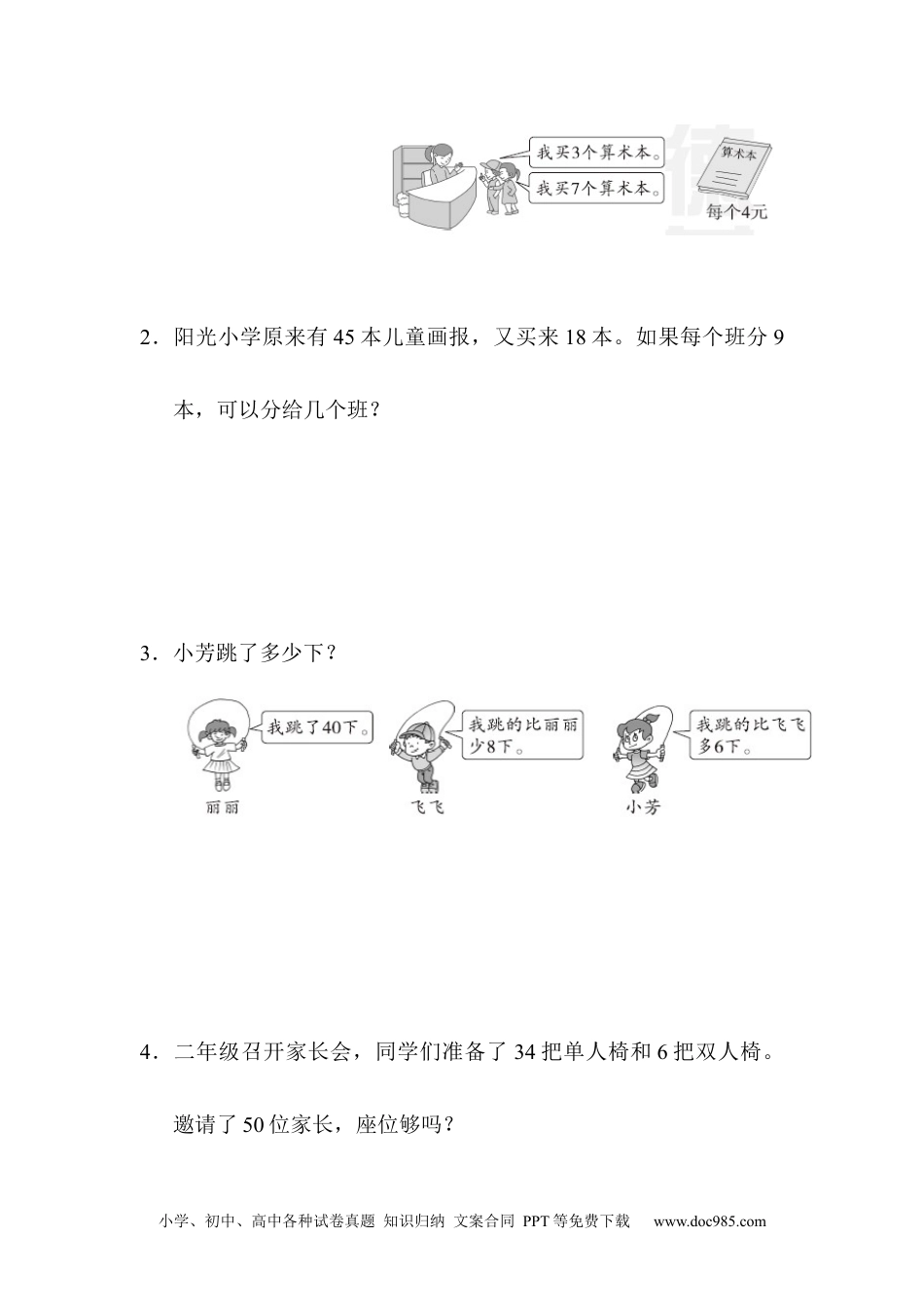 小学、初中、高中各种试卷真题知识归纳文案合同PPT等免费下载www.doc985.com重难点突破卷1一、我会填。(每题6分,共30分)1.估一估,买这三种商品大约共需()元。2.有47吨煤,用载重5吨的货车来运,运()次后,还剩2吨。3.有1600元,买豆浆机用去300元,买冰箱用去900元,还剩()元。4.除数是9,商比除数小3,则被除数是()。5.(1)红队:赢3场输2场,得()分。(2)黄队:赢4场输1场,得()分。二、走进生活,解决问题。(每题14分,共70分)1.女同学比男同学多花多少钱?小学、初中、高中各种试卷真题知识归纳文案合同PPT等免费下载www.doc985.com2.阳光小学原来有45本儿童画报,又买来18本。如果每个班分9本,可以分给几个班?3.小芳跳了多少下?4.二年级召开家长会,同学们准备了34把单人椅和6把双人椅。邀请了50位家长,座位够吗?小学、初中、高中各种试卷真题知识归纳文案合同PPT等免费下载www.doc985.com5.(1)1双手套比1条毛巾贵多少元?(2)买1双手套的钱可以买几条毛巾?小学、初中、高中各种试卷真题知识归纳文案合同PPT等免费下载www.doc985.com答案一、1.13002.93.4004.54[点拨]先求出商,列式是9-3=6,再求被除数,列式是6×9=54。5.(1)9[点拨]列式是:3×5-2×3=9(分)。(2)17二、1.4×(7-3)=16(元)口答:女同学比男同学多花16元钱。2.(45+18)÷9=7(个)口答:可以分给7个班。3.40-8+6=38(下)口答:小芳跳了38下。4.6×2+34=46(位)46<50口答:座位不够。[点拨]每把双人椅能坐2人。5.(1)54÷9=6(元)24-6=18(元)口答:1双手套比1条毛巾贵18元。小学、初中、高中各种试卷真题知识归纳文案合同PPT等免费下载www.doc985.com(2)24÷6=4(条)口答:买1双手套的钱可以买4条毛巾。