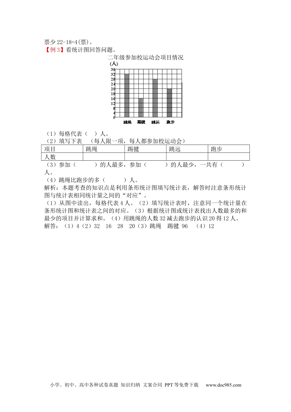 小学、初中、高中各种试卷真题知识归纳文案合同PPT等免费下载www.doc985.com第一单元数据收集整理【例1】你知道“正”字的笔顺吗?请写下来:_____、_____、_____、_____、_____。在统计中经常用画“正”字的方法来记录数字。如:有11只,则画为:正正一(1)有8辆,应画为:_________________(2)有19支,应画为:_________________解析:本题考查的知识点是用画“正”字的方法统计数据。解答时,先明确“正”字的笔顺,然后根据要画的数量来确定“正”字的个数和“正”字写到第几笔。解答:-正(1)正(2)正正正【例2】实验小学要举行阳光少年评选。二年级三班要从这两位同学中选一位参加评选,下面是同学们投票统计的情况。(1)把上面的统计结果填入下表。姓名李小红张鹏票数(2)根据统计结果,应该选()参加学校阳光少年的评选。(3)你喜欢哪种记录方法,为什么?(4)投票当天有3名同学请假没参加投票,如果他们也投了票,会改变投票结果吗?为什么?说说自己的理由。解析:本题考查的知识点是比较用画“∨”和画“正”字的方法统计数据的优越性以及利用统计知识解决简单的实际问题。(1)解答时可以计算“正”字的笔画也可以计数“∨”的个数,得出李小红是15票,张鹏是22票。(2)根据统计的结果应选取的票数最多的那个人。(3)比较两种计数的方法会发现,画“正”字的方法比较简单些。(4)此题可以假设这3人都投票给李小红,李小红只有15+3=18(票),还是比张鹏少。解答:(1)1522(2)张鹏(3)喜欢画“正”字的方法。这种方法很容易统计出结果。(4)不会改变,如果这三个人都投李小红,李小红也只有18票,还是比张鹏小学、初中、高中各种试卷真题知识归纳文案合同PPT等免费下载www.doc985.com票少22-18=4(票)。【例3】看统计图回答问题。二年级参加校运动会项目情况(1)每格代表()人。(2)填写下表(每人限一项,每人都参加校运动会)项目跳绳踢毽跳远跑步人数(3)参加()的人最多,参加()的人最少,一共有()人。(4)跳绳比跑步的多()人。解析:本题考查的知识点是利用条形统计图填写统计表,解答时注意条形统计图与统计表相同统计量之间的“对应”。(1)从图中读出,每格代表4人。(2)填写统计表时,注意同一个统计量在条形统计图和统计表之间的对应。(3)根据统计图或统计表找出人数最多的和最少的项目并计算求和。(4)用跳绳的人数32减去跑步的认识20得12人。解答:(1)4(2)32162820(3)跳绳踢毽96(4)12