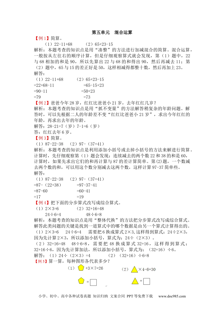 小学、初中、高中各种试卷真题知识归纳文案合同PPT等免费下载www.doc985.com第五单元混合运算【例1】简算。(1)22-11+68(2)65+23-15解析:本题考查的知识点是用“凑整”的方法进行加减混合的简算。混合运算,一般按从左往右的顺序计算,但是仔细观察算式就会发现,第(1)题中,22与68相加的和是90,所以先算出22与68的和得出90,然后再减去11;第(2)题中,65与15的差正好是50,这样相减得都整十数,然后再加上23。解答:(1)22-11+68(2)65+23-15=22+68-11=65-15+23=90-11=50+23=79=73【例2】爸爸今年28岁,红红比爸爸小21岁,去年红红几岁?解析:本题考查的知识点是用“抓不变量”的方法解答稍复杂的年龄问题。解答时,可以先根据二人的年龄差不变“红红比爸爸小21岁”,求出今年红红的年龄,再求出去年的年龄。解答:28-21=7(岁)7-1=6(岁)答:红红去年6岁。【例3】简算。(1)87-22-38(2)97-(37+41)解析:本题考查的知识点是利用添加小括号或去掉小括号的方法来解进行简算。计算时,先仔细观察第(1)题会发现:连续减去的两个数22和38的和是60,计算时,如果先求出它们的和再计算与87的差计算简单。第(2)题,一个数减去两个数的和,可以用这个数分别减去这两个数,这样计算97-37简单些。解答:(1)87-22-38(2)97-(37+41)=87-(22+38)=97-37-41=87-60=60-41=17=19【例4】把下面的分步算式改写成综合算式。(1)2×3=6(2)32+16=4824÷6=448÷6=8解析:本题考查的知识点是用“整体代换”的方法把分步算式改写成综合算式。解答此类问题的关键是找到一道算式中的哪个数据是由另一个算式计算得出的。(1)2×3=624÷6=4需要把6换成算式2×3,这样得到算式:24÷2×3,因为先计算2×3,所以添加小括号,算式为:24÷(2×3)。(2)32+16=4848÷6=8,需要把48换成算式32+16,这样得到算式:32+16÷6,因为先计算加法,所以添加小括号,算式为:(32+16)÷6。解答:(1)24÷(2×3)=4(2)(32+16)÷6=8【例5】算一算,每种图形各代表多少?小学、初中、高中各种试卷真题知识归纳文案合同PPT等免费下载www.doc985.com解析:本题考查的知识点是利用整体思想解答符号所代表的未知数类问题。解答时,先把含有符号的算式部分看成一个整体,然后结合算式中的已知数,从而求出符号所代表的数。(1)已知,我们可以先计算出3×7的积是21,这样算式变为+21=26,所以=26-21=5.(2)已知,先把看成一个整体,想谁减去6得30得出=36,再接着想谁与4的积是36,所以=9.解答:(1)5(2)9【例6】添上小括号,使下面的算式成立。(1)15-6÷3=3(2)2×5+3=16解析:本题考查的知识点是利用分析推理逆推等方法解答添加括号使等式成立类问题。解答时,先要整体观察算式,看含有哪些运算,最后结果是多少。(1)15-6÷3=3,想,结果是3,后面的运算是除以3,这样可以得出3×3=9,正好15与6的差也是9,所以只要先计算15与6的差即可,所以用小括号先计算15与6的差。(2)2×5+3=16,想,结果是16,后面的运算是+3,16与3的差是13,而2×5的积是10,不符合题意;看前面的运算符号是乘法,想,2与谁的积是16,得出2与8的积是16,正好5+3=8,所以把5+3看成整体,添加小括号。解答:(1)(15-6)÷3=3(2)2×(5+3)=16【例7】公共汽车上原有36人,到中山路站时有4人下车,有13人上车。解析:本题考查的知识点是从不同角度思考问题得到不同的解决问题的方法,体会解决问题策略多样性。解答此问题时,理解“下车”用减法,“上车”用加法是关键。方法一:先求出到达中山站下车后的人数,再加上上车的人数。方法二:先求出到达中山站后原有的人数加上上车的人数和再减去下车的人数。方法三:用原有的人数36加上到达中山站后上车与下车人数的差。解答:解法一:36-4+13解法二:36+13-4解法三:36+(13-4)=32+13=49-4=36+9=45(人)=45小学、初中、高中各种试卷真题知识归纳文案合同PPT等免费下载www.doc985.com(人)=45(人)答:现在车上有45人。【例8】小红在算18-÷2时弄错了运算顺序,先算减法后算除法了,结果得数是5。正确的得数应该是多少?解析:本题考查的知识点是用倒推法解决问题。解答时,先按错误的运算顺序推算出方框中的数是8,再根据算式18-8÷2中算出正确得数是14。考查目的:巩固混合运算的运算顺序,学会逆向思维。解答:18-5×218-8÷2=18-10=18-4=8=14答:正确得数是14。