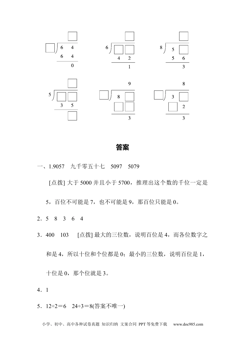 小学、初中、高中各种试卷真题知识归纳文案合同PPT等免费下载www.doc985.com方法技能提升卷3一、我会填。(2题5分,其余每题4分,共21分)1.用4张数字卡片组成的四位数中,最接近9000的数是(),读作();大于5000并且小于5700的数是()和()。2.在里最大能填几?6547>64545÷5>6<24÷1千克-300克>00克☆÷5=3……3.一个三位数,它的各位数字之和是4,这样的三位数中,最大的是(),最小的是()。4.操场上有19个同学在跳舞,如果想把他们平均分成3组,至少应去掉()个同学。5.用六张卡片,摆出两个除法算式。(每张卡片只用一次)____________________________________二、我会选。(13分)从7,4,9,28和16中选出3个数写出两个乘法算式和两个除小学、初中、高中各种试卷真题知识归纳文案合同PPT等免费下载www.doc985.com法算式,并写出所用的口诀。====口诀:________________三、我会比。(每题2分,共18分)在里填上“>”“<”或“=”。3200克3千克6200克6199克7000克7千克42÷6621÷31×6+29×39÷336÷65×3-8545×9+512÷22×4-3四、我会填运算符号。(每题3分,共24分)小鸟飞向哪里?36=18546=9255=599=1893=659=4514070=7030002000=5000五、我会想。(每题4分,共24分)在里填上合适的数字。小学、初中、高中各种试卷真题知识归纳文案合同PPT等免费下载www.doc985.com答案一、1.9057九千零五十七50975079[点拨]大于5000并且小于5700,推理出这个数的千位一定是5,百位不可能是7,也不可能是9,那百位只能是0。2.583643.400103[点拨]最大的三位数,说明百位是4,而各位数字之和是4,所以十位和个位都是0;最小的三位数,说明百位是1,十位是0,那个位就是3。4.15.12÷2=624÷3=8(答案不唯一)小学、初中、高中各种试卷真题知识归纳文案合同PPT等免费下载www.doc985.com二、4×7=2828÷4=77×4=2828÷7=4四七二十八三、>>=><><>>四、×÷÷+-×-+五、(第4个竖式的被除数和余数答案不唯一)