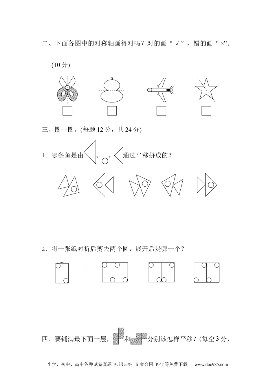 小学、初中、高中各种试卷真题知识归纳文案合同PPT等免费下载www.doc985.com方法技能提升卷2一、我会填。(每空2分,共42分)1.下面现象是平移的在括号里画“△”,是旋转的画“○”。2.下面的图形是轴对称图形的在括号里画“√”,不是的画“×”。3.写出分针从12旋转到下面各个位置所经过的时间。4.把镜子放在虚线上,看看整个图形是什么?填在括号里。小学、初中、高中各种试卷真题知识归纳文案合同PPT等免费下载www.doc985.com小学、初中、高中各种试卷真题知识归纳文案合同PPT等免费下载www.doc985.com二、下面各图中的对称轴画得对吗?对的画“√”,错的画“×”。(10分)三、圈一圈。(每题12分,共24分)1.哪条鱼是由、、通过平移拼成的?2.将一张纸对折后剪去两个圆,展开后是哪一个?四、要铺满最下面一层,和分别该怎样平移?(每空3分,小学、初中、高中各种试卷真题知识归纳文案合同PPT等免费下载www.doc985.com共24分)小学、初中、高中各种试卷真题知识归纳文案合同PPT等免费下载www.doc985.com答案一、1.○△△○2.√×√×××√××√3.45分钟20分钟55分钟[点拨]分针从12开始,每走一大格,走了5分钟,故也可以5个5个地数。4.蜻蜓台灯衣服中国结二、√×√√三、1.2.四、右2下6右2下4[点拨]关注关键条件“要铺满最下面一层”。小学、初中、高中各种试卷真题知识归纳文案合同PPT等免费下载www.doc985.com