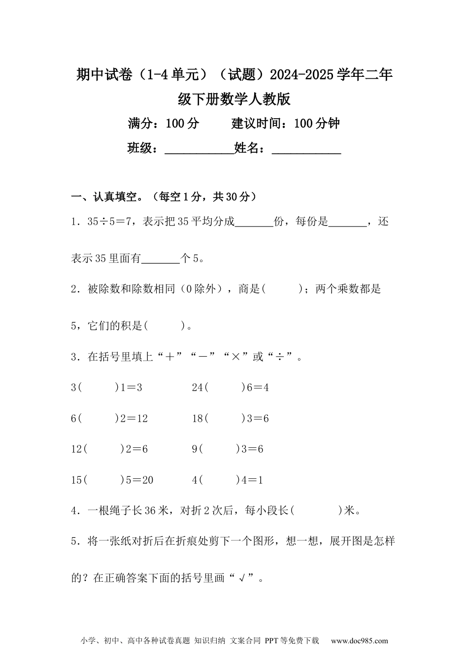 小学、初中、高中各种试卷真题知识归纳文案合同PPT等免费下载www.doc985.com期中试卷(1-4单元)(试题)2024-2025学年二年级下册数学人教版满分:100分建议时间:100分钟班级:___________姓名:___________一、认真填空。(每空1分,共30分)1.35÷5=7,表示把35平均分成份,每份是,还表示35里面有个5。2.被除数和除数相同(0除外),商是();两个乘数都是5,它们的积是()。3.在括号里填上“+”“-”“×”或“÷”。3()1=324()6=46()2=1218()3=612()2=69()3=615()5=204()4=14.一根绳子长36米,对折2次后,每小段长()米。5.将一张纸对折后在折痕处剪下一个图形,想一想,展开图是怎样的?在正确答案下面的括号里画“√”。小学、初中、高中各种试卷真题知识归纳文案合同PPT等免费下载www.doc985.com6.学校升国旗是()现象,小朋友荡秋千是()现象。7.1瓶可乐可以倒满4杯,要倒满28杯,需要()瓶可乐。8.54里面有()个9。36连续减去()个6,结果为0。9.小明在计算一个数除以9时,把被除数的十位数字与个位数字看颠倒了,结果得到的商是4。这道题正确的被除数是()。10.按规律填数。二、慎重选择。(将正确的答案序号填入括号内)(每题1分,共小学、初中、高中各种试卷真题知识归纳文案合同PPT等免费下载www.doc985.com10分)11.小林用画“正”字的方法,统计自行车在街道上的辆数:20分钟统计得“正正正正一”票,结果自行车是()。A.21辆B.20辆C.15辆12.下面图()中的物品不是平均分。A.B.C.D.13.24÷8读作()。A.24除8B.24除以8C.8除以2414.一只蜗牛爬10米深的井,白天爬4米,晚上下滑2米,()天爬出来。A.3B.4C.5D.615.一道除法算式,除数和商相同,如果被除数是36,商是()。A.8B.6C.7小学、初中、高中各种试卷真题知识归纳文案合同PPT等免费下载www.doc985.com16.小猫钓了一些鱼。比20多,比30少,分的份数和每份的条数同样多,小猫一共钓了()条鱼。A.22B.36C.25D.2817.在字母图案ABCDEFG中,轴对称图形共有()个。A.3B.4C.518.把一张长方形纸对折后再对折,沿折线画出花瓶的一半,把它沿着画的线剪下来,能剪出()个完整的花瓶。A.1B.2C.3D.419.81÷9和9×9这两个算式,()。A.意义相同B.计算口诀相同C.计算结果相同20.下面选项能用算式解答的是()。A.小学、初中、高中各种试卷真题知识归纳文案合同PPT等免费下载www.doc985.comB.C.D.三、用心判断。(每小题1分,共8分)21.小亮6岁时身高118cm,小冬9岁时身高135cm,小强12岁时身高152cm,说明身高随着年龄的增加而增高。()22.在除法里,商可能等于除数。()23.把12个苹果放在3个盘子里,每个盘子里一定有4个。()24.根据左图可以列式为小学、初中、高中各种试卷真题知识归纳文案合同PPT等免费下载www.doc985.com。()25.一根长10米的绳子,每2米剪一段,要剪5次才能剪完。()26.如下图,把一张正方形纸对折,沿虚线剪掉空白部分,能得到松树。()27.每一句口诀都可以写出两道不同的除法算式。()28.花瓶里有三十几朵花,每7朵扎一束,正好扎完。花瓶里共有35朵花。()四、计算题(共20分)29.直接写出得数。(20分)4×4=2×5=4×5=8÷8=24÷6=20÷5=20÷4=5×6=30-6=30÷5=18-3=36÷6=16÷4=5+18=4×3=12÷3=2×3+4=74-33-5=小学、初中、高中各种试卷真题知识归纳文案合同PPT等免费下载www.doc985.com56+28+8=16+35+9=五、动手实践(4分)30.用自己的方式表示12÷3=4的含义。六、活学活用(共28分)31.4个空汽水瓶可以换1瓶汽水。小明买来16瓶汽水,喝完就用空瓶换汽水喝(换到不能换为止)。小明一共可以喝到几瓶汽水?(4分)32.为庆祝“六一”儿童节,商店搞促销活动,每顶帽子降价3元。小亮、小丁、小亚和小巧每人买了一顶帽子,一共花了32元。原来每顶帽子多少钱?(4分)小学、初中、高中各种试卷真题知识归纳文案合同PPT等免费下载www.doc985.com33.小兴看一本童话书,3天看了24页书,照这种速度,这童话书共56页,需要多少天可以看完?(4分)34.爸爸去超市买了12块水果糖和10块奶糖,让军军和...