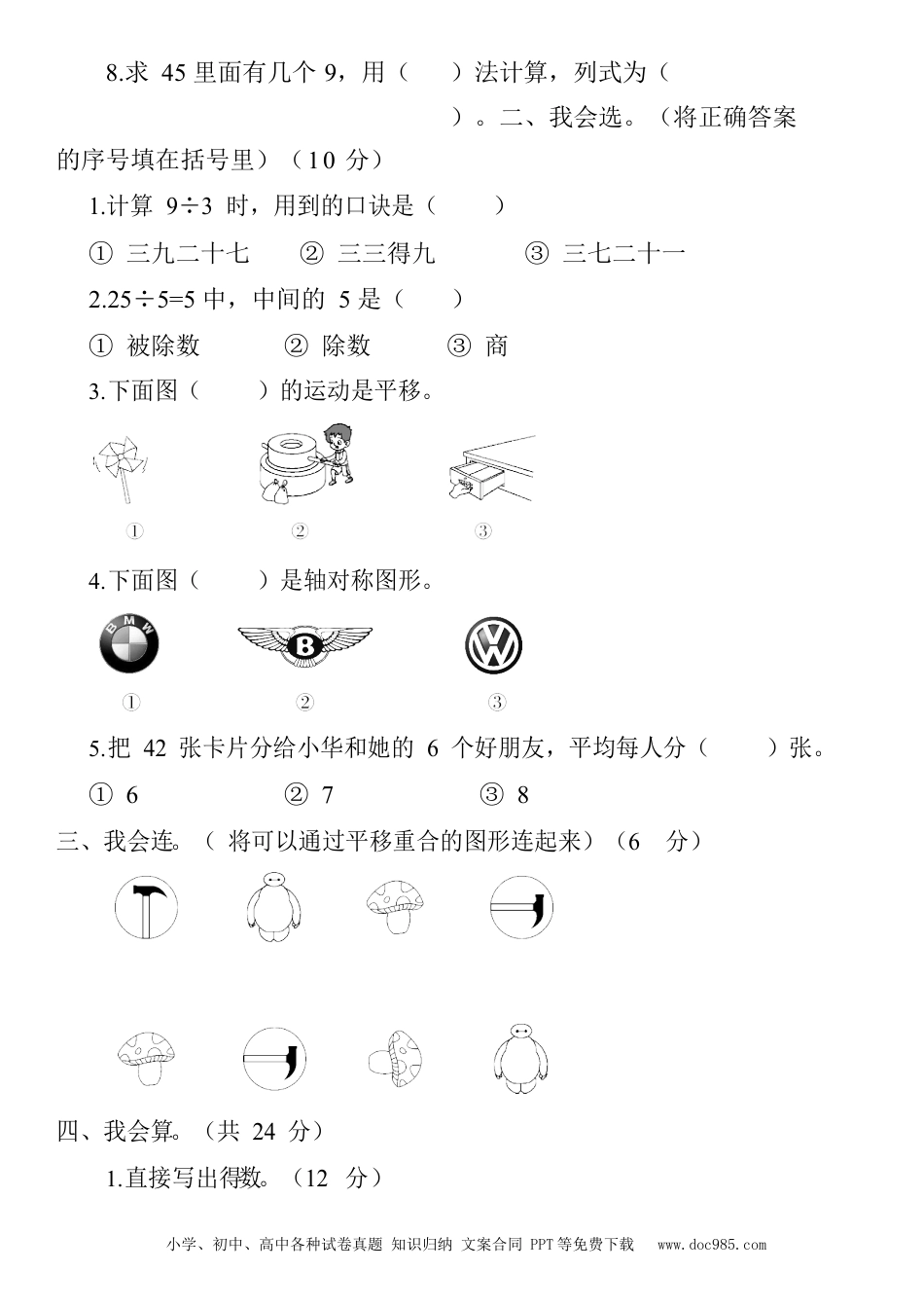 小学、初中、高中各种试卷真题知识归纳文案合同PPT等免费下载www.doc985.com人教二年级数学下册期中测试⑤卷及答案卷面(3分)。我能做到书写端正,卷面整洁。知识技能(68分)一、我会填。(每空1分,共28分)1.24÷8=3读作(),表示把24平均分成()份,每份是();还可以表示24里面有()个()。2.计算30÷6和30÷5时都用同一句口诀()。3.(1)每盘有4个,装()盘,一共有()个。(2)()个,每()个装一盘,装了()盘。(3)()个,平均装()盘,每盘()个。4.计算32+(18-5)时,应先算()法,再算()法。5.骑自行车,车轮的转动属于()现象;升降机上下移动属于()现象。6.圆是()图形,长方形有()条对称轴。7.在○里填上“>”“<”“=”“+”“-”“×”或“÷”。8○4=22○3=640○7=3332÷4○35÷536÷4○72÷835÷7○48÷8小学、初中、高中各种试卷真题知识归纳文案合同PPT等免费下载www.doc985.com8.求45里面有几个9,用()法计算,列式为()。二、我会选。(将正确答案的序号填在括号里)(10分)1.计算9÷3时,用到的口诀是()①三九二十七②三三得九③三七二十一2.25÷5=5中,中间的5是()①被除数②除数③商3.下面图()的运动是平移。4.下面图()是轴对称图形。5.把42张卡片分给小华和她的6个好朋友,平均每人分()张。①6②7③8三、我会连。(将可以通过平移重合的图形连起来)(6分)四、我会算。(共24分)1.直接写出得数。(12分)小学、初中、高中各种试卷真题知识归纳文案合同PPT等免费下载www.doc985.com56÷7=83×8=2428÷4=749+40=89小学、初中、高中各种试卷真题知识归纳文案合同PPT等免费下载www.doc985.com40÷5=862-7=556×9=5416÷8=230÷6=59÷9=132+8=4010-5=52.脱式计算。(12分)78+12-4871-(32-19)3+24÷3=90-48=71-13=3+8=42=58=1112+12÷448-8÷852-19+10=12+3=48-1=33+10=15=47=43生活应用(32分)五、解决问题。(共32分)1.树上有43只小鸟,飞走了18只。剩下的小鸟平均站在5棵树上,每棵树上站几只?(5分)2.二(1)班共有45人,每人参加一项体育活动。16人参加跳绳活动,17人参加羽毛球活动,其余的参加踢毽子活动,参加踢毽子活动的有多少人?(5分)3.4个同学做了12面红旗和16面绿旗,平均每个同学做了几面小旗?(5分)小学、初中、高中各种试卷真题知识归纳文案合同PPT等免费下载www.doc985.com4.小明和爸爸、妈妈、爷爷、奶奶一起去海洋世界玩。带40元钱够买票吗?若不够,差几元?(7分)5.下面是二(1)班选副班长的投票情况。(10分)(1)把得票的结果填在下表中。(2)()的票数最多,()的票数最少。(3)根据统计结果,应该选()当副班长。(4)有1位同学缺勤没有参加投票,如果他也投了票,结果会怎样?小学、初中、高中各种试卷真题知识归纳文案合同PPT等免费下载www.doc985.com期中测试卷—、1.24除以8等于383382.五六三十3.(1)312(2)1243(3)12344.减加5.旋转平移6.轴对称27.7X->=<8.除4579=5二、,1.':2.(2',3.,3)4.fl)5.'J)五、I.(43—l8)豆5=5(只)2.45-16-17=12(人)或45-(I6+17)=12(人)3.(l2+16)74=7(面)4.4X9=36(元)36+5=41(元)41-40=I(元)5.(I)l8l4205(2)小东小江(3)小东(4)结果还是小东的票数最多,被评选为副班长。