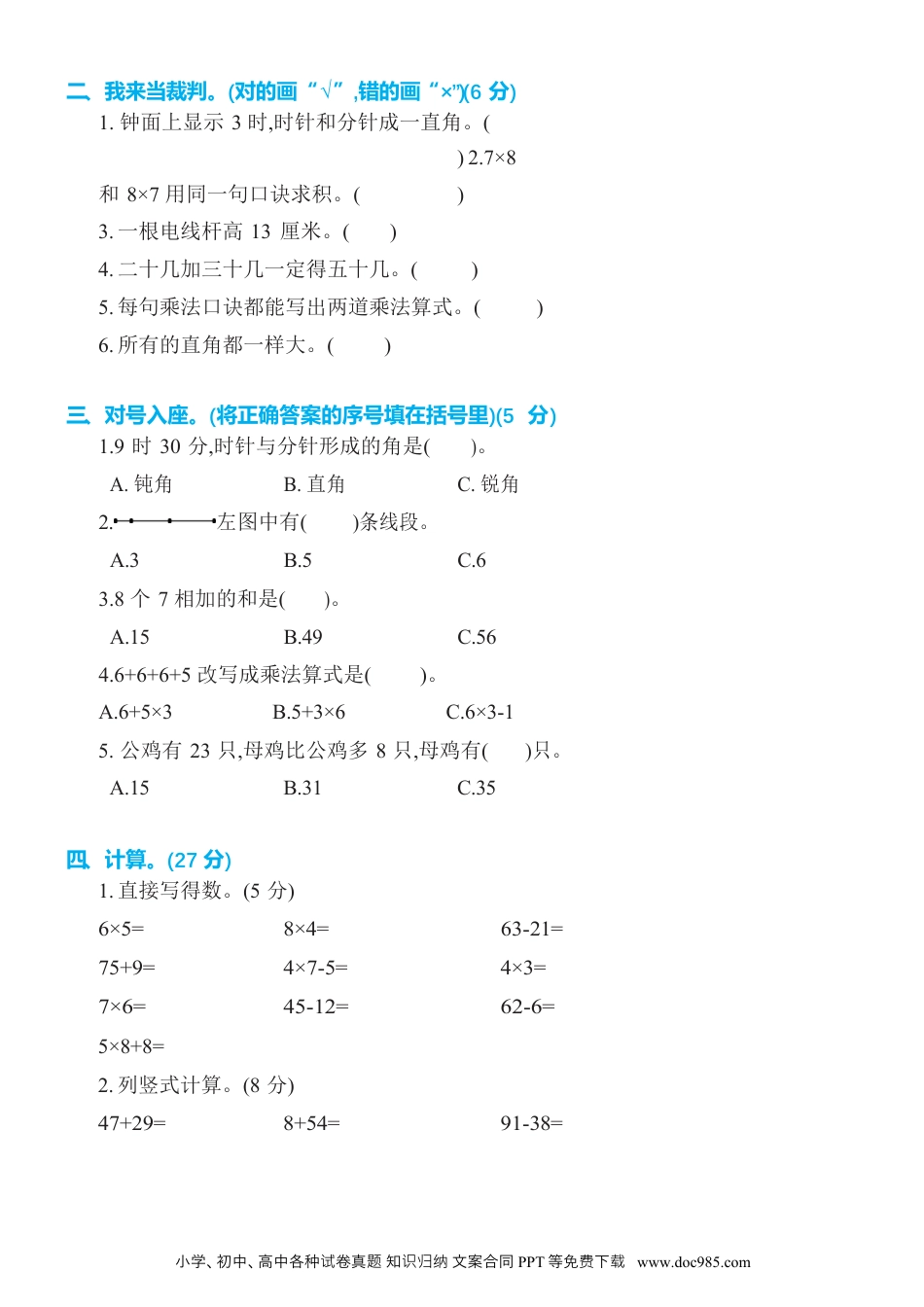 小学、初中、高中各种卷真知文案合同试题识归纳PPT等免下费载www.doc985.com人教版数学二年级下期末综合测试卷班级:姓名:一、填空。(33分)1.在下面的括号里填上合适的长度单位。(1)一棵大树高约20()。(2)一条裤子长约85()。(3)一本书宽约16()。(4)黑板长约3()。2.9×6表示()个()相加,也可以表示()个()相加,结果是(),计算时所用的乘法口诀是()。3.最大的两位数比最小的两位数多()。4.()里最大能填几?7×()<4324>()×531>9×()5.3个人进行围棋比赛,每两个人都要下1盘棋,一共要下()盘棋。6.左图中共有()个角,其中有()个锐角。7.42米+36米=()米1米-15厘米=()厘米1时=()分8.两个乘数都是9,它们的积是()。9.如下图,铅笔长()厘米,小刀长()厘米。10.用3、9、8三张卡片能摆成()个不同的两位数,它们是()。11.在○里填上“+”“-”“×”“>”“<”或“=”。6○7=4217○6=238×2○1633○7=2642-30○1256○9×633+9○366○4=24小学、初中、高中各种卷真知文案合同试题识归纳PPT等免下费载www.doc985.com二、我来当裁判。(对的画“√”,错的画“×”)(6分)1.钟面上显示3时,时针和分针成一直角。()2.7×8和8×7用同一句口诀求积。()3.一根电线杆高13厘米。()4.二十几加三十几一定得五十几。()5.每句乘法口诀都能写出两道乘法算式。()6.所有的直角都一样大。()三、对号入座。(将正确答案的序号填在括号里)(5分)1.9时30分,时针与分针形成的角是()。A.钝角B.直角C.锐角2.左图中有()条线段。A.3B.5C.63.8个7相加的和是()。A.15B.49C.564.6+6+6+5改写成乘法算式是()。A.6+5×3B.5+3×6C.6×3-15.公鸡有23只,母鸡比公鸡多8只,母鸡有()只。A.15B.31C.35四、计算。(27分)1.直接写得数。(5分)6×5=8×4=63-21=75+9=4×7-5=4×3=7×6=45-12=62-6=5×8+8=2.列竖式计算。(8分)47+29=8+54=91-38=小学、初中、高中各种卷真知文案合同试题识归纳PPT等免下费载www.doc985.com40-14=25+(39-17)=86-(48+24)=22+35=37+17+8=3.看图列式计算。(2分)4.()里最大能填几?(6分)()×4<2934>5×()7×()<3080>9×()()×8<5560>()×95.列式计算。(6分)(1)54比45多多少?(2)5个6相加,结果是多少?(3)9和7相乘,积是多少?小学、初中、高中各种卷真知文案合同试题识归纳PPT等免下费载www.doc985.com五、动手操作。(5分)1.请你画1个钝角、1个直角、1个锐角。(3分)2.请你画1条比5厘米长2厘米的线段。(1分)3.在下图中加1条线段,使它增加3个直角。(1分)六、右面的图形分别是谁看到的?连一连。(2分)七、明明周末去动物园参观,请你把相应的时间填在横线上,并按时间的顺序用带箭头的线标出明明的参观路线。(4分)小学、初中、高中各种卷真知文案合同试题识归纳PPT等免下费载www.doc985.com八、解决问题。(18分)1.(3分)2.购物。(1)买5双袜子和1双鞋一共多少钱?(3分)(2)妈妈买了1顶帽子、1副手套和1双袜子,付给售货员50元,应找回多少钱?(3分)3.他们两个人1分钟一共能打多少个字?(3分)小学、初中、高中各种卷真知文案合同试题识归纳PPT等免下费载www.doc985.com4.妈妈买回7盒巧克力,每盒里有8块,强强已经吃了27块,还剩多少块?(3分)5.明明什么时间可能在玩?(3分)小学、初中、高中各种卷真知文案合同试题识归纳PPT等免下费载www.doc985.com、期末综合测试卷答案与点拨一、1.(1)米(2)厘米(3)厘米(4)米2.699654六九五十四3.894.6435.36.857.7885608.819.6410.639、38、93、98、83、8911.×+=-=>>×二、1.√2.√3.×4.×5.×6.√三、1.A2.C3.C4.B5.B四、1.303242842312423356482.76625326471457623.84-36=48(本)4×5+3=23(个)或4×6-1=23(个)4.7648665.(1)54-45=9(2)6×5=30或5×6=30(3)9×7=63或7×9=63五、略六小学、初中、高中各种卷真知文案合同试题识归纳PPT等免下费载www.doc985.com、七八、1.6×8=48(千米)2.(1)4×5+46=66(元)(2)50-15-15-4=16(元)3.52-9+52=95(个)4.7×8-27=29(块)5.第一个钟面所显示的时间,即9:55