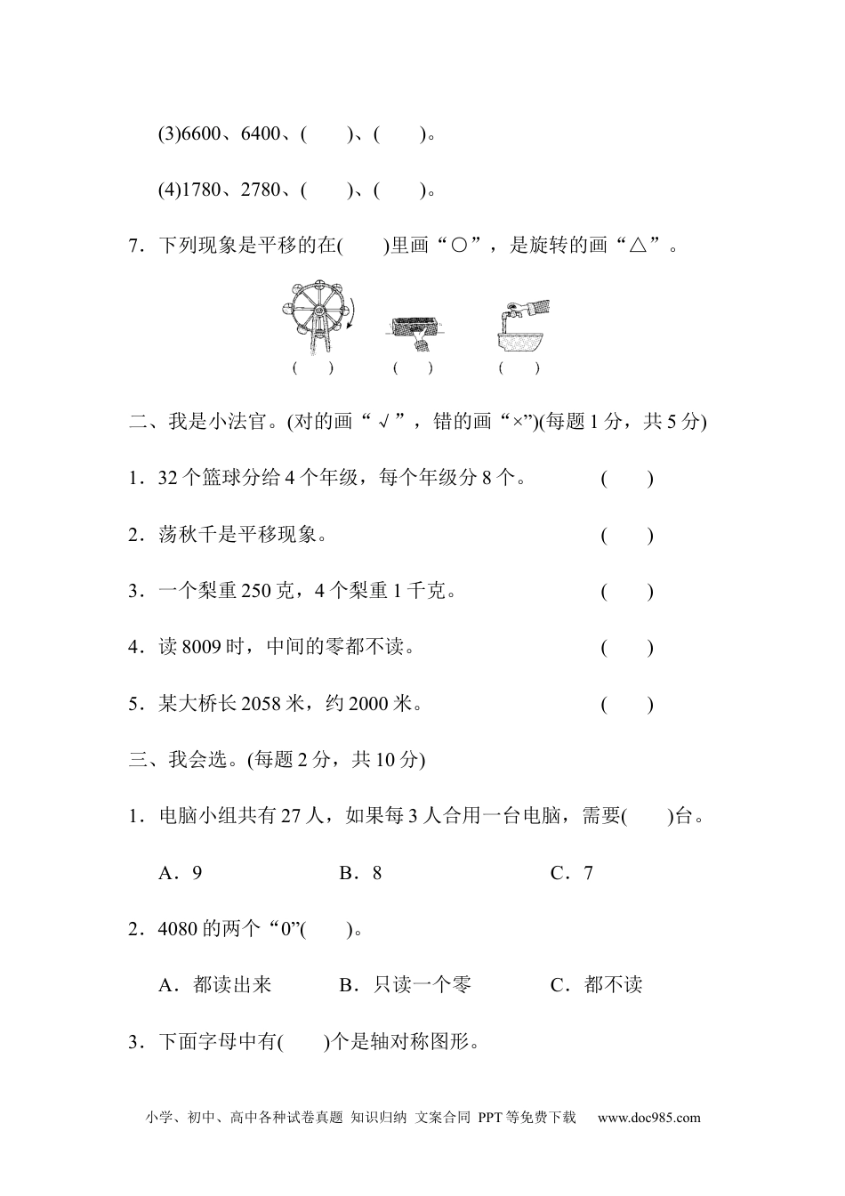 小学、初中、高中各种试卷真题知识归纳文案合同PPT等免费下载www.doc985.com二年级下册期末检测卷一、我会填。(每空1分,共22分)1.在计算有余数的除法时,()必须比()小。2.用五九四十五这句口诀计算的两道除法算式是()和()。3.72支铅笔,平均分给9个小朋友,每个小朋友分()支。4.一个四位数,千位和十位都是8,其余数位是0,这个数读作:(),写作:()。5.在()里填上合适的质量单位。一块橡皮约重6()一袋面粉重50()一只鸭重2000()一袋盐重250()6.按规律填数。(1)5680、5690、()、()。(2)14、21、()、35、()。小学、初中、高中各种试卷真题知识归纳文案合同PPT等免费下载www.doc985.com(3)6600、6400、()、()。(4)1780、2780、()、()。7.下列现象是平移的在()里画“○”,是旋转的画“△”。二、我是小法官。(对的画“√”,错的画“×”)(每题1分,共5分)1.32个篮球分给4个年级,每个年级分8个。()2.荡秋千是平移现象。()3.一个梨重250克,4个梨重1千克。()4.读8009时,中间的零都不读。()5.某大桥长2058米,约2000米。()三、我会选。(每题2分,共10分)1.电脑小组共有27人,如果每3人合用一台电脑,需要()台。A.9B.8C.72.4080的两个“0”()。A.都读出来B.只读一个零C.都不读3.下面字母中有()个是轴对称图形。小学、初中、高中各种试卷真题知识归纳文案合同PPT等免费下载www.doc985.comHAPPYA.2B.3C.44.989最接近()。A.1000B.900C.8005.用算盘记数的时候,一个上珠表示()。A.1B.0C.5四、我会算。(每题8分,共24分)1.直接写出得数。5×6=32÷8=98-45=63÷7=81÷9=40÷5=96+25=8×7=900+700=6000+600=150+40=4000-900=4300-3000=650+80=300+900=2800-600=2.竖式计算。45÷9=76÷8=小学、初中、高中各种试卷真题知识归纳文案合同PPT等免费下载www.doc985.com35÷6=56÷8=3.计算下列各题。68+5×598-27÷3====(16+38)÷68×(24÷3)====五、下面是二(1)班同学喜欢的运动项目统计情况。(1题4分,其余每题3分,共13分)足球正小学、初中、高中各种试卷真题知识归纳文案合同PPT等免费下载www.doc985.com篮球正正排球正正踢毽子正正正正正正1.把上面的统计结果填入下表中。项目足球篮球排球踢毽子人数2.喜欢哪种运动项目的人最多?喜欢哪种运动项目的人最少?3.如果让你给学校买体育器材,你会多买什么器材?为什么?4.你还能提出其他数学问题吗?六、解决问题。(4题6分,其余每题5分,共26分)1.哪一种袜子较便宜?小学、初中、高中各种试卷真题知识归纳文案合同PPT等免费下载www.doc985.com2.买一辆自行车和一个电饭锅,爸爸带600元够吗?3.有68千克苹果,如果每筐苹果9千克,至少需要装多少筐?4.灯笼按下面的方式排列。(1)第19个灯笼是什么颜色的?小学、初中、高中各种试卷真题知识归纳文案合同PPT等免费下载www.doc985.com(2)第36个灯笼是什么颜色的?5.小松鼠采了43个松果,他准备吃9天,还要采几个才够它每天吃5个?小学、初中、高中各种试卷真题知识归纳文案合同PPT等免费下载www.doc985.com答案一、1.余数除数2.45÷5=945÷9=53.84.八千零八十80805.克千克克克6.(1)57005710(2)2842(3)62006000(4)378047807.△○△二、1.×2.×3.√4.×5.√三、1.A2.B3.B4.A5.C四、1.30453998121561600660019031001300730120022002.45÷9=576÷8=9……435÷6=5……556÷8=7小学、初中、高中各种试卷真题知识归纳文案合同PPT等免费下载www.doc985.com3.68+5×598-27÷3=68+25=98-9=93=89(16+38)÷68×(24÷3)=54÷6=8×8=9=64五、1.81012302.喜欢踢毽子的人最多,喜欢足球的人最少。3.我会多买毽子,因为喜欢踢毽子的人最多。4.略。六、1.25÷5=5(元)36÷9=4(元)5>4答:9双装便宜。2.413元超过400元,208元超过200元,200+400=600(元)413+208大于600答:爸爸带600元不够。小学、初中、高中各种试卷真题知识归纳文案合同PPT等免费下载www.doc985.com3.68÷9=7(筐)……5(千克)7+1=8(筐)答:至少需要装8筐。4.(1)19÷5=3(次)……4(个)答:第19个灯笼是红色的。(2)36÷5=7(次)……1(个)答:第36个灯笼是黄色的。5.5×9-43=2(个)答:还要采2个才够它每天吃5个。
