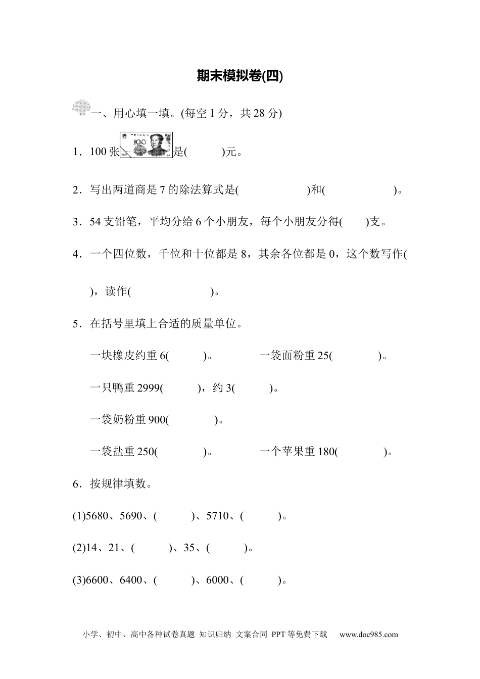 小学、初中、高中各种试卷真题知识归纳文案合同PPT等免费下载www.doc985.com期末模拟卷(四)一、用心填一填。(每空1分,共28分)1.100张是()元。2.写出两道商是7的除法算式是()和()。3.54支铅笔,平均分给6个小朋友,每个小朋友分得()支。4.一个四位数,千位和十位都是8,其余各位都是0,这个数写作(),读作()。5.在括号里填上合适的质量单位。一块橡皮约重6()。一袋面粉重25()。一只鸭重2999(),约3()。一袋奶粉重900()。一袋盐重250()。一个苹果重180()。6.按规律填数。(1)5680、5690、()、5710、()。(2)14、21、()、35、()。(3)6600、6400、()、6000、()。小学、初中、高中各种试卷真题知识归纳文案合同PPT等免费下载www.doc985.com7.在里填上“>”“<”或“=”。25千克2500克3900克4千克5000克5千克1800-700120048÷836÷6690196018.下列现象是平移的在括号里画“○”,是旋转的在括号里画“△”。二、精心辨一辨。(对的画“√”,错的画“×”)(每题1分,共5分)1.一个四位数的最高位是千位。()2.被除数=商×除数+余数。()3.一个梨重250克,4个梨重1千克。()4.读5006时,只读一个0。()5.升国旗的运动是旋转现象。()三、静心选一选。(将正确答案的字母填在括号里)(每题1分,共5分)小学、初中、高中各种试卷真题知识归纳文案合同PPT等免费下载www.doc985.com1.下面各数只读一个“0”的是()。A.7800B.6000C.70802.用一堆小棒摆单个的正方形,有剩余,可能余()小棒。A.1根B.2根C.1根、2根或3根3.HAPPY中有()个字母是轴对称图形。A.2B.3C.44.989最接近()。A.1000B.900C.8005.有语文、数学、道德与法治三本书,小明、小丽、小红各拿了一本。小明说:“我拿的是语文书”。小丽说:“我拿的不是数学书”。小红拿的是()书。A.数学B.语文C.道德与法治四、细心算一算。(共28分)1.直接写出得数。(每题0.5分,共8分)8×6=40÷8=98-59=63÷9=56÷7=30÷5=38+25=8×7=800+800=7000+600=160+40=4000-900=小学、初中、高中各种试卷真题知识归纳文案合同PPT等免费下载www.doc985.com4300-3000=650+80=300+900=2800-600=2.列竖式计算。(每题2分,共8分)73÷9=64÷8=55÷6=76÷8=3.计算下列各题。(每题3分,共12分)58+7×5100-24÷3(26+28)÷68×(27÷3)五、智慧整理。(共9分)1.上图中各种图形各有几个?请用画“正”字的方法记录。(4分)长方形小学、初中、高中各种试卷真题知识归纳文案合同PPT等免费下载www.doc985.com正方形三角形圆2.回答问题。(5分)(1)()的个数最多,有()个。(2)()的个数最少,有()个。(3)个数最多的图形和个数最少的图形相差()个。六、动脑解决问题。(共25分)1.排队做操时,如果每9人站1行,可以站几行?(4分)2.李叔叔要铺72块砖。剩下的要分4次铺完,平均每次铺多少块砖?(5分)小学、初中、高中各种试卷真题知识归纳文案合同PPT等免费下载www.doc985.com3.哪一种笔最便宜?(5分)4.二年级有54人去动物园游玩。(1)每辆面包车限坐8人,至少需要租几辆面包车?(3分)(2)动物园门票每张8元,50元最多能买几张门票?(3分)小学、初中、高中各种试卷真题知识归纳文案合同PPT等免费下载www.doc985.com5.小方、小林、小云的爸爸的职业分别是工人、医生、警察中的一个。小方的爸爸不是工人,小方、小林的爸爸经常听警察爸爸讲法律知识。他们爸爸的职业分别是什么?(5分)小学、初中、高中各种试卷真题知识归纳文案合同PPT等免费下载www.doc985.com答案一、1.100002.49÷7=763÷9=7(答案不唯一)3.94.8080八千零八十5.克千克克千克克克克6.(1)57005720(2)2842(3)620058007.><=<=<8.(△)(○)(△)二、1.√2.√3.√4.√5.×三、1.C2.C3.B4.A5.A四、1.4853978663561600760020031001300730120022002.73÷9=8……164÷8=8小学、初中、高中各种试卷真题知识归纳文案合同PPT等免费下载www.doc985.com55÷6=9……176÷8=9……43.58+7×5100-24÷3=58+35=100-8=93=92(26+28)÷68×(27÷3)=54÷6=8×9=9=72五、1.正2.(1)长方形5(2)正方形3(3)2六、1.(21+24)÷9=5(行)答:可以站5行...