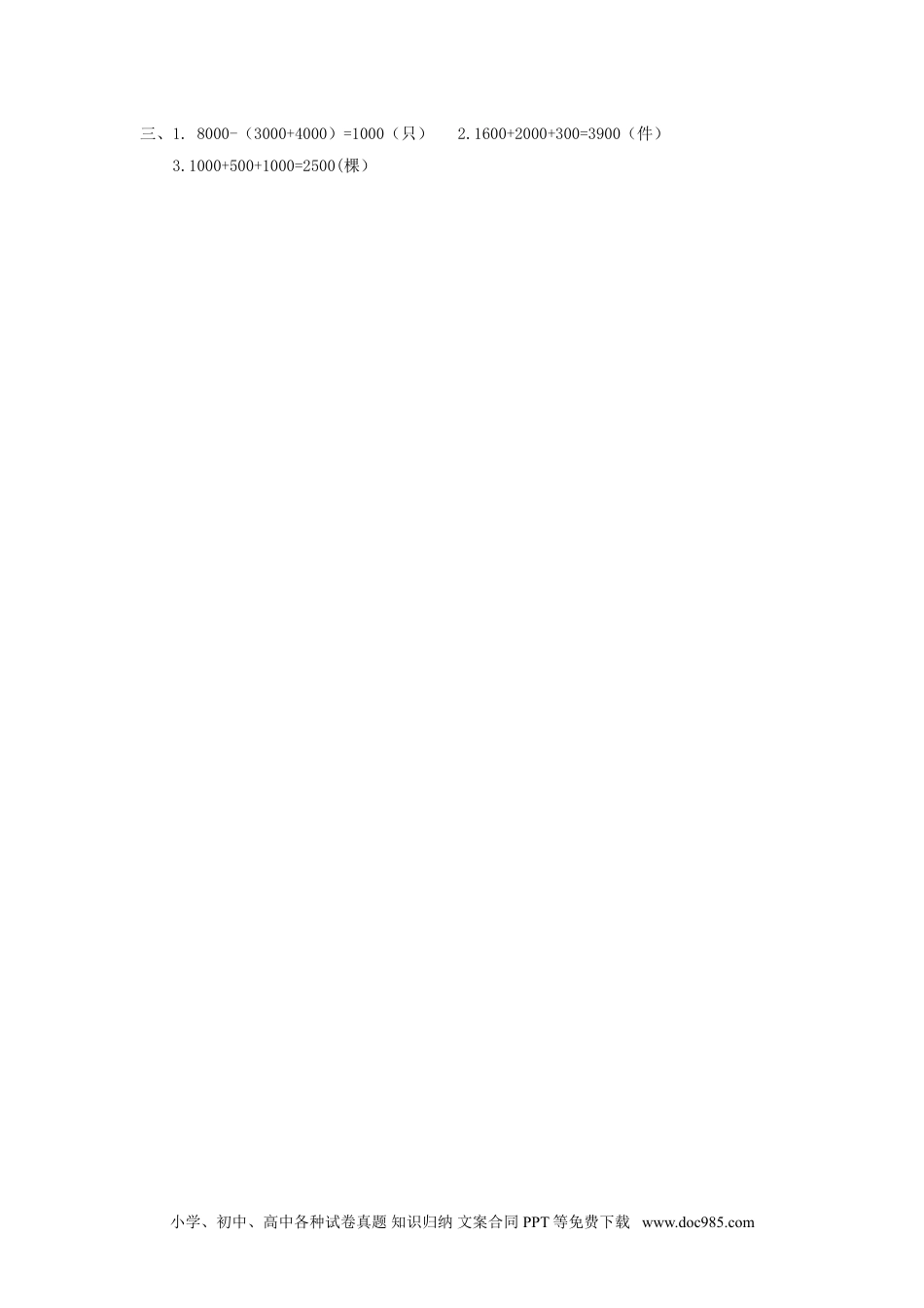第八课时整十整百整千数的加减法一、填空。1.70里面有()个十,260里面有()个十。2.600里面有()个百,1200里面有()个百。3.14个十是(),14个百是()。4.5个百加3个百是()个百;5个千加3个千是()个千。5.16个百加2个百是()个百,写作()。6.13个百减5个百是()个百,写作()。二、口算下面各题。400+500=200+400=3000+4000=800-500=4600+300=1700-400=7800-800=3400-3000=60+90=180-80=2600+4000=700+800=三、应用题。1.养鸭场养鸭8000只,昨天上午卖出3000只,下午卖出4000只.还剩下多少只?2.玩具厂要加工一批玩具,第一个星期加工了1600件,第二个星期加工了2000件,还要加工3000件玩具才能完成任务。共要加工玩具多少件?3、丹江口国家级森林公园去年植树1000棵,今年比去年多植树500棵。一共植树多少棵?答案:一、1.7262.6123.141404.885.1818006.8800二、900600700030049001300700040015010066001500小学、初中、高中各种试卷真题知识归纳文案合同PPT等免费下载www.doc985.com三、1.8000-(3000+4000)=1000(只)2.1600+2000+300=3900(件)3.1000+500+1000=2500(棵)小学、初中、高中各种试卷真题知识归纳文案合同PPT等免费下载www.doc985.com