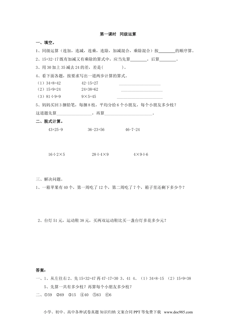第一课时同级运算一、填空。1、同级运算(连加,连减,连乘,连除,加减混合,乘除混合)按的顺序算。2、15+32-17既有加减又有乘除的算式中,应当先算,后算。3、用30加上35减去24的差,差是()。4、看下面各题,按要求写出一道两步计算的算式。(1)34+8=4242-15=27____________________(2)15+9=2424+38=62____________________(3)81÷9=99×5=45______________________5、妈妈买回3捆铅笔,每捆8枝,平均分给6个小朋友,每个小朋友多少枝?这道题先算_________________,再算_______________________。二、脱式计算。43+25-936-23+5646-7-2416÷2×528÷4×94×9÷6三、解决问题。1、一箱苹果有40个,第一周吃了12个,第二周吃了7个,箱子里还剩下多少个?2、台灯51元,运动鞋38元,买两双运动鞋比买一盏台灯多花多少元?答案:一、1、从左往右2、先15+32=47再47-17=303、414、(1)34+8-15(2)15+9+385、先算一共有多少枝?再算每个小朋友多少枝?二、596915④40⑤63⑥6小学、初中、高中各种试卷真题知识归纳文案合同PPT等免费下载www.doc985.com三、1.40-12-7=11(个)2.38+38-51=25(元)小学、初中、高中各种试卷真题知识归纳文案合同PPT等免费下载www.doc985.com