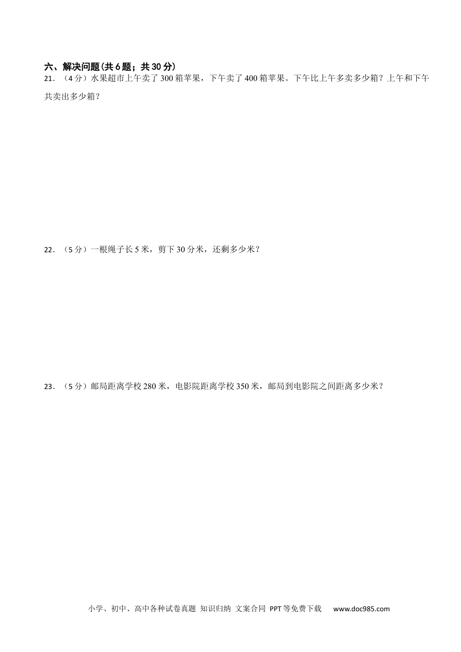 小学、初中、高中各种试卷真题知识归纳文案合同PPT等免费下载www.doc985.com期中综合测试卷(1~4单元)(试题)-2024-2025学年人教版三年级上册数学一、单选题(共5题;共15分)1.(3分)一根铁丝长508米,第一次用去了361米,第二次用去了129米。现在这根铁丝比原来短了多少米?正确的列式是()。A.B.C.2.(3分)下面这些数中最接近5000的是()。A.4999B.5009C.59993.(3分)做减法时,十位不够减,从()位退1.A.个B.十C.百4.(3分)学校操场跑道1圈200米,跑()圈为1千米。A.4B.5C.505.(3分)小林离学校300米,小明离学校500米,小林家、小明家和学校在一条直路上,小林和小明家相距()。A.800米B.200米C.800米或200米二、判断题(共5题;共10分)6.(2分)李老师乘火车1小时行驶110米。()7.(2分)1吨重的石头和1000千克的棉花一样重。()8.(2分)同一把尺子上,刻度1到刻度4之间的长度和刻度4到刻度7之间的长度是不一样的。()9.(2分)比最小的五位数少1的数是1000。()10.(2分)10个100米是1000千米。()三、填空题(共7题;共22分)11.(3分)称量大卡车满载货物的重量,一般用做单位,称量一条黄金项链的重量,用做单位。12.(3分)310比250多;比512多69。13.(3分)一块手表原价300元,现价278元,现在比原来便宜元。14.(4分)在横线上填入“>”“<”或“=”。2米7毫米4米41分米700米+300米9千米10个100千克1吨15.(3分)比435多65的数是;700比409多;316比少188。小学、初中、高中各种试卷真题知识归纳文案合同PPT等免费下载www.doc985.com16.(3分)小明在计算一个数减去443时,错把被减数的百位和个位上的数字互换了,结果得166,请你帮他算一算,正确的结果是。17.(3分)植物园在上一年累计植树320棵,比今年多30棵,植物园今年植树棵。四、计算题(共2题;共18分)18.(10分)口算77-35=82-46=43+38=320+80=592+149≈670+28=145-55=87-29=290+102=645-247≈19.(8分)列竖式计算。253+405=128+257=695+154=564+527=五、操作题(共1题;共5分)20.(5分)画一条比1分米短50毫米的线段.小学、初中、高中各种试卷真题知识归纳文案合同PPT等免费下载www.doc985.com六、解决问题(共6题;共30分)21.(4分)水果超市上午卖了300箱苹果,下午卖了400箱苹果。下午比上午多卖多少箱?上午和下午共卖出多少箱?22.(5分)一根绳子长5米,剪下30分米,还剩多少米?23.(5分)邮局距离学校280米,电影院距离学校350米,邮局到电影院之间距离多少米?小学、初中、高中各种试卷真题知识归纳文案合同PPT等免费下载www.doc985.com24.(5分)购物。(1)(2分)张阿姨有200元,买了一副羽毛球拍,还剩多少元?(2)(3分)剩下的钱能买几把剪刀?还剩多少元?25.(6分)载重量为4吨的卡车每次的运费是450元,载重量为2吨的卡车每次的运费是300元,总共要运10吨钢材。(1)(2分)只用载重量4吨的卡车运这批钢材,需要运费多少钱?(2)(2分)只用载重量2吨的卡车运这批钢材,需要运费多少钱?(3)(2分)同时用这两辆车来运,至少需要多少钱?26.(5分)电影院一共有400个座位。某小学女生有127人,男生有266人。如果学校组织这些学生一起去看电影,能全部坐下吗?小学、初中、高中各种试卷真题知识归纳文案合同PPT等免费下载www.doc985.com答案部分1.C2.A3.C4.B5.C6.错误7.正确8.错误9.错误10.错误11.吨;克12.60;58113.2214.>;<;<;=15.500;291;50416.46317.29018.77-35=4282-46=3643+38=81320+80=400592+149≈750670+28=698145-55=9087-29=58290+102=392645-247≈40019.解:253+405=658128+257=385小学、初中、高中各种试卷真题知识归纳文案合同PPT等免费下载www.doc985.com695+154=849564+527=109120.解:因为1分米=10厘米,50毫米=5厘米,所以要画的线段长:105﹣=5(厘米);如图所示:21.解:400-300=100(箱)300+400=700(箱)答:下午比上午多卖100箱,上午和下午共卖出700箱。22.解:5米=50分米50-30=20(分米)答:还剩20分米。23.解:①280+350=630(米)②350-280=70(米...
