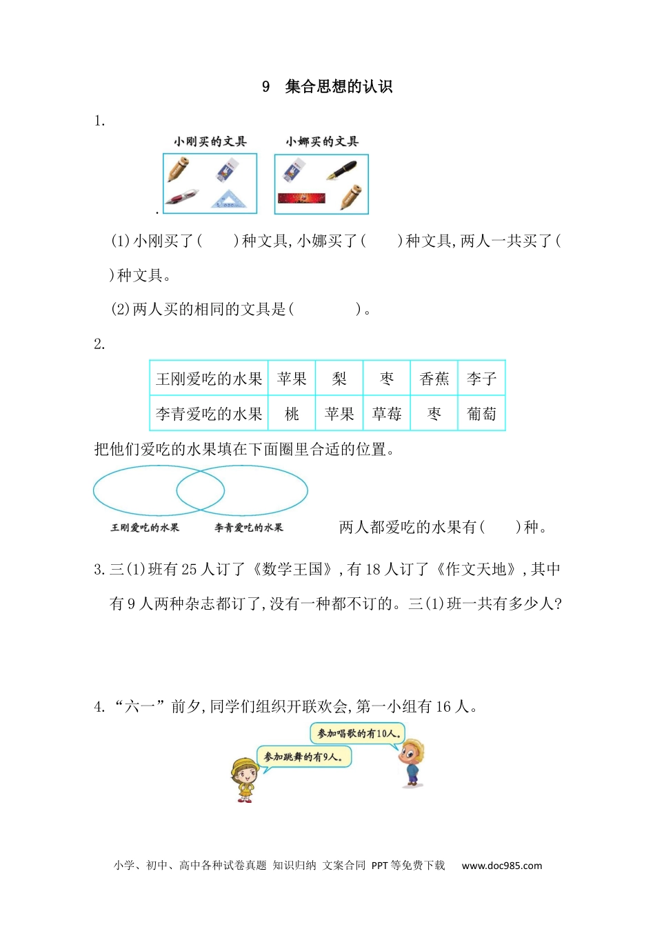 小学、初中、高中各种试卷真题知识归纳文案合同PPT等免费下载www.doc985.com9集合思想的认识1..(1)小刚买了()种文具,小娜买了()种文具,两人一共买了()种文具。(2)两人买的相同的文具是()。2.王刚爱吃的水果苹果梨枣香蕉李子李青爱吃的水果桃苹果草莓枣葡萄把他们爱吃的水果填在下面圈里合适的位置。两人都爱吃的水果有()种。3.三(1)班有25人订了《数学王国》,有18人订了《作文天地》,其中有9人两种杂志都订了,没有一种都不订的。三(1)班一共有多少人?4.“六一”前夕,同学们组织开联欢会,第一小组有16人。小学、初中、高中各种试卷真题知识归纳文案合同PPT等免费下载www.doc985.com如果有3名同学两个节目都不参加,两种节目都参加的有多少人?5.三(3)班有28人去过西湖,有20人去过长城,其中有9人两个地方都去了,没有一个地方都没去过的。三(3)班一共有多少人?答案:1.(1)446(2)橡皮和铅笔2.梨香蕉李子苹果枣桃草莓葡萄23.25+18-9=34(人)4.16-3=13(人)10+9-13=6(人)5.28+20-9=39(人)