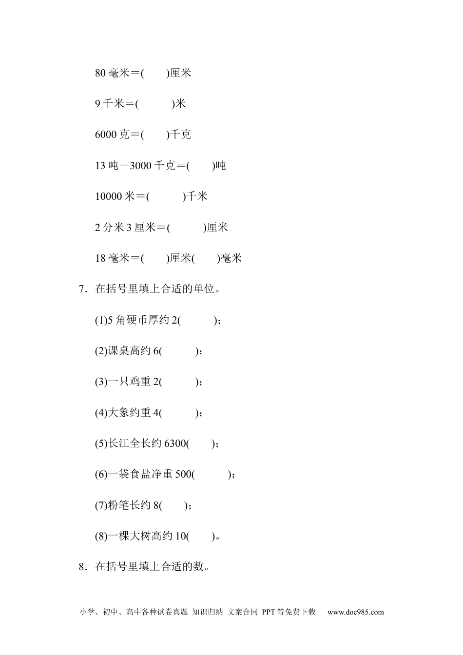 小学、初中、高中各种试卷真题知识归纳文案合同PPT等免费下载www.doc985.com第三单元过关检测卷一、我会填。(每空1分,共35分)1.从刻度0到刻度3的长度是()厘米,也可以说是()毫米;从刻度1到刻度()的长度是60毫米。2.图中钥匙的长是()毫米;铅笔的长是()厘米()毫米。3.一名三年级学生的体重是35(),身高是130()。4.我家距离学校大约有()米,步行大约需要()分钟。5.一辆载质量3()的卡车,运载每箱15()的苹果,这些苹果个儿挺大的,每个有200()重。6.1米=()分米=()厘米小学、初中、高中各种试卷真题知识归纳文案合同PPT等免费下载www.doc985.com80毫米=()厘米9千米=()米6000克=()千克13吨-3000千克=()吨10000米=()千米2分米3厘米=()厘米18毫米=()厘米()毫米7.在括号里填上合适的单位。(1)5角硬币厚约2();(2)课桌高约6();(3)一只鸡重2();(4)大象约重4();(5)长江全长约6300();(6)一袋食盐净重500();(7)粉笔长约8();(8)一棵大树高约10()。8.在括号里填上合适的数。小学、初中、高中各种试卷真题知识归纳文案合同PPT等免费下载www.doc985.com(1)沿着400米长的环形跑道跑()圈是2千米。(2)一名同学的体重是20千克,()名这样重的同学重1吨。(3)飞机每小时飞行800千米,2小时飞行()千米。(4)一头小牛重500千克,()头这样的牛重1吨。二、我是小法官。(对的画“√”,错的画“×”)(每题2分,共10分)1.相邻长度单位之间的进率均为10。()2.你的拇指宽大约100毫米。()3.1吨的石头肯定比1000千克棉花重。()4.一只鸡蛋约重50千克。()5.人每分钟走约70米。()三、选择题。(将正确答案的字母填在括号里)(每题2分,共12分)1.1千克与1千米比较,结果是()。A.1千克大B.1千米大C.同样大D.无法比较2.计量较重的物品或大宗物品的质量,通常用()作单位。小学、初中、高中各种试卷真题知识归纳文案合同PPT等免费下载www.doc985.comA.吨B.千米C.千克D.克3.《新编小学生字典》的厚度约是21()。A.千米B.米C.厘米D.毫米4.公共汽车两站之间的距离约是2000()。A.千米B.厘米C.分米D.米5.某地区的降水量约是50()。A.毫米B.厘米C.分米D.米6.一头大象重6吨60千克,合()。A.6600千克B.6060千克C.6006千克D.66千克四、按要求答题。(1、2题各5分,3、4题各8分,共26分)1.将下列两组数量按从大到小的顺序排列。(1)400厘米30米20分米1千米(2)1吨8000克1750千克45千克小学、初中、高中各种试卷真题知识归纳文案合同PPT等免费下载www.doc985.com2.分一分,并按从小到大的顺序填一填。(要求用字母表示的形式来填)千米克吨毫米分米千克米厘米3.画一画。(1)画一条长64毫米的线段。(2)画一条比5厘米少5毫米的线段。(3)画一条比1分米多2厘米的线段。小学、初中、高中各种试卷真题知识归纳文案合同PPT等免费下载www.doc985.com(4)先量一量,再算一算。三角形的三条边一共长()毫米,合()厘米。4.算一算,填一填。2米-8分米=()分米46厘米+34厘米=()分米5千米-3000米=()米98毫米-48毫米=()厘米650千克+350千克=()吨5吨-2000千克=()吨4厘米+8毫米=()毫米6千米-4500米=()米五、解决问题。(5题5分,其余每题3分,共17分)1.还剩多少毫米?小学、初中、高中各种试卷真题知识归纳文案合同PPT等免费下载www.doc985.com2.有一根长1分米的火腿肠,小明吃了6厘米长的一截,妈妈把剩下的每5毫米切成一片,一共可以切几片?3.星期天,小红到小华家做作业。小红走到学校门口,发现作业本忘在家中,立即返回家中取作业本,再到小华家。小红一共走了多少米?小学、初中、高中各种试卷真题知识归纳文案合同PPT等免费下载www.doc985.com4.一辆汽车载质量是4吨,仓库里有4台机器,每台机器重900千克,能一次运完吗?5.有13吨货物,怎样派车,运费最少?答案一、1.33072.51343.千克厘米4.略5.吨千克克小学、初中、高中各种试卷真题知识归纳文案合同PPT等免费下载www.doc985.com6.10100890006101023187.(1)毫米(2)分米(3)千克(4)吨(5)千米(6)克(7)厘米(8)米8.(1)5(2)50(3)1600(4)2二、1.×2.×3.×4.×5.√三、1.D2.A3.D4.D5.A6.B四、1.(1)1千米>30米>400厘米>20...