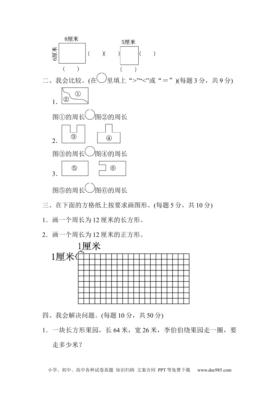 小学、初中、高中各种试卷真题知识归纳文案合同PPT等免费下载www.doc985.com教材过关卷(7)一、我会填空。(5~9题每空2分,其余每空1分,共31分)1.四边形有4条()的边,有()个角。2.长方形和正方形都是()边形,都有4个()角。长方形的()边相等,正方形的()边相等。3.()图形一周的长度,是它的()。4.用6个边长1分米的小正方形拼成一个长方形,这个长方形的周长是()分米或()分米。5.下图是一个长方形。(1)若在图中画一个最大的正方形,这个正方形的边长是()厘米。(2)剩下的图形是一个长方形,长是()厘米,宽是()厘米。6.将一根围成长方形的铁丝围成一个正方形(铁丝无剩余),这个正方形和长方形的()相等。7.一个正方形的边长是4厘米,它的周长是()厘米;一个正方形的周长是4厘米,它的边长是()厘米。8.正方形的周长是它边长的()倍。9.一个长方形的长和宽的和是7厘米,它的周长是()厘米。10.填出各边的长度。小学、初中、高中各种试卷真题知识归纳文案合同PPT等免费下载www.doc985.com二、我会比较。(在里填上“>”“<”或“=”)(每题3分,共9分)1.图①的周长图②的周长2.图③的周长图④的周长3.图⑤的周长图⑥的周长三、在下面的方格纸上按要求画图形。(每题5分,共10分)1.画一个周长为12厘米的长方形。2.画一个周长为12厘米的正方形。四、我会解决问题。(每题10分,共50分)1.一块长方形果园,长64米,宽26米,李伯伯绕果园走一圈,要走多少米?小学、初中、高中各种试卷真题知识归纳文案合同PPT等免费下载www.doc985.com2.这个花圃的边长是多少米?3.一个长方形的宽是3分米,长是宽的4倍,这个长方形的长是多少?周长是多少?小学、初中、高中各种试卷真题知识归纳文案合同PPT等免费下载www.doc985.com4.张奶奶靠墙用篱笆围了一块长8米,宽5米的长方形菜地,至少需要多少米长的篱笆?5.一张长方形纸长40厘米,宽25厘米,从这张纸上剪下一个最大的正方形。正方形的周长是多少厘米?剩下图形的周长是多少厘米?小学、初中、高中各种试卷真题知识归纳文案合同PPT等免费下载www.doc985.com答案一、1.直42.四直对四条3.封闭周长4.14105.(1)4(2)426.周长7.1618.49.1410.二、1.=2.>3.<三、1.略。2.略。四、1.(64+26)×2=180(米)2.32÷2=16(米)16÷4=4(米)3.3×4=12(分米)(12+3)×2=30(分米)4.8+5×2=18(米)5.正方形周长:25×4=100(厘米)剩下图形的周长:(40-25+25)×2=80(厘米)
