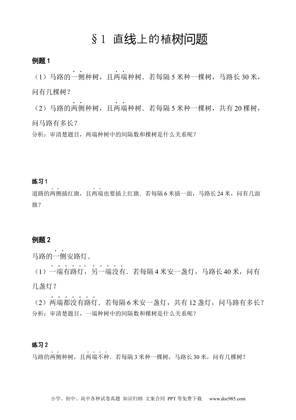 第五讲植树问题小学、初中、高中各种试卷真题知识归纳文案合同PPT等免费下载www.doc985.com这两讲我们将要学习一个新的问题——间隔问题.植树问题是间隔问题中重要的一种,像这样间隔数目和端点数目不同的情况我们在日常生活中会遇到很多,这一讲我们就主要来解决这类问题.对于植树问题而言,主要分为两类,第一类是直线上的植树问题,第二类是环线上的植树问题.下面先来讲讲直线上的植树问题.对于一条线段来说,两边的端点是特殊的地方,需要尤其注意.小学、初中、高中各种试卷真题知识归纳文案合同PPT等免费下载www.doc985.com§1直上的植线树问题例题1(1)马路的一侧种树,且两端种树.若每隔5米种一棵树,马路长30米,问有几棵树?(2)马路的两侧种树,且两端种树.若每隔5米种一棵树,共有20棵树,问马路有多长?分析:审清楚题目,两端种树中的间隔数和棵树是什么关系呢?练习1道路的两侧插红旗,且两端也要插上红旗.若每隔6米插一面,马路长24米,问有几面旗?例题2马路的一侧安路灯.(1)一端有路灯,另一端没有.若每隔4米安一盏灯,马路长40米,问有几盏灯?(2)两端都没有路灯.若每隔6米安一盏灯,共有12盏灯,问马路有多长?分析:审清楚题目,一端种树中的间隔数和棵树是什么关系呢?练习2马路的两侧种树,且两端不种.若每隔3米种一棵树,马路长30米,问有几棵树?北路东路西路北路西路小学、初中、高中各种试卷真题知识归纳文案合同PPT等免费下载www.doc985.com例题3有如图三条马路.现在要在马路的一侧种树,且每条马路的两端都种树.已知北路长40米,东路和西路分别长80米.每隔5米种一棵树,问共种几棵树?分析:试着一条路一条路的求出有几棵树?并且把树画一画?练习3在如图两条马路的一侧安路灯,且每条马路的两端都没有路灯.若每隔9米安一盏路灯,一共安了20盏路灯.已知北路长81米,问西路长多少米?§2上的植环线树问题除了一条直线上的间隔问题之外,环形的排列也会存在间隔,先来看一个示意图:2端点2间隔3端点3间隔4端点4间隔5端点5间隔小学、初中、高中各种试卷真题知识归纳文案合同PPT等免费下载www.doc985.com从图中不难看出,在环形上间隔数和端点数是相同的.例题4学校有一个圆形水池,(1)水池外的周长为40米.如果绕着水池每隔4米种一棵树,一共要种几棵树?(2)水池内的周长为30米.如果绕着水池内共有10个换水孔,且相邻两个换水孔的距离相等,问相邻的两个换水孔间的距离是多少米?分析:环形植树中,间隔数和棵树之间什么关系?练习4鸟巢外一周共有1000米,绕着鸟巢的一周有灯和树木,(1)如果每两盏灯之间的距离是5米,问鸟巢外一周有几盏灯?(2)如果鸟巢外共有250棵树,且相邻两棵树的距离相等,问相邻两棵树的距离是多少?例题510个男生沿着300米的跑道站成一圈,并且相邻两人之间的距离都相等.现在,每相邻两个男生之间又加入了两个女生,相邻两人之间的距离还是相等.请问:一共加入了多少个女生?加入女生后,相邻两人之间的距离又是多少米?分析:试着求出站好男生后有多少个间隔?每个间隔中加入2个女生后一共有多少人?50中点中点35课堂内外小学、初中、高中各种试卷真题知识归纳文案合同PPT等免费下载www.doc985.com例题6如下图所示,有一个长方形的“田”字道路,整个长方形的长为100米、宽为70米.现在需要在所有道路上种树,相邻两棵树之间的距离都相等,而且可以拐弯的地点(顶点或中点)都要种上树,那么最少要种多少棵树?分析:试着求出每条线上种几棵数?交点处要额外注意,加重了要去掉,少加了记得加上.小学、初中、高中各种试卷真题知识归纳文案合同PPT等免费下载www.doc985.com小学、初中、高中各种试卷真题知识归纳文案合同PPT等免费下载www.doc985.com作业小学、初中、高中各种试卷真题知识归纳文案合同PPT等免费下载www.doc985.com1.一条长500米的路的两边都要种树,并且两头都要种,如果每隔5米种一棵树,请问一共要种多少棵树?2.一条路的一边种树,并且两头都不种树,如果每隔12米种一棵树,(1)共种了6棵,请问马路长多少米?(2)若马路长120米,则种了多少棵树?3.有如图三条马路,长度...