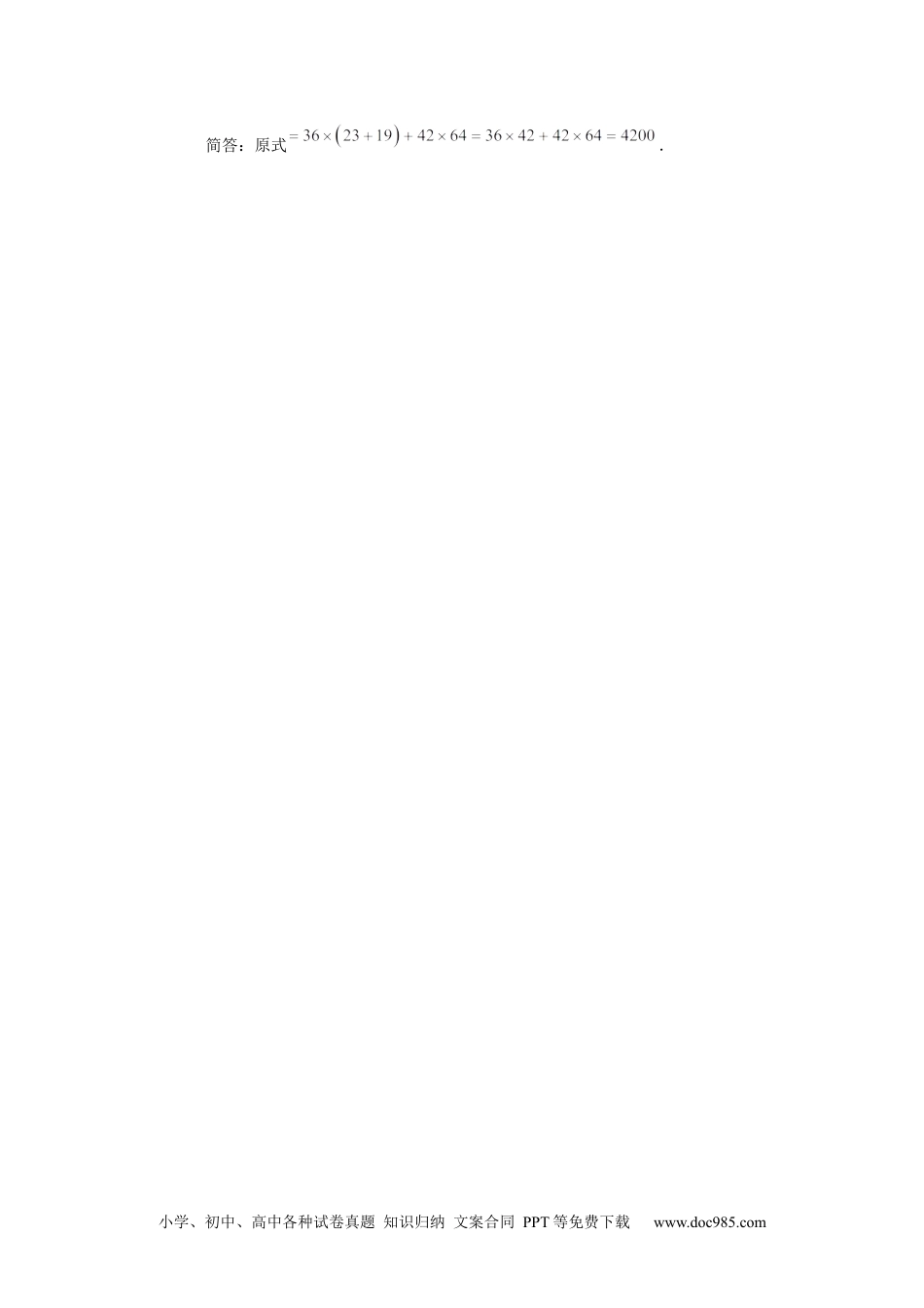 小学、初中、高中各种试卷真题知识归纳文案合同PPT等免费下载www.doc985.com第十一乘法分配律讲1.例题1答案:(1)1100;(2)9000详解:(1);(2).2.例题2答案:(1)3168;(2)8787详解:(1);(2).3.例题3答案:(1)4700;(2)5600详解:(1);(2).4.例题4答案:2300详解:原式.5.例题5答案:(1)99;(2)2900详解:(1)原式;(2)原式.6.例题6答案:1500详解:原式.7.练习1答案:(1)350;(2)2250简答:(1);(2).8.练习2答案:(1)2450;(2)176176简答:(1);小学、初中、高中各种试卷真题知识归纳文案合同PPT等免费下载www.doc985.com(2).9.练习3答案:(1)2400;(2)520简答:(1);(2).10.练习4答案:(1)680;(2)0简答:(1)原式;(2)原式.11.作业1答案:180简答:原式.12.作业2答案:2856简答:原式.13.作业3答案:2300简答:原式.14.作业4答案:3400简答:原式.15.作业5答案:4200小学、初中、高中各种试卷真题知识归纳文案合同PPT等免费下载www.doc985.com简答:原式.