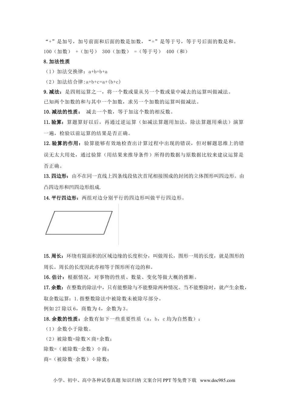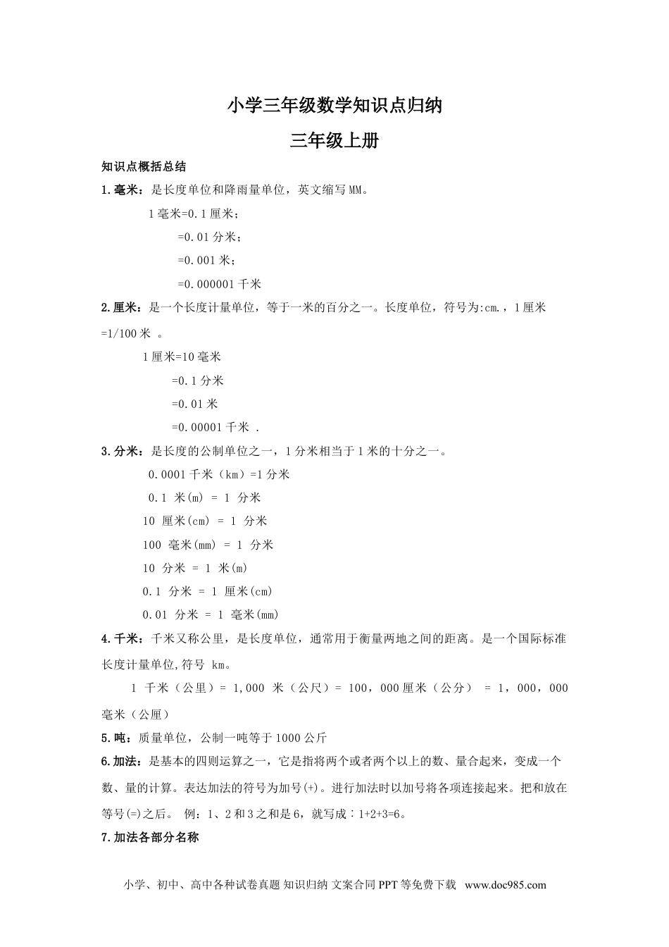 小学三年级数学知识点归纳三年级上册知识点概括总结1.毫米:是长度单位和降雨量单位,英文缩写MM。1毫米=0.1厘米;=0.01分米;=0.001米;=0.000001千米2.厘米:是一个长度计量单位,等于一米的百分之一。长度单位,符号为:cm.,1厘米=1/100米。1厘米=10毫米=0.1分米=0.01米=0.00001千米.3.分米:是长度的公制单位之一,1分米相当于1米的十分之一。0.0001千米(km)=1分米0.1米(m)=1分米10厘米(cm)=1分米100毫米(mm)=1分米10分米=1米(m)0.1分米=1厘米(cm)0.01分米=1毫米(mm)4.千米:千米又称公里,是长度单位,通常用于衡量两地之间的距离。是一个国际标准长度计量单位,符号km。1千米(公里)=1,000米(公尺)=100,000厘米(公分)=1,000,000毫米(公厘)5.吨:质量单位,公制一吨等于1000公斤6.加法:是基本的四则运算之一,它是指将两个或者两个以上的数、量合起来,变成一个数、量的计算。表达加法的符号为加号(+)。进行加法时以加号将各项连接起来。把和放在等号(=)之后。例:1、2和3之和是6,就写成︰1+2+3=6。7.加法各部分名称小学、初中、高中各种试卷真题知识归纳文案合同PPT等免费下载www.doc985.com“+”是加号,加号前面和后面的数是加数,“=”是等于号,等于号后面的数是和。100(加数)+(加号)300(加数)=(等于号)400(和)8.加法性质(1)加法交换律:a+b=b+a(2)加法结合律:a+b+c=a+(b+c)9.减法:是四则运算之一,将一个数或量从另一个数或量中减去的运算叫做减法。已知两个加数的和与其中一个加数,求另一个加数的运算叫做减法。10.减法的性质:减去一个数,等于加这个数的相反数。11.验算:算题算好以后,再通过逆运算(如减法算题用加法,除法算题用乘法)演算一遍,检验以前运算的结果是否正确。12.验算的作用:验算能够有效地检查出计算过程中出现的错误,但对解题思维上的错误无太大用处,通过验算(用结果来推导条件)所得的数据与原数据比较来建议运算是否正确。13.四边形:由不在同一直线上四条线段依次首尾相接围成的封闭的立体图形叫四边形。由凸四边形和凹四边形组成.14.平行四边形:两组对边分别平行的四边形叫做平行四边形。15.周长:环绕有限面积的区域边缘的长度积分,叫做周长,图形一周的长度,就是图形的周长。周长的长度因此亦相等于图形所有边的和。16.估计:根据情况,对事物的性质、数量、变化等做大概的推断。17.余数:在整数的除法中,只有能整除与不能整除两种情况。当不能整除时,就产生余数,取余数运算:1.指整数除法中被除数未被除尽部分。例如27除以6,商数为4,余数为3。18.余数的性质:余数有如下一些重要性质(a,b,c均为自然数):(1)余数小于除数。(2)被除数=除数×商+余数;除数=(被除数-余数)÷商;商=(被除数-余数)÷除数;小学、初中、高中各种试卷真题知识归纳文案合同PPT等免费下载www.doc985.com余数=被除数-除数×商。19.秒:时间单位时间单位秒(second)是国际单位制中时间的基本单位,符号是s。20.分:时间单位,等于1/60小时,或60秒21.乘法:是指将相同的数加法起来的快捷方式。其运算结果称为积22.乘法算式中各数的名称“×”是乘号,乘号前面和后面的数叫做因数,“=”是等于号,等于号后面的数叫做积。10(因数)×(乘号)200(因数)=(等于号)2000(积)23.分数:把单位“1”平均分成若干份,表示这样的一份或几份的数叫分数。表示这样的一份的数叫分数单位。分子在上分母在下,也可以把它当做除法来看,用分子除以分母,相反乘法也可以改为用分数表示。24.分数线、分子、分母分数中间的一条横线叫做分数线,分数线上面的数叫做分子,分数线下面的数叫做分母。读作几分之几。分数可以表述成一个除法算式:如二分之一等于1除以2。其中,1分子等于被除数,-分数线等于除号,2分母等于除数,而0.5分数值则等于商。25.分数由来分数在我们中国很早就有了,最初分数的表现形式跟现在不一样。后来,印度出现了和我国相似的分数表示法。再往后,阿拉伯人发明了分数线,分数的表示法就成为现在这样了。200多年前,瑞士数学家欧拉,在《通用算术》一书中说,要想把7米长的一根绳子分成三等份是不可...