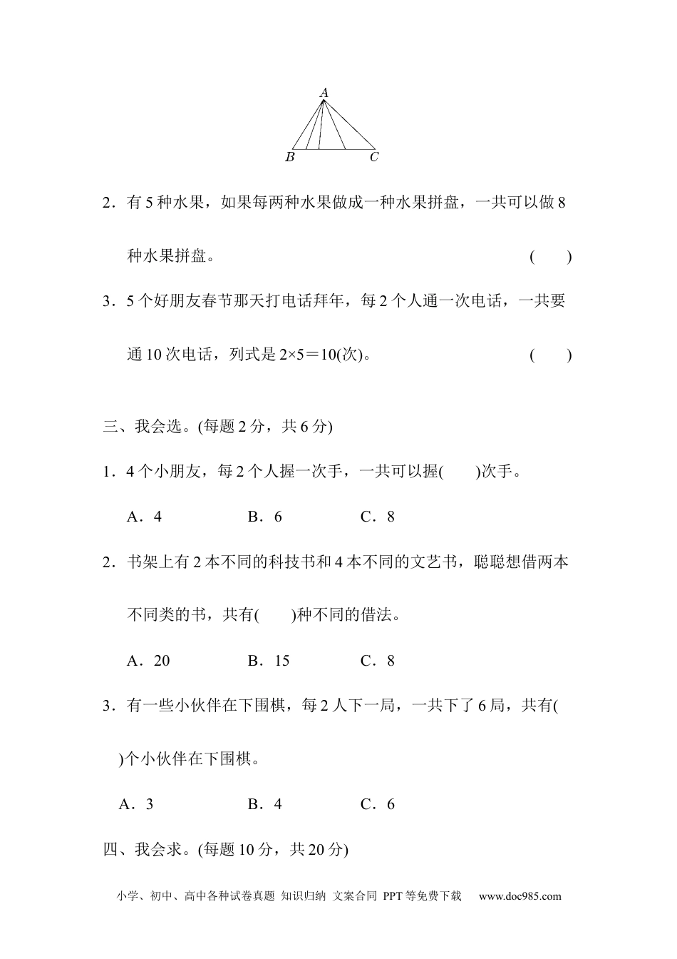 小学、初中、高中各种试卷真题知识归纳文案合同PPT等免费下载www.doc985.com期末总复习重难点突破卷2巧妙搭配一、我会填。(每题4分,共28分)1.用0、1、3、5可组成()个没有重复数字的两位数。2.用4、7、9组成的没有重复数字的两位数有()个。3.用4、3、0、9组成的没有重复数字且个位是单数的两位数有()个。4.四个好朋友聚会,如果每两人合1张影,一共需要合()张影。5.数一数,下面图中共有()条线段。6.有6个人参加乒乓球小组赛,如果每2个人比赛1场,一共要比赛()场。7.今天学校的早餐有3种粥,4种主食。乐乐从粥和主食中各选一种搭配自己的早餐,一共有()种不同的搭配方法。二、我会辨。(对的画“√”,错的画“×”)(每题2分,共6分)1.求下图中一共有多少个三角形,列式是4+1=5(个)。()小学、初中、高中各种试卷真题知识归纳文案合同PPT等免费下载www.doc985.com2.有5种水果,如果每两种水果做成一种水果拼盘,一共可以做8种水果拼盘。()3.5个好朋友春节那天打电话拜年,每2个人通一次电话,一共要通10次电话,列式是2×5=10(次)。()三、我会选。(每题2分,共6分)1.4个小朋友,每2个人握一次手,一共可以握()次手。A.4B.6C.82.书架上有2本不同的科技书和4本不同的文艺书,聪聪想借两本不同类的书,共有()种不同的借法。A.20B.15C.83.有一些小伙伴在下围棋,每2人下一局,一共下了6局,共有()个小伙伴在下围棋。A.3B.4C.6四、我会求。(每题10分,共20分)小学、初中、高中各种试卷真题知识归纳文案合同PPT等免费下载www.doc985.com1.下面的鞋子和帽子有多少种不同的搭配方式?连一连。2.每两人握一次手,一共握了多少次手?五、走进生活,解决问题。(每题8分,共40分)1.每次取2张,取出的钱共有哪几种情况?请写出来。2.要从3名男同学和2名女同学中各选出1人代表学校参加“少儿小学、初中、高中各种试卷真题知识归纳文案合同PPT等免费下载www.doc985.com戏曲大赛”,有多少种不同的组队方案?3.欢欢从文具店到体育场一共有多少条路线?4.如果一辆客运汽车从杭州到北京共要停靠5个车站(包括杭州和北京),一共要为这条线路准备多少种不同的车票?(考虑往返)(杭州—上海—苏州—南京—北京)5.友谊第一,比赛第二。小学、初中、高中各种试卷真题知识归纳文案合同PPT等免费下载www.doc985.com(1)动物运动会上,5名运动员互相握手问好,一共要握几次手?(2)接下来,它们进行乒乓球单打比赛,每2只动物都要比赛一场,一共要安排几场呢?小学、初中、高中各种试卷真题知识归纳文案合同PPT等免费下载www.doc985.com答案一、1.92.63.4[点拨]个位只能是3、9。4.65.10[点拨]列式是4+3+2+1=10(条)。6.15[点拨]列式是5+4+3+2+1=15(场)。7.12二、1.×2.×3.×三、1.B2.C3.B四、1.4×4=16(种)答:有16种不同的搭配方式。2.4+3+2+1=10(次)答:一共握了10次手。五、1.取出的钱有:5元1角、5元5角、6元、1元1角、1元5角、小学、初中、高中各种试卷真题知识归纳文案合同PPT等免费下载www.doc985.com6角,共6种。2.3×2=6(种)答:有6种不同的组队方案。3.3×2×2=12(条)答:欢欢从文具店到体育场一共有12条路线。4.4+3+2+1=10(种)10×2=20(种)答:一共要为这条线路准备20种不同的车票。5.(1)4+3+2+1=10(次)答:一共要握10次手。(2)4+3+2+1=10(场)答:一共要安排10场。