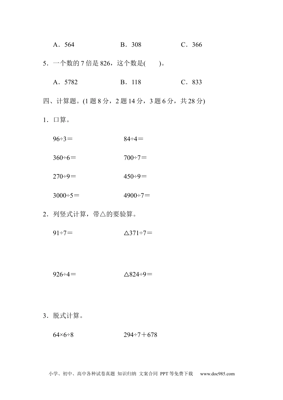 小学、初中、高中各种试卷真题知识归纳文案合同PPT等免费下载www.doc985.com教材过关卷(2)一、填空题。(每空1分,共16分)1.口算240÷6时,可以把240看作()个十,再除以6,得到()个十,即();也可以这样想:()×6=240,所以240÷6=()。2.7的()倍是126,279是3的()倍。3.45×6+4=274,274÷6的余数是()。4.A÷9=24……,里最大能填(),这时A等于()。5.584÷4的商的最高位是()位,商是()。6.在里填上“>”“<”或“=”。68÷291÷764÷464÷245÷563÷790÷3600÷6二、判断题。(每题2分,共10分)1.84÷6和98÷7的商相等。()小学、初中、高中各种试卷真题知识归纳文案合同PPT等免费下载www.doc985.com2.三位数除以一位数,商一定是三位数。()3.因为48×6+12=300,所以300÷6=48……12。()4.要使574÷的商的最高位是十位,里最小应填6。()5.小丁6分钟跑846米,小力4分钟跑568米,小力跑得快。()三、选择题。(每题2分,共10分)1.除数是一位数的除法,要从被除数的()算起。A.任意一位B.最低位C.最高位2.78÷6,要使商是三位数,里可以填()。A.1、2、3、4、5B.6、7、8、9C.5、6、7、8、93.在366÷6、454÷3、218÷3、756÷3中,商是两位数的算式有()道。A.1B.2C.34.下列各数除以6,有余数的是()。小学、初中、高中各种试卷真题知识归纳文案合同PPT等免费下载www.doc985.comA.564B.308C.3665.一个数的7倍是826,这个数是()。A.5782B.118C.833四、计算题。(1题8分,2题14分,3题6分,共28分)1.口算。96÷3=84÷4=360÷6=700÷7=270÷9=450÷9=3000÷5=4900÷7=2.列竖式计算,带△的要验算。91÷7=△371÷7=926÷4=△824÷9=3.脱式计算。64×6÷8294÷7+678小学、初中、高中各种试卷真题知识归纳文案合同PPT等免费下载www.doc985.com五、解决问题。(4题12分,其余每题6分,共36分)1.三年级有男生103人,女生97人。如果每5名学生分一组,能分成多少组?2.这本书小刚四周能看完吗?3.平均每筐苹果重多少千克?4.买文具。小学、初中、高中各种试卷真题知识归纳文案合同PPT等免费下载www.doc985.com(1)李老师用238元刚好买了上面的一种文具,用114元刚好买了另一种文具,李老师买了什么?各买了多少?(2)如果李老师用这些钱买文具盒,可以买多少个?5.张老师不小心把买体育用品的发票弄脏了,你能算出排球每个多少钱吗?物品单价数量总价足球56元4个排球元3个320元小学、初中、高中各种试卷真题知识归纳文案合同PPT等免费下载www.doc985.com答案一、1.2444040402.18933.44.82245.百1466.><=<二、1.√2.×3.×4.√5.√三、1.C2.B3.B4.B5.B四、1.32216010030506007002.(验算略)1353231……291……53.48720五、1.(103+97)÷5=40(组)2.225÷9=25(天)4×7=28(天)25<28能看完。3.268÷4=67(千克)4.(1)粉笔:238÷7=34(盒)日记本:114÷6=19(本)(2)(238+114)÷8=44(个)小学、初中、高中各种试卷真题知识归纳文案合同PPT等免费下载www.doc985.com5.56×4=224(元)320-224=96(元)96÷3=32(元)