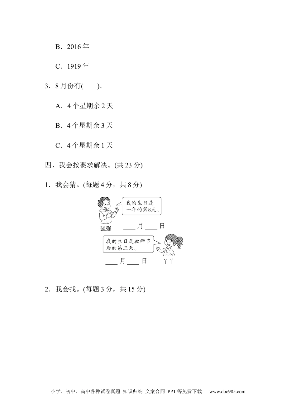 小学、初中、高中各种试卷真题知识归纳文案合同PPT等免费下载www.doc985.com期末总复习方法技能提升卷3巧求时间和日期一、我会填。(每题4分,共28分)1.小宇每天晚上8:30睡觉,第二天早上6:00起床,他睡了()小时()分钟。2.童童的书法培训从7月10日开始,8月10日结束,培训了()天。3.笑笑每次过生日都要种一棵“生日树”,她在16岁生日那天种下了第4棵生日树,她是()月()日出生的。4.电影院18:30开始放映电影,要想提前20分钟入场,入场时刻是()。5.明明16:40放学,17时10分到家,明明路上用了()分。6.一个主持人播音了40分钟,结束时间是20:30,他是从()开始播音的。7.观察下图,这段路禁止通行的时间是()小时。小学、初中、高中各种试卷真题知识归纳文案合同PPT等免费下载www.doc985.com二、我会辨。(对的画“√”,错的画“×”)(每题1分,共3分)1.平年和闰年只有二月份相差1天,其他每个月份的天数都相同。()2.一年中至少有365天,至多有366天。()3.一个科学考察队乘船去考察,5月30日出发,7月12日返回。算这次考察用了多少天,要算上出发的那一天和返回的那一天。()三、我会选。(每题2分,共6分)1.16时用普通计时法表示为()。A.4时B.下午16时C.下午4时2.下面是闰年的是()。A.1800年小学、初中、高中各种试卷真题知识归纳文案合同PPT等免费下载www.doc985.comB.2016年C.1919年3.8月份有()。A.4个星期余2天B.4个星期余3天C.4个星期余1天四、我会按要求解决。(共23分)1.我会猜。(每题4分,共8分)2.我会找。(每题3分,共15分)小学、初中、高中各种试卷真题知识归纳文案合同PPT等免费下载www.doc985.com(1)这是()年()月的日历。(2)这个月有()天,植树节是星期()。(3)消费者权益日是()月()日,这天是星期()。(4)二十四节气中的“春分”是()月()日。(5)这个月的第一天的前一天是()月()日,这天是星期()。五、走进生活,解决问题。(每题10分,共40分)1.2018年的儿童画展从1月1日开始到3月8日结束,共展出了多少天?小学、初中、高中各种试卷真题知识归纳文案合同PPT等免费下载www.doc985.com2.2018年9月9日是星期日,10月9日是星期几?3.博物馆全天开放多长时间?4.15:10开始比赛,进行了175分钟,请你算出比赛结束的时刻。小学、初中、高中各种试卷真题知识归纳文案合同PPT等免费下载www.doc985.com答案一、1.9302.323.2294.18:105.306.19:507.13二、1.√2.√3.√三、1.C2.B3.B[点拨]8月份有31天,用31÷7=4(个)……3(天)。四、1.189132.(1)20173(2)31日(3)315三(4)320(5)228二五、1.31+28+8=67(天)答:共展出了67天。[点拨]1月是大月,有31天,2018年是平年,2月只有28天,小学、初中、高中各种试卷真题知识归纳文案合同PPT等免费下载www.doc985.com画展展出包括3月8日这一天,因此,列式为31+28+8。2.31÷7=4(个)……3(天)答:10月9日是星期二。3.12:00-9:00=3(小时)16:30-14:00=2小时30分3小时+2小时30分=5小时30分答:博物馆全天开放5小时30分。4.175分=2小时55分15时10分+2小时55分=18时05分答:比赛结束的时刻是18时05分。