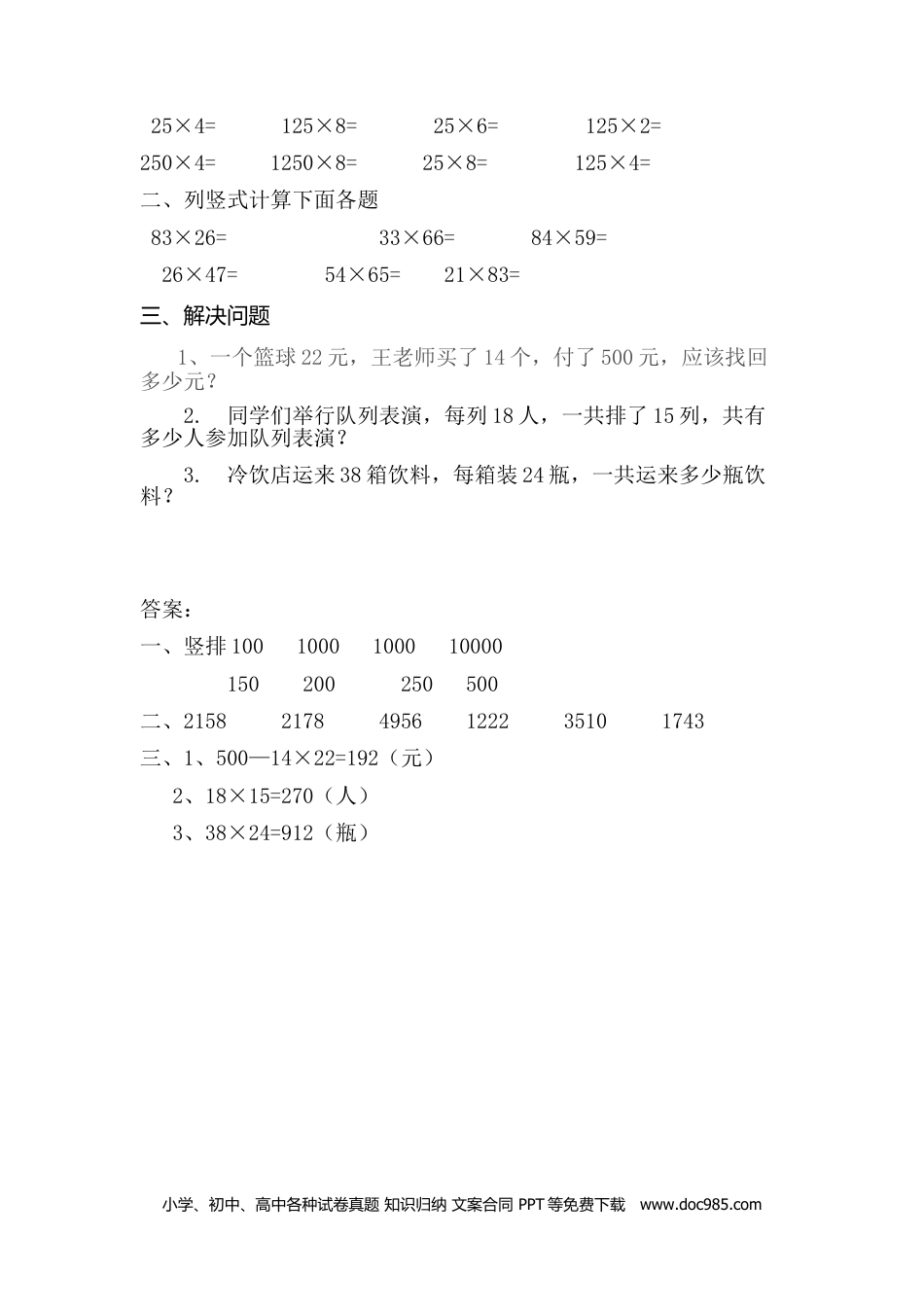 4.2笔算乘法(一)一、填空1、21个14的和是();24的32倍是()。2.、14乘63的积是();16个45相加,和是多少?最简便列式是(),结果是()。3、小明在计算完37×62后,想核实计算的结果是否正确,可以用()×()来进行检验。二、列竖式计算下面各题(带#的要验算)54×25=#21×44=#66×77=三、文字题1、36的35倍是多少?2、15个32是多少?四、应用题1、工厂平均每天要用51吨煤,42天共用多少吨煤?2、初步调查:我班同学平均每人的压岁钱是85元,那么我班共53名同学的压岁钱共有多少元?答案:一、1、2947682、88216×457203、62×37二、13509245082三、36×35=126015×32=480四、1、51×42=2142(吨)2、85×53=4505(元)4.2笔算乘法(二)一、先口算,再熟记这些口算答案。小学、初中、高中各种试卷真题知识归纳文案合同PPT等免费下载www.doc985.com25×4=125×8=25×6=125×2=250×4=1250×8=25×8=125×4=二、列竖式计算下面各题83×26=33×66=84×59=26×47=54×65=21×83=三、解决问题1、一个篮球22元,王老师买了14个,付了500元,应该找回多少元?2.同学们举行队列表演,每列18人,一共排了15列,共有多少人参加队列表演?3.冷饮店运来38箱饮料,每箱装24瓶,一共运来多少瓶饮料?答案:一、竖排1001000100010000150200250500二、215821784956122235101743三、1、500—14×22=192(元)2、18×15=270(人)3、38×24=912(瓶)小学、初中、高中各种试卷真题知识归纳文案合同PPT等免费下载www.doc985.com