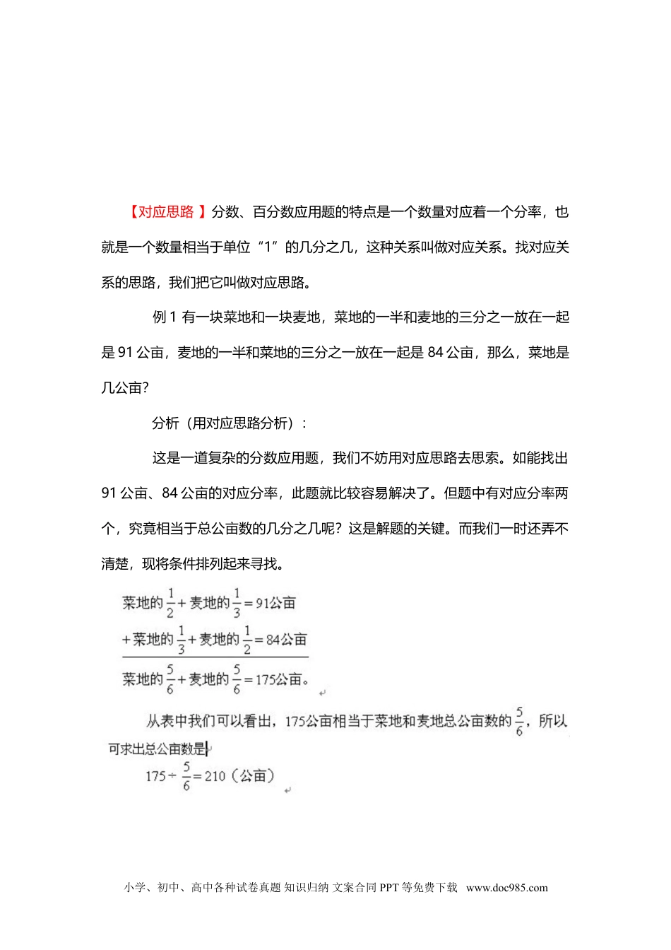 【对应思路】分数、百分数应用题的特点是一个数量对应着一个分率,也就是一个数量相当于单位“1”的几分之几,这种关系叫做对应关系。找对应关系的思路,我们把它叫做对应思路。例1有一块菜地和一块麦地,菜地的一半和麦地的三分之一放在一起是91公亩,麦地的一半和菜地的三分之一放在一起是84公亩,那么,菜地是几公亩?分析(用对应思路分析):这是一道复杂的分数应用题,我们不妨用对应思路去思索。如能找出91公亩、84公亩的对应分率,此题就比较容易解决了。但题中有对应分率两个,究竟相当于总公亩数的几分之几呢?这是解题的关键。而我们一时还弄不清楚,现将条件排列起来寻找。小学、初中、高中各种试卷真题知识归纳文案合同PPT等免费下载www.doc985.com求出总公亩数后,我们仍未找到菜地或麦地占总公亩数的几分之几,故还不能直接求出菜地或麦地的公亩数。但我们把条件稍作组合,就可以求出分析到这一步,那么再去求菜地有多少公亩,则就变成了一道很简单的分数应用题了。例2蓄水池有甲、丙两条进水管,和乙、丁两条排水管,要灌满一池水,单开甲管需要3小时,单开丙管需要5小时,要排完一池水,单开乙管顺序,循环各开水管,每次每管开一小时,问多少时间后水开始溢出水池?分析(用对应思路考虑):本题数量关系复杂,但仍属分数应用题,所以仍可用对应思路寻找解题途径。首先要找出甲、丙两管每小时灌水相当于一池水的几分之几,乙、丁两管每小时排水相当于一池水的几分之几,然后才能计算。小学、初中、高中各种试卷真题知识归纳文案合同PPT等免费下载www.doc985.com通过转化找到了对应分率就容易计算了。假设甲、乙、丙、丁四个水管按顺序各开1小时,共开4小时,池内灌进的水是全池的:也就是20小时以后,池内有水总共是多少时间后水开始溢出水池不就一目了然了吗?小学、初中、高中各种试卷真题知识归纳文案合同PPT等免费下载www.doc985.com