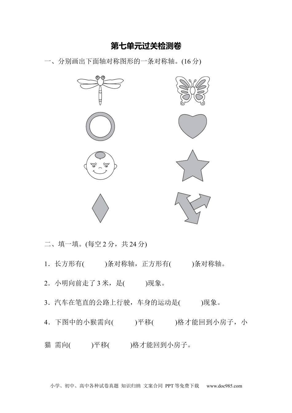 小学、初中、高中各种试卷真题知识归纳文案合同PPT等免费下载www.doc985.com第七单元过关检测卷一、分别画出下面轴对称图形的一条对称轴。(16分)二、填一填。(每空2分,共24分)1.长方形有()条对称轴,正方形有()条对称轴。2.小明向前走了3米,是()现象。3.汽车在笔直的公路上行驶,车身的运动是()现象。4.下图中的小猴需向()平移()格才能回到小房子,小猫需向()平移()格才能回到小房子。小学、初中、高中各种试卷真题知识归纳文案合同PPT等免费下载www.doc985.com5.下图中图形①先向()平移()格,再向()平移()格就到了图形②的位置。三、下面的图形各是从哪张纸上剪下来的?用线连一连。(4分)四、下面图形中,图形()是由图形①平移得到的。(3分)小学、初中、高中各种试卷真题知识归纳文案合同PPT等免费下载www.doc985.com五、计算下面各题,怎样简便就怎样计算。(3分)9.05+5.9+0.95+4.16.36-4.8-1.24.36+0.86-0.5626.8+(5.36-3.95)小学、初中、高中各种试卷真题知识归纳文案合同PPT等免费下载www.doc985.com24.36-(18.08-13.95)六、解决问题。(8题10分,其余每题4分,共38分)1.分别画出平行四边形向右平移5格和向下平移4格后得到的图形。2.画出下列图形先向下平移3格,再向右平移8格后的图形。3.图中的图形都是轴对称图形,请你画出它们的对称轴。小学、初中、高中各种试卷真题知识归纳文案合同PPT等免费下载www.doc985.com4.画出下列图形的另一半。(以虚线为对称轴)5.把图形向右平移7格后得到的图形涂上颜色。6.在一块长30m,宽14m的长方形草坪上有两条相交的小路,小路的宽为1m,那么草坪的面积是多少平方米?小学、初中、高中各种试卷真题知识归纳文案合同PPT等免费下载www.doc985.com7.下图中每个正方形的边长是4cm,求阴影部分的面积。8.(1)图①向()平移了()格。(2)图②是某个图形向左平移5格后得到的。你知道这个图形原来的位置吗?请你画出来。(3)画出图③的另一半,使它成为一个轴对称图形。(以粗虚线为对称小学、初中、高中各种试卷真题知识归纳文案合同PPT等免费下载www.doc985.com轴)(4)求图④的面积。小学、初中、高中各种试卷真题知识归纳文案合同PPT等免费下载www.doc985.com答案一、略二、1.242.平移3.平移4.左4上65.上2右6(或右6上2)三、四、⑤五、9.05+5.9+0.95+4.1=(9.05+0.95)+(5.9+4.1)=10+10=206.36-4.8-1.2=6.36-(4.8+1.2)=6.36-6=0.364.36+0.86-0.56=4.36+(0.86-0.56)=4.36+0.3=4.6626.8+(5.36-3.95)=26.8+1.41=28.21小学、初中、高中各种试卷真题知识归纳文案合同PPT等免费下载www.doc985.com24.36-(18.08-13.95)=24.36-4.13=20.23六、1.2.3.略4.5.6.(30-1)×(14-1)=377(m2)答:草坪的面积是377m2。7.4×4=16(cm2)答:阴影部分的面积是16cm2。8.(1)左6(2)(3)如下图:小学、初中、高中各种试卷真题知识归纳文案合同PPT等免费下载www.doc985.com(4)3×4=12(cm2)