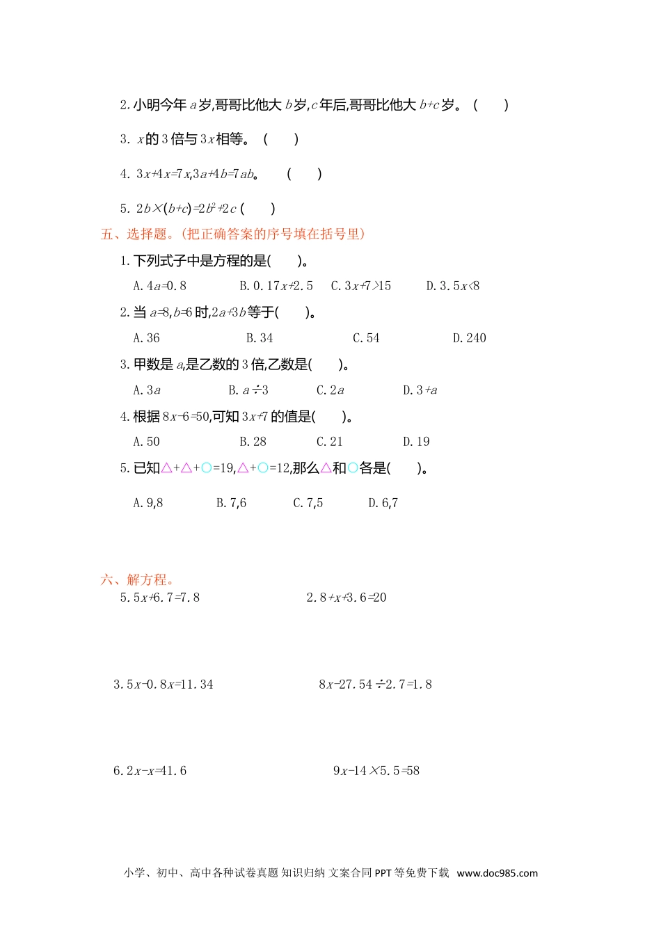 第五单元测试卷一、省略乘号写出下面各式。a×x=x×x=b×8=3×d=b×1=x×4=二、把左右两边意义相等的用直线连起来。a与a相乘a+2ba与a相加a2a的2倍2a+3a的二分之一2a比a的2倍多3的数a+aa与b的和的2倍a与b的2倍的和(a+b)×2三、填空题。1.货车每小时行skm,客车每小时行mkm,客车3小时和货车5小时一共行驶了()km。2.一辆公交车上有45名乘客,在大学城站下车a名,又上来b名,这时车上有乘客()名。3.每个足球x元,买4个足球,付出200元,应找回()元。4.当x=5时,x2=(),2x+8=()。5.a×(7+b),当a=5时,b=()才能使a×(7+b)=52.5。6.三个连续自然数,已知中间一个数是m,那么前一个数是(),后一个数是(),三数之和是()。四、判断题。(正确的画“√”,错误的画“✕”)1.方程一定是等式,等式不一定是方程。()小学、初中、高中各种试卷真题知识归纳文案合同PPT等免费下载www.doc985.com2.小明今年a岁,哥哥比他大b岁,c年后,哥哥比他大b+c岁。()3.x的3倍与3x相等。()4.3x+4x=7x,3a+4b=7ab。()5.2b×(b+c)=2b2+2c()五、选择题。(把正确答案的序号填在括号里)1.下列式子中是方程的是()。A.4a=0.8B.0.17x+2.5C.3x+7>15D.3.5x<82.当a=8,b=6时,2a+3b等于()。A.36B.34C.54D.2403.甲数是a,是乙数的3倍,乙数是()。A.3aB.a÷3C.2aD.3+a4.根据8x-6=50,可知3x+7的值是()。A.50B.28C.21D.195.已知△+△+○=19,△+○=12,那么△和○各是()。A.9,8B.7,6C.7,5D.6,7六、解方程。5.5x+6.7=7.82.8+x+3.6=203.5x-0.8x=11.348x-27.54÷2.7=1.86.2x-x=41.69x-14×5.5=58小学、初中、高中各种试卷真题知识归纳文案合同PPT等免费下载www.doc985.com七、看图列方程。1.2.八、解决问题。1.中山路每盏路灯要装5个灯泡,这条路一共需要160个灯泡,那么这条路一共有多少盏路灯?2.一架遥控飞机现价128元,比原价便宜了23元,这架遥控飞机原价多少元?3.2010年我国人均国内生产总值为29940元,比1978年的78倍还多222元。1978年我国人均国内生产总值是多少元?4.学校举行书画竞赛,四、五年级共有75人获奖,其中五年级获奖人数是四年级的1.5倍,四、五年级各有多少人获奖?小学、初中、高中各种试卷真题知识归纳文案合同PPT等免费下载www.doc985.com5.小明家、学校和小红家在同一条直线上,小明家到小红家的路程有560m。小明和小红同时从家出发相向而行去上学,7分钟后同时到达学校门口。小明平均每分钟走45m,小红平均每分钟走多少米?第五单元测试卷参考答案小学、初中、高中各种试卷真题知识归纳文案合同PPT等免费下载www.doc985.com一、axx28b3db4x二、提示:左边对应的式子分别为a2、a+a、2a、、2a+3、(a+b)×2、a+2b。连线略。三、1.5s+3m2.45-a+b3.200-4x4.25185.3.56.m-1m+13m四、1.√2.✕3.√4.✕5.✕五、1.A2.B3.B4.B5.C六、x=0.2x=13.6x=4.2x=1.5x=8x=15七、1.3x+16=91x=252.4x=180x=45八、1.解:设这条路一共有x盏路灯。5x=160x=322.解:设这架遥控飞机原价x元。x-23=128x=1513.解:设1978年我国人均国内生产总值是x元。78x+222=29940x=3814.解:设四年级有x人获奖。x+1.5x=75x=301.5x=455.解:设小红平均每分钟走xm。7(x+45)=560x=35小学、初中、高中各种试卷真题知识归纳文案合同PPT等免费下载www.doc985.com