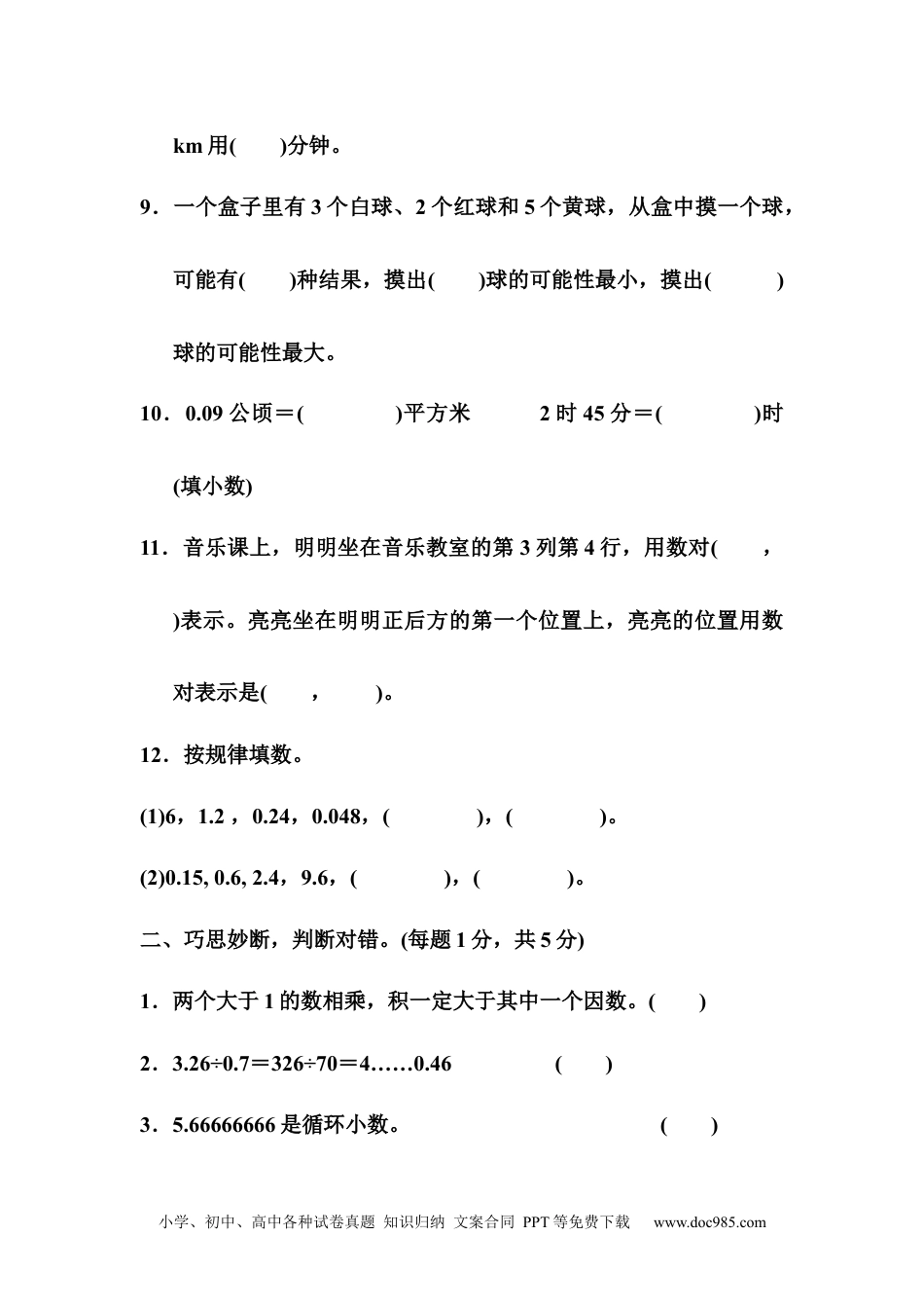 小学、初中、高中各种试卷真题知识归纳文案合同PPT等免费下载www.doc985.com人教版数学五年级上册期中达标测试卷一、认真读题,专心填写。(5、9题每空0.5分,其余每空1分,共24分)1.根据18×68=1224,可知180×0.068=(),12.24÷6.8=()。2.4.343÷0.43的商的最高位是()位,结果是()。3.3÷11的商用循环小数简便记法表示是(),保留两位小数约是()。4.6.23×2.07的积有()位小数,保留两位小数约是()。5.不计算,在里填上“>”“<”或“=”。5.18÷0.985.180.9×1.081.0840.9÷0.2540.9×0.256.若1欧元可兑换人民币7.96元,那么100欧元可兑换人民币()元,100元人民币可兑换()欧元(保留两位小数)。7.一个数的小数点向右移动一位后,比原数大29.7,原数是()。8.李叔叔7.2分钟跑完1.44km,平均每分钟跑()km,平均跑1小学、初中、高中各种试卷真题知识归纳文案合同PPT等免费下载www.doc985.comkm用()分钟。9.一个盒子里有3个白球、2个红球和5个黄球,从盒中摸一个球,可能有()种结果,摸出()球的可能性最小,摸出()球的可能性最大。10.0.09公顷=()平方米2时45分=()时(填小数)11.音乐课上,明明坐在音乐教室的第3列第4行,用数对(,)表示。亮亮坐在明明正后方的第一个位置上,亮亮的位置用数对表示是(,)。12.按规律填数。(1)6,1.2,0.24,0.048,(),()。(2)0.15,0.6,2.4,9.6,(),()。二、巧思妙断,判断对错。(每题1分,共5分)1.两个大于1的数相乘,积一定大于其中一个因数。()2.3.26÷0.7=326÷70=4……0.46()3.5.66666666是循环小数。()小学、初中、高中各种试卷真题知识归纳文案合同PPT等免费下载www.doc985.com4.一个整数除以小数,商一定比这个整数大。()5.抛一枚硬币,连续9次都是正面朝上,掷第10次一定是正面朝上。()三、反复比较,择优录取。(每题1分,共5分)1.下面各式中,商最大的算式是()。A.7.5÷0.125B.0.75÷1.25C.75÷12.52.0.51÷0.4,商是1.2,余数是()。A.3B.0.3C.0.033.在运动会上,刘燕跑1.5km用了9分钟。刘燕跑1km平均需要()分钟。A.0.17B.6C.13.54.在3.12,3.012,3.12这三个数中,最大的数是()。A.3.12B.3.012C.3.125.集福箱中有一些大小、形状相同的福卡,要使摸到和谐福的可能小学、初中、高中各种试卷真题知识归纳文案合同PPT等免费下载www.doc985.com性最大,摸到友善福的可能性最小,还有可能摸到爱国福,集福箱中至少要装()张福卡。A.3B.5C.6四、注意审题,细心计算。(29分)1.直接写出得数。(每题0.5分,共5分)4.8÷0.06=0.36÷4=0.15×4=8.5-0.24=0.24÷0.6=80×0.5=1.2÷0.5=1.6+0.04=4×0.9×2.5=0.1×0.1÷0.1×0.1=2.列竖式计算。(每题2分,共12分)18.4×3.2=46.92÷2.3=22.3÷1.7≈(精确到百分位)3.28÷16=1.5÷9.9=5.72×0.18≈(用循环小数表示商)(得数保留一位小数)小学、初中、高中各种试卷真题知识归纳文案合同PPT等免费下载www.doc985.com3.脱式计算。(怎样简便就怎样算)(每题2分,共12分)1.83+3.17×1.2101×5.78-5.780.26×2.5+0.74×2.51.25×3.2×2.520.5÷12.5÷0.81.25×(0.8+10)五、心灵手巧,动手操作。(3题3分,其余每题2分,共7分)1.学校的位置是(,)。从学校往西200m,再往南100m就是()。2.小轩家在学校以北200m,再往东300m处;赵越家在学校以东小学、初中、高中各种试卷真题知识归纳文案合同PPT等免费下载www.doc985.com200m,再往北200m处。在图中标出他们两家的位置。3.上周日,小轩从家出发后回家前的行动路线是(5,4)→(2,3)→(4,3),她去的地方依次是()、()、()。六、走进生活,解决问题。(每题5分,共30分)1.1kg花生仁可榨油0.45kg。(1)64kg花生仁可榨油多少千克?(2)要榨0.36t花生油,需要花生仁多少千克?小学、初中、高中各种试卷真题知识归纳文案合同PPT等免费下载www.doc985.com2.五(1)班56名师生照集体照,照相馆的收费标准是:拍照一次,并送4张照片,收费15元,加印一张2.5元。现在要保证每人有一张照片,一共要付多少钱?3.媛媛家装修新房,客厅长7.9m,宽4.5m。现在要铺上正方形地砖,至少需要多少块这样的地砖?(不考虑损耗)...