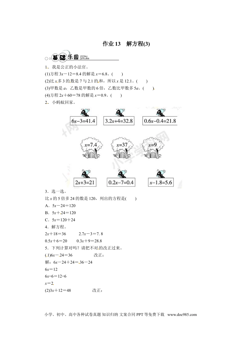 作业13解方程(3)1.我是公正的小法官。(1)方程3x-12=8.4的解是x=6.8。()(2)比x多3的数是7与2.1的和,所以x是12.1。()[来源:学,科,网Z,X,X,K](3)甲数是a,乙数是甲数的6倍,乙数比甲数多5a。()(4)方程2x+60=78的解是x=0.9。()2.小蚂蚁回家。[来源:学科网]3.选一选。比x的5倍多24的数是120,列出的方程是()A.5x-24=120B.5x+24=120C.5x=120+24[来源:学+科+网Z+X+X+4.解方程。2x+18=362.7x-3=7.80.5x+6=200.3x+9=28.85.下列计算对吗?请把不对的改正过来。[来源:学科网ZXXK][来源:学科网](1)6x-24=36改正:解:6x-24+24=36-246x=126x÷6=12÷6x=2(2)3x+12=48改正:小学、初中、高中各种试卷真题知识归纳文案合同PPT等免费下载www.doc985.com解:3x÷3+12=48÷3x+12=16x+12-12=16-12[来源:学&科&网][来源:Zxxk.Com]x=4[来源:Z。xx。k.Com]6.一张发票被撕掉一角,你能算出每支钢笔多少钱吗?(列方程解答。)7.方程ax-4.6=0.4与18x+2.4=6的解相同,求a-1.6的值.小学、初中、高中各种试卷真题知识归纳文案合同PPT等免费下载www.doc985.com参考答案1.(1)√(2)×(3)√(4)×2.略[来源:Zxxk.Com]3.B4.x=9x=4x=28x=665.(1)×x=10(2)×x=126.设每支钢笔x元,则4x+2.60×5+7.20=38.2x=4.57.18x+2.4=6,x=0.20.2a-4.6=0.4,a=25a-1.6=23.4[来源:Z_xx_k.Com]小学、初中、高中各种试卷真题知识归纳文案合同PPT等免费下载www.doc985.com