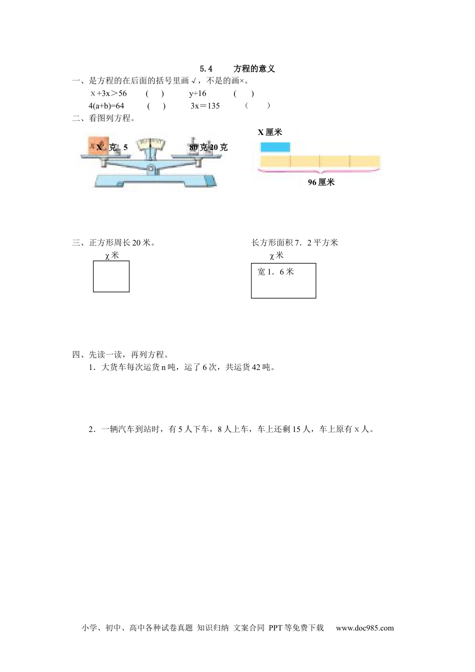 小学、初中、高中各种试卷真题知识归纳文案合同PPT等免费下载www.doc985.com5.4方程的意义一、是方程的在后面的括号里画√,不是的画×。ⅹ+3ⅹ>56()y÷16()4(a+b)=64()3ⅹ=135()二、看图列方程。三、正方形周长20米。长方形面积7.2平方米χ米χ米四、先读一读,再列方程。1.大货车每次运货n吨,运了6次,共运货42吨。2.一辆汽车到站时,有5人下车,8人上车,车上还剩15人,车上原有ⅹ人。96厘米X厘米宽1.6米80克20克X克5克小学、初中、高中各种试卷真题知识归纳文案合同PPT等免费下载www.doc985.com答案:一、××√√二、x+5=80+204x=96三、4x=201.6x=7.2四、1.6n=422.X-5+8=15