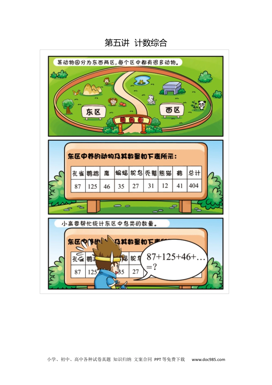 小学、初中、高中各种试卷真题知识归纳文案合同PPT等免费下载www.doc985.com第五讲计数综合小学、初中、高中各种试卷真题知识归纳文案合同PPT等免费下载www.doc985.com从三年级开始到现在,我们已经学了很多有关计数的讲次,其中包括枚举法、加乘原理、排列组合、容斥原理等.我们先来做一个简单的小结和复习.枚举法是万能的方法,只要有足够多的时间和精力.并且往往在一些复杂棘手的题目中,别的方法都不能适用,此时就能体会到枚举法的“威力”.使用枚举法时一定要注意有序思考.加法原理强调的是分类,计数时我们只需选择其中的某一类即可以满足要求,类与类之间可以相互替代.乘法原理强调的是分步,每一步只是整个事情的一部分,必须全部完成才能满足结论缺一不可.在乘法原理中,步骤顺序的安排往往非常重要.排列与组合:排列的计算公式由乘法原理推导而来,组合的计算公式由排列公式推导而来.从n个不同的元素中取出m个(),并按照一定的顺序排成一列,其方法数叫做从n个不同元素中取出m个的排列数,记作.从n个不同元素中取出m个()作为一组(不计顺序),可选择的方法数叫做从n个不同元素中取出m个的组合数,记作.在运用排列组合时,有特殊要求的我们往往优先考虑,有时还会用到“捆绑法”和“插空法”.我们今天主要来学习计数中的分类思想,以及正面分类和反面排除的合理选择.分类讨论是一种重要的数学思想方法,当问题所给对象不能进行统一研究时,就需要对研究的对象进行分类,将整体问题划分为局部问题,把复杂问题转化为单一问题,然后分而治之、各个击破,最后综合各类的结果得到整个问题的解答.例题1.五张卡片上分别写有0、1、2、3、5,每张卡片各用一次可以组成一些五位数.其中5的倍数有多少个?4的倍数有多少个?分析:一个数是5的倍数,它要满足什么条件?4的倍数呢?练习1.五张卡片上分别写有0、1、2、3、5,每张卡片只能用一次可以组成多少个三位偶数?小学、初中、高中各种试卷真题知识归纳文案合同PPT等免费下载www.doc985.com例题2.(1)用2个1、2个2和1个3可以组成多少个不同的五位数?(2)用1个0、2个1和2个2可以组成多少个不同的五位数?(3)用1个0、2个1和2个2可以组成多少个不同的四位数?分析:先选好1的位置,再选好2的位置,最后选好3的位置,就可以组成五位数.那么有多少种不同的选法?练习2.(1)用1个1、1个2、2个3可以组成多少个不同的四位数?(2)用1个0、1个2、2个3可以组成多少个不同的四位数?(3)用1个0、1个2、2个3可以组成多少个不同的三位数?例题3.数1447、1225、1031有某些相同的特点,每一个数都是以1为首的四位数,且每个数恰好只有两个数字相同(1112,1222,1122这样的数不算),这样的数共有多少个?分析:根据题意可知这样的四位数由三种数字组成,其中有一种数字出现了2次.那么可以根据这个数字所在的数位来分类.练习3.用1、2、3、4这4个数字组成四位数,至多允许有1个数字重复一次.例如1234、1233和2434是满足条件的,而1212、3331和4444就是不满足条件的.那么,所有这样的四位数共有多少个?例题4小学、初中、高中各种试卷真题知识归纳文案合同PPT等免费下载www.doc985.com和2468相加至少会发生一次进位的四位数有多少个?分析:和2486相加发生进位有好多种情况,比如发生一次进位、发生两次进位、发生三次进位等等,不同的类型太多了.这时不妨考虑下反面.练习4.和250相加至少会发生一次进位的三位数有多少个?例题5.有10名外语翻译,其中5名是英语翻译,4名日语翻译,另外1名英语和日语都很精通,从中找出7人,使他们可以组成两个翻译小组,其中4人翻译英语,另3人翻译日语,这两个小组能同时工作,则不同的分配方案共有多少种?分析:这个英语和日语都很精通的人很麻烦,应该优先考虑他.例题6.将右图中的“○”分别用四种颜色染色,只要求有实线段连接的两个相邻的“○”都涂成不同的颜色,共有多少种涂法?如果还要求虚线段连接的两个“○”也涂成不同的颜色,共有多少种涂法?分析:染色时顺序很重要,要遵循“前不影响后”的原则.小学、初中、高中各种试卷真题知识归纳文案合同PPT等...