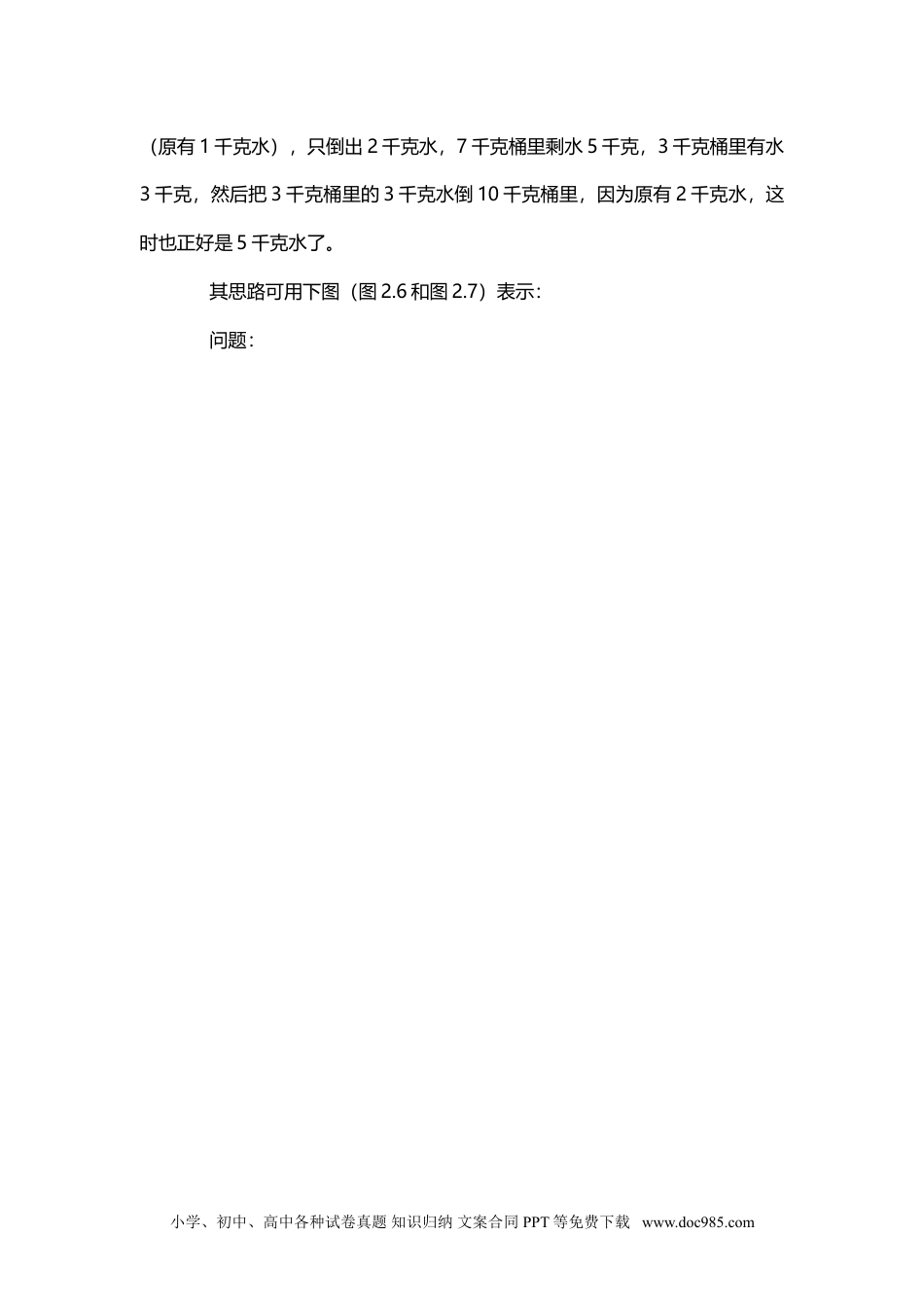 【一步倒推思路】顺向综合思路和逆向分析思路是互相联系,不可分割的。在解题时,两种思路常常协同运用,一般根据问题先逆推第一步,再根据应用题的条件顺推,使双方在中间接通,我们把这种思路叫“一步倒推思路”。这种思路简明实用。例1一只桶装满10千克水,另外有可装3千克和7千克水的两只空桶,利用这三只桶,怎样才能把10千克水分为5千克的两份?分析(用一步倒推思路考虑):(1)逆推第一步:把10千克水平分为5千克的两份,根据题意,关键是要找到什么条件?因为有一只可装3千克水的桶,只要在另一只桶里剩2千克水,利用3+2=5,就可以把水分成5千克一桶,所以关键是要先倒出一个2千克水。(2)按条件顺推。第一次:10千克水倒入7千克桶,10千克水桶剩3千克水,7千克水倒入3千克桶,7千克水桶剩4千克水,3千克水桶里有水3千克;第二次:3千克桶的水倒入10千克水桶,这时10千克水桶里有水6千克,把7千克桶里的4千克水倒入3千克水桶里,这时7千克水桶里剩水1千克,3千克水桶里有水3千克;第三次:3千克桶里的水倒入10千克桶里,这时10千克桶里有水9千克,7千克桶里的1千克水倒入3千克桶里,这时7千克桶里无水,3千克桶里有水1千克;第四次:10千克桶里的9千克水倒入7千克桶里,10千克水桶里剩下2千克水,7千克桶里的水倒入3千克桶里小学、初中、高中各种试卷真题知识归纳文案合同PPT等免费下载www.doc985.com(原有1千克水),只倒出2千克水,7千克桶里剩水5千克,3千克桶里有水3千克,然后把3千克桶里的3千克水倒10千克桶里,因为原有2千克水,这时也正好是5千克水了。其思路可用下图(图2.6和图2.7)表示:问题:小学、初中、高中各种试卷真题知识归纳文案合同PPT等免费下载www.doc985.com小学、初中、高中各种试卷真题知识归纳文案合同PPT等免费下载www.doc985.com例2今有长度分别为1、2、3……9厘米的线段各一条,可用多少种不同的方法,从中选用若干条线段组成正方形?分析(仍可用一步倒推思路来考虑):(1)逆推第一步。要求能用多少种不同方法,从中选用若干条线段组成正方形必须的条件是什么?小学、初中、高中各种试卷真题知识归纳文案合同PPT等免费下载www.doc985.com根据题意,必须知道两个条件。一是确定正方形边长的长度范围,二是每一种边长有几种组成方法。(2)从条件顺推。①因为九条线段的长度各不相同,所以用这些线段组成的正方形至少要7条,最多用了9条,这样就可以求出正方形边长的长度范围为(1+2+……②当边长为7厘米时,各边分别由1+6、2+5、3+4及7组成,只有一种组成方法。③当边长为8厘米时,各边分别由1+7、2+6、3+5及8组成,也只有一种组成方法。④当边长为9厘米时,各边分别由1+8、2+7、3+6及9;1+8、2+7、4+5及9;2+7、3+6、4+5及9;1+8、3+6、4+5及9;1+8、2+7、3+6及4+5共5种组成方法。⑤当边长为10厘米时,各边分别由1+9、2+8、3+7及4+6组成,也只有一种组成方法。⑤当边长为11厘米时,各边分别由2+9、3+8、4+7及5+6组成,也只有一种组成方法。⑥将上述各种组成法相加,就是所求问题了。此题的思路图如下(图2.8):问题:小学、初中、高中各种试卷真题知识归纳文案合同PPT等免费下载www.doc985.com小学、初中、高中各种试卷真题知识归纳文案合同PPT等免费下载www.doc985.com