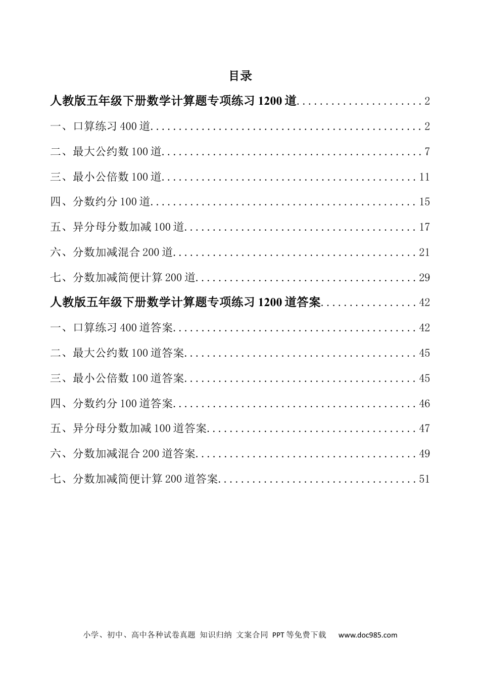小学、初中、高中各种试卷真题知识归纳文案合同PPT等免费下载www.doc985.com目录人教版五年级下册数学计算题专项练习1200道......................2一、口算练习400道................................................2二、最大公约数100道..............................................7三、最小公倍数100道.............................................11四、分数约分100道...............................................15五、异分母分数加减100道.........................................17六、分数加减混合200道...........................................21七、分数加减简便计算200道.......................................29人教版五年级下册数学计算题专项练习1200道答案.................42一、口算练习400道答案...........................................42二、最大公约数100道答案.........................................45三、最小公倍数100道答案.........................................45四、分数约分100道答案...........................................46五、异分母分数加减100道答案.....................................47六、分数加减混合200道答案.......................................49七、分数加减简便计算200道答案...................................51小学、初中、高中各种试卷真题知识归纳文案合同PPT等免费下载www.doc985.com人教版五年级下册数学计算题专项练习1200道一、口算练习400道(1)40÷8×7=(2)59+56÷8=(3)50×10=(4)5+4×6=(5)(10-4)×3=(6)8.8-4=(7)7×8-55=(8)(28-18)÷5=(9)(50-20)÷5=(10)25+16÷8=(11)64÷(95-87)=(12)(57-51)×7=(13)(14-8)×6=(14)(42-39)×9=(15)2×(25-16)=(16)63÷9×6=(17)91-82=(18)34-4×4=(19)16÷2+25=(20)20+4×2=(21)8×8+30=(22)7×9+5=(23)2×(63-59)=(24)12÷3×2=(25)63+77=(26)6.5+4.7=(27)52+26=(28)57+5×6=(29)8×(46-44)=(30)20+32÷4=(31)8÷(83-81)=(32)58+30÷6=(33)70+35÷7=(34)77+9×2=(35)30÷(46-41)=(36)99-15-20=(37)9×(99-94)=(38)10÷(56-51)=(39)18÷2×9=(40)20+31=(41)72÷9+13=(42)6×5+28=(43)0.47+0.9=(44)81÷9+86=(45)(72-70)×9=(46)6.6-2.2=(47)48÷(7+1)=(48)28+48=(49)32÷(5+3)=(50)(83-29)÷9=(51)43+7×3=(52)(74-67)×7=(53)54-36=(54)(56-42)÷7=(55)13+2×7=(56)54÷(41-35)=(57)6×(19-15)=(58)8×5+23=(59)4×4+73=(60)11+20÷5=(61)21÷7+6=(62)7.1-6.8=(63)(60-11)÷7=(64)4.5+2.7=(65)89-66+76=(66)15÷(53-48)=(67)0.98-0.34=(68)(25+11)÷6=(69)(80-70)÷2=(70)48÷6+20=(71)8.1+8.8=(72)11+48÷6=(73)56-54÷6=(74)1×13=(75)8.7-7=(76)78-32÷4=(77)(49-44)×6=(78)54÷(5+4)=(79)54÷9+48=(80)92-(33+49)=(81)21+67=小学、初中、高中各种试卷真题知识归纳文案合同PPT等免费下载www.doc985.com(82)(76-68)×5=(83)7×9+14=(84)354÷6=(85)25-6=(86)12÷4+42=(87)70+25=(88)(15+20)÷5=(89)(19+30)÷7=(90)9×(76-69)=(91)25-56÷8=(92)37+59=(93)7×(63-56)=(94)31+8÷2=(95)83+45÷9=(96)2×(3+5)=(97)45+17=(98)96+44=(99)12-9÷3=(100)212÷4=(101)40÷(87-82)=(102)5×9-38=(103)9÷(43-40)=(104)75+46-88=(105)5×4+67=(106)(32-28)×9=(107)22-2×6=(108)23-28÷7=(109)32+30÷6=(110)61-9×3=(111)(66-21)÷9=(112)53+13=(113)30÷(30-24)=(114)46+28=(115)27-(89-79)=(116)80÷20=(117)640÷80=(118)6×(33-28)=(119)45÷9+48=(120)81+55=(121)288÷9=(122)78-33=(123)20÷4×6=(124)25+2×7=(125)(2+7)×7=(126)18+18÷3=(127)(14+21)÷7=(128)15÷5+83=(129)35+3×8=(130)9-2×3=(131)71+6×4=(132)14+9×2=(133)(50-26)÷3=(134)0....