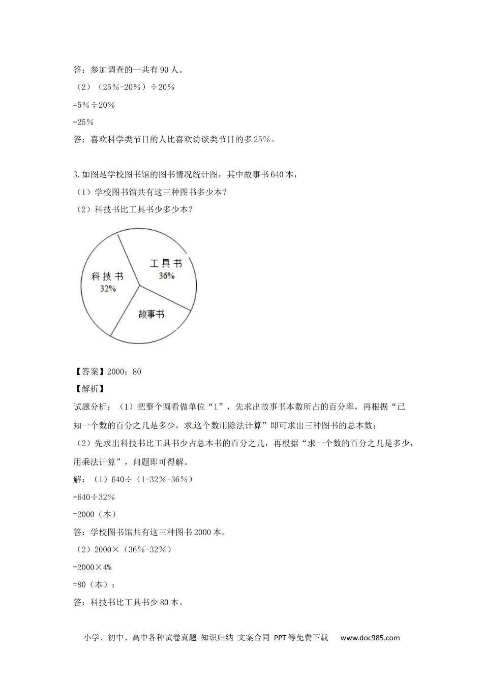 小学、初中、高中各种试卷真题知识归纳文案合同PPT等免费下载www.doc985.com第八单元数学广角第一课时数与形开心回顾1.()统计图能清楚地表示部分量与总量之间的关系。A.折线[来源:Zxxk.Com]B.条形C.扇形【答案】C【解析】试题分析:根据扇形统计图的特点:扇形统计图可以比较清楚地反映出部分与部分、部分与整体之间的数量关系;进而得出结论。解:由分析知:扇形统计图能清楚地表示部分量与总量之间的关系。[来源:Z§xx§k.Com]2.根据统计图解决下面的问题。(1)喜欢访谈类节目的有18人,那么参加调查的一共有多少人?(2)喜欢科学类节目的人比喜欢访谈类节目的多百分之几?【答案】90;25%【解析】试题分析:(1)喜欢访谈类的人数占总人数的20%,它对应的数量是18人,由此用除法求出总人数即可;(2)喜欢科学类的人数占总人数的25%,喜欢访谈类占总人数的20%,所以可用25%减去20%的差再除以20%进行计算即可。解:(1)18÷20%=90(人)小学、初中、高中各种试卷真题知识归纳文案合同PPT等免费下载www.doc985.com答:参加调查的一共有90人。(2)(25%-20%)÷20%=5%÷20%=25%答:喜欢科学类节目的人比喜欢访谈类节目的多25%。3.如图是学校图书馆的图书情况统计图,其中故事书640本,(1)学校图书馆共有这三种图书多少本?(2)科技书比工具书少多少本?【答案】2000;80【解析】试题分析:(1)把整个圆看做单位“1”,先求出故事书本数所占的百分率,再根据“已知一个数的百分之几是多少,求这个数用除法计算”即可求出三种图书的总本数;(2)先求出科技书比工具书少占总本书的百分之几,再根据“求一个数的百分之几是多少,用乘法计算”,问题即可得解。解:(1)640÷(1-32%-36%)=640÷32%=2000(本)答:学校图书馆共有这三种图书2000本。(2)2000×(36%-32%)=2000×4%=80(本);答:科技书比工具书少80本。小学、初中、高中各种试卷真题知识归纳文案合同PPT等免费下载www.doc985.com4.如图是乡村养殖场去年养的鸡、鸭、鹅的统计图,如果鸭是3500只,鹅和鸡各有多少只?【答案】2000;4500【解析】试题分析:鸭是3500只,扇形统计图中又提供了鸡、鸭、鹅所占的百分率,根据分数除法的意义,用除法列式求出即可求出鸡、鸭、鹅的总只数;再根据“求一个数的百分之几是多少,用乘法计算”,鸡、鹅各有多少只。解:3500÷35%=10000(只)10000×20%=2000(只)10000×45%=4500(只)答:鹅有2000只,鸡有4500只。5.如图是六年级学生最喜欢的节目情况统计图。喜欢相声的有40人,喜欢歌曲的有多少人?【答案】100【解析】试题分析:根据扇形统计图可知,喜欢相声的有40人,40人对应的百分数是10%,有分数除法意义,用40÷10%求出五年级学生总人数;再根据乘法的意义,用总人数乘以25%即可解答。解:40÷10%×25%=400×25%=100(人);小学、初中、高中各种试卷真题知识归纳文案合同PPT等免费下载www.doc985.com答:喜欢歌曲的有100人。课前导学学习目标1.通过观察、操作、归纳等活动,学生借助“形”来直观感受与“数”之间的关系,体会有时“形”与“数”能互相解释,并能借助“形”解决一些与“数”有关的问题。2.学生通过数与形结合来分析思考问题,从而感悟数形结合的思想,提高解决问题的能力。知识讲解【例题】按如下规律摆放三角形:则第(5)堆三角形的个数为()A.14B.15C.16D.17【答案】D【解析】试题分析:规律如下:(1)1+2+1×2=5(2)2+2+2×2=8(3)3+2+3×2=11…(5)5+2+5×2=17【难度】一般新知总结[来源:学科网]找出题中的规律是关键。作业设计小学、初中、高中各种试卷真题知识归纳文案合同PPT等免费下载www.doc985.com1.1+2+3+4+5+4+3+2+1=()2。[来源:学_科_网]【答案】5【解析】试题分析:1+4=5,1+4=5,2+3=5,2+3=5,5;5个5相加,就是5×5,就是5的平方。解:1+2+3+4+5+4+3+2+1=(5)22.【答案】【解析】试题分析:分子都是1,分母是连续的两个自然数相乘,,,。解:3.观察如图的点子图,找一找有什么规律。11+1×41+2×41+3×4?小学、初中、高中各种试卷真题知识归纳文案合同PPT等免费下载www.doc985.com【答...
