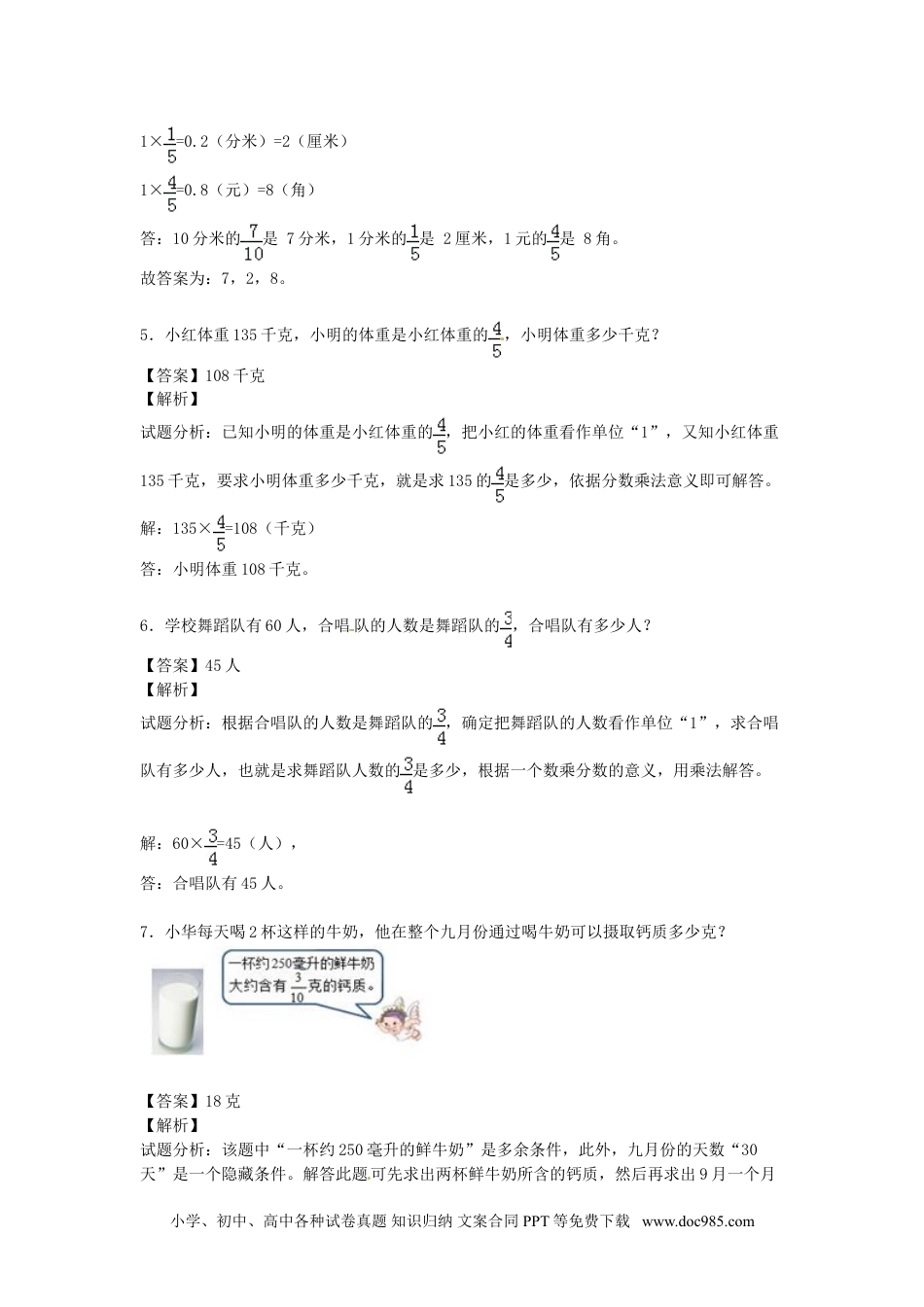 第一单元分数乘法第二课一个数乘分数开心回顾1.一块长方形菜地,长20米,宽是长的,求这块菜地面积的算式是()。A.20×B.20×+20C.20××20D.20×(1+)×2【答案】C【解析】解:将计算问题与几何图形的面积计算相结合,通过练习提升学生综合运用知识的能力。分析中应突出分步骤解答的思路,先求出宽,再根据公式计算面积。2.的结果是。【答案】6【解析】试题分析:一个分数乘整数的计算法则,用分子与整数相乘的积作分子,分母不变,能约分的先约分就比较简便。解:===6;故答案为:6。3.一辆小汽车每小时行54千米,小时行千米。【答案】45【解析】试题分析:依据路程=速度×时间即可解答。解:54×=45(千米),答:小时行45千米,故答案为:45。4.10分米的是分米,1分米的是厘米,1元的是角。【答案】7,2,8【解析】试题分析:根据一个数乘分数的意义:求这个数的几分之几是多少,用乘法解答。解:10×=7(分米)小学、初中、高中各种试卷真题知识归纳文案合同PPT等免费下载www.doc985.com1×=0.2(分米)=2(厘米)1×=0.8(元)=8(角)答:10分米的是7分米,1分米的是2厘米,1元的是8角。故答案为:7,2,8。5.小红体重135千克,小明的体重是小红体重的,小明体重多少千克?[来源:学.科.网Z.X.X.K]【答案】108千克【解析】试题分析:已知小明的体重是小红体重的,把小红的体重看作单位“1”,又知小红体重135千克,要求小明体重多少千克,就是求135的是多少,依据分数乘法意义即可解答。解:135×=108(千克)答:小明体重108千克。6.学校舞蹈队有60人,合唱队的人数是舞蹈队的,合唱队有多少人?【答案】45人【解析】试题分析:根据合唱队的人数是舞蹈队的,确定把舞蹈队的人数看作单位“1”,求合唱队有多少人,也就是求舞蹈队人数的是多少,根据一个数乘分数的意义,用乘法解答。[来源:学+科+网]解:60×=45(人),答:合唱队有45人。7.小华每天喝2杯这样的牛奶,他在整个九月份通过喝牛奶可以摄取钙质多少克?【答案】18克【解析】试题分析:该题中“一杯约250毫升的鲜牛奶”是多余条件,此外,九月份的天数“30天”是一个隐藏条件。解答此题可先求出两杯鲜牛奶所含的钙质,然后再求出9月一个月小学、初中、高中各种试卷真题知识归纳文案合同PPT等免费下载www.doc985.com通过喝牛奶可以摄取钙质。解:18(克)答:他在整个九月份通过喝牛奶可以摄取钙质18克。课前导学学习目标1.使学生理解一个数乘分数的意义,掌握分数乘以分数的计算法则。2.学会分数乘分数的简便计算。3.通过一个数乘以分数应用的广泛性事例,对学生进行学习目的性教育,激发学生学习动机和兴趣。知识讲解【例题1】请把×在图中用斜线表示。【答案】【解析】试题分析:把长方形平均分成了6份,先用斜线表示出其中的5份,再把这5份平均分成3份,用斜线表示出其中的2份即可。[来源:学§科§网Z§X§X§K]解:根据分析可得:×【难度】较难小学、初中、高中各种试卷真题知识归纳文案合同PPT等免费下载www.doc985.com【例题2】一个正方形的边长是分米,它的周长是分米.面积是平方分米。【答案】3;【解析】试题分析:正方形的周长=边长×4,正方形的面积=边长×边长,据此代入数据即可解答。解:×4=3(分米)×=(平方分米)答:正方形的周长是3分米,面积是平方分米。故答案为:3;。【难度】容易新知总结1.分数乘分数的意义就是求一个数的几分之几是多少。2.分数乘分数的运算法则是:分数与分数相乘,用两个分数的分子与分子相乘,分母与分母相乘,用分子相乘的积做分子,分母相乘的积做分母。(分子乘分子,分母乘分母)3.积与因数的关系:一个数(0除外)乘大于1的数,积大于这个数。a×b=c,当b>1时,c>a。一个数(0除外)乘小于1的数,积小于这个数。a×b=c,当b<1时,c<a(b≠0)。一个数(0除外)乘等于1的数,积等于这个数。a×b=c,当b=1时,c=a。(在进行因数与积的大小比较时,要注意因数为0时的特殊情况。)注意:(1)如果分数乘法算式中含有带分数,要先把带分数化成假分数再计算。(2)分数化简的方法是:分子、分母同时除以它们的最大公因数。(3)在乘的过程中约分,是把分子、分...